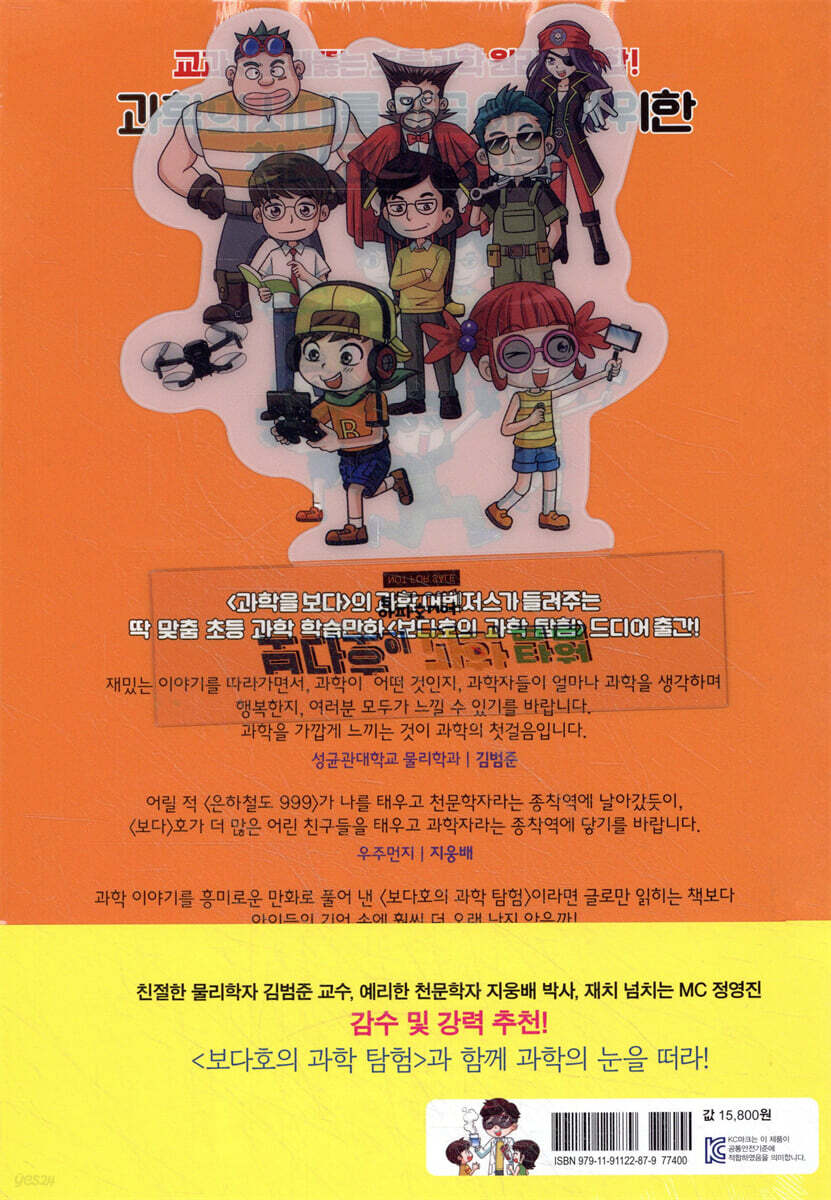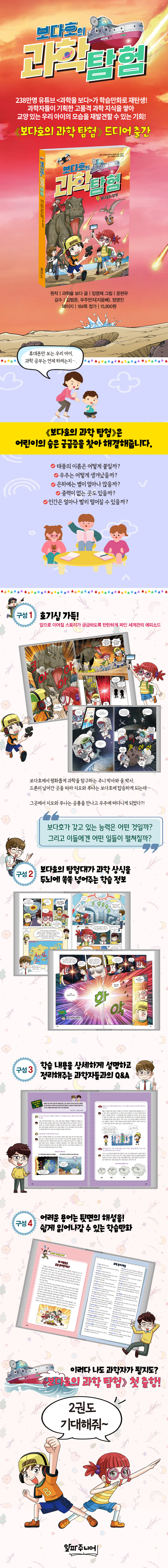 《초등 과학 보다탐험대》의 학습 구조는 ‘22 개정 과학 교육과정’의 방향에 맞추어 기초과학 주제 하나하나의 원리를 발견하고 이해하며 스스로 생활에 적용할 수 있는 체험 모델형 스토리 구조입니다. 또한 《초등 과학 보다탐험대》는 물리, 화학, 우주, 생물 등 분야를 나누고 제한하는 학습이 아니라 우주와 물리가 이어지고, 화학과 생물이 연결되는 통합과 융합의 시리즈 구성입니다. 따라서 한 권 한 권 시리즈가 더해질수록 초등 독자들은 교과서에 갇힌 과학이 아닌 교과서를 넘어 생활 속에서 과학을 깊고 넓게 이해하게 될 것입니다. 「과학을 보다」 출연 캐릭터와 떠나는 흥미진진 과학 모험 《초등 과학 보다탐험대》는 모험과 상상이 가득한 과학 SF 어드벤처입니다. 가상현실을 통해 과학의 힘을 체험할 수 있는 시스템을 연구 중인 주니 박사(김범준)와 웅 박사(지웅배)의 연구선 ‘보다’호. 이곳에 어린이 유튜버 루나와 호기심 넘치는 조종사 지망생 지오가 뛰어들면서 모험이 시작됩니다! ‘보다’호의 책임자이자 연구소 운영자인 진 소장(정영진)이 엉뚱한 실수를 해 지질 시대에 떨어지는데…. 아이들은 예기치 않은 기계 오류로 공룡에 쫓기며 무모한 도전을 하다가 달까지 다녀오며 아이들은 조금씩 과학에 눈을 뜨게 됩니다. 한편, 주니 박사와 웅 박사의 뛰어난 과학 성과를 탐내는 닥터 매드 일당. 닥터 매드는 똑똑하지만 덤벙대는 말괄량이 해적 픽셀과 머리 보다는 힘으로 모든 것을 해결하는 과격한 해적 덤프리를 데리고 서서히 ‘보다’호로 다가온다. 과연 닥터 매드의 진짜 목적은 무엇일까요? |