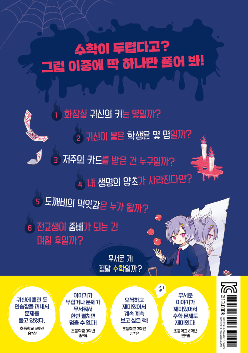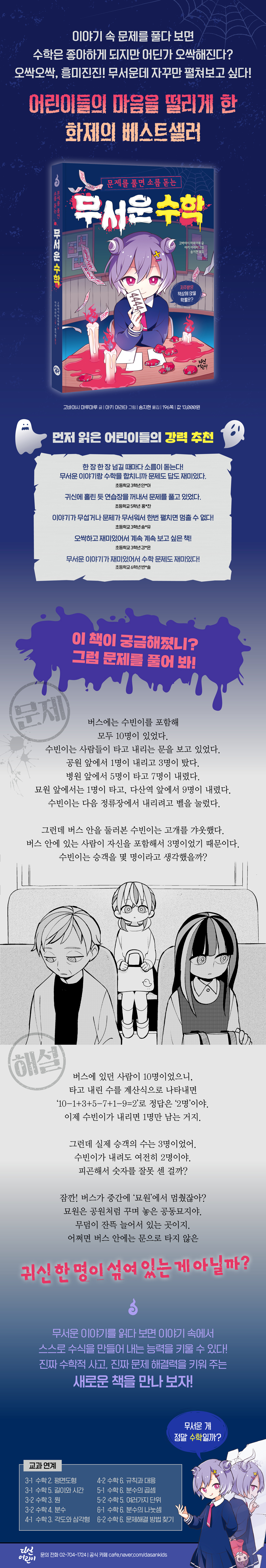 오싹오싹, 흥미진진 푹 빠져서 읽고 또 읽을 이야기책! 무서운 이야기는 언제, 어디에서나 존재해 왔고, 오래도록 많은 이들에게 사랑받아 왔다. 특히 어린이들은 언제나 무서운 이야기의 열렬한 팬층이다. 지금도 호러 애니메이션 「신비 아파트」, 이해하면 무서운 이야기 「흔한 남매 이무기」 시리즈 등 오싹한 이야기는 아이들에게 많은 사랑을 받고 있다. 그리고 오늘, 새롭게 어린이들을 사로잡을 특색 있는 무서운 이야기가 출판되었다. 우리가 일상에서 마주하는 학교나 집과 같은 공간에서 벌어지는 이야기는 으스스하면서도 어쩐지 유머러스하다. 짧은 이야기를 하나둘 읽다 보면 금세 푹 빠져들어 읽게 된다. 몸은 소름이 돋는데, 입은 웃고 있고, 머리로는 수학 문제를 풀고 있는 신비한 경험을 하게 될 것이다. 귀신에 홀린 듯 수학 문제를 풀고 있었다! 재미있는 이야기 속에서 문제를 해결하다 보면 사고력이 쑥쑥 오르는 학습 교양서! 초등학교 3학년이 넘어가면서 아이들은 수학을 어렵게 느끼고 멀리하기 시작한다. 수식은 복잡해지고, 문제는 길어지고… 더 이상 수학에서 재미를 찾지 못하는 것이다. 초등학교 때 느끼는 수학에 대한 인상이 평생을 좌우하는데, 억지로 하는 수학 공부라면 제대로 방향을 잡을 수도, 오래 함께할 수 없다. 특히 서술형 문제와 풀이 과정에 대한 학습이 늘어나면서 아이들은 문제에 대한 이해도 하지 못하는 경우가 많다. 긴 문장 속에서 식을 어떻게 세워야 하는지 모른다면 개념을 알아도 문제를 풀 수가 없다. 그러면 수학에 대한 흥미는 더욱 떨어지는 악순환이 반복된다. 《무서운 수학》은 이야기나 문장 속에서 수식을 뽑아내는 방법을 자연스럽게 알게 한다. 이는 수학적 사고가 필요한 일인데, 오싹한 이야기와 수학적 해결 과정을 반복해서 읽으면서 자연스럽게 학습하게 되는 것이다. 이 과정을 반복하다 보면 점차 식을 세우는 능력이 향상된다. 수학적 학습과 이야기의 즐거움이 공존하는 《무서운 수학》으로 문제 해결력과 논리적 사고력을 키워 보자. 친구, 가족, 선생님과 함께 문제를 내고 맞힌다! 읽고 나누며 수학 실력이 쑥쑥 성장하는 책! 공부는 문제를 푸는 데서 끝나는 것이 아니라, 다른 사람에게 설명할 수 있어야 완성된다는 말을 들어본 적이 있을 것이다. 제대로 알지 않으면 설명할 수 없다는 뜻이기도 하고, 풀이 과정을 다른 이에게 전달하면서 나 또한 더욱 확실히 알게 된다는 말이기도 하다. 《무서운 수학》은 이야기가 짧기 때문에 먼저 빨리 읽고 다른 이에게 문제를 내기 좋은 구조로 되어 있다. 가장 무서운 문제, 또는 가장 자신 있는 문제를 주변 친구나 부모님에게 내 보자. 으스스한 목소리로 실감 나게 읽어 주면, 효과는 배가 될 것이다. |