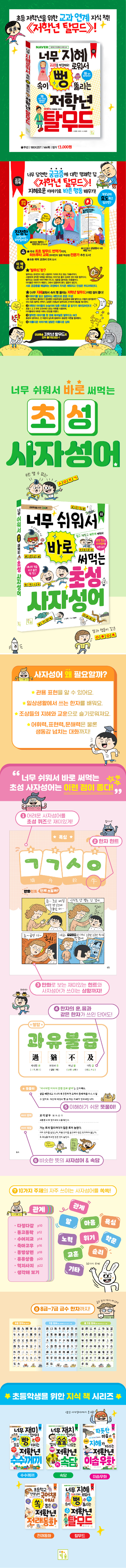 ‘탈무드’란? 탈무드 이야기는 유대인이 어린 시절부터 가까이 두고 읽는 유대인의 ‘지혜서’이다. ‘다른 사람에게 피해 주지 않기’, ‘말조심하기’, ‘스스로 강해지기’ 등 사람에게 유익한 덕목을 재미있는 이야기로 풀어 강조한 것이 바로 탈무드다. 탈무드는 단순한 이야기책이 아니다. 질문을 끌어내는 마중물이다. 쉬운 이야기다 보니 아이들은 이야기에 집중하게 되고, 깊이 생각하게 되고, 그러다 궁금증이 생긴다. 궁금증을 풀고자 서로 질문하고, 지식을 넓혀 가며, 다른 사람의 생각을 읽게 되고, 이 세상의 변하지 않는 가치를 배워 나간다. 저학년 아이들에게 왜 탈무드가 필요할까? 저학년 생활은 스스로 판단하고 행동하는 것을 필수적으로 연습해야 하는 시기입니다. 친구, 선생님 등과의 관계는 넓어지는데, 그 안에 일어나는 문제는 스스로 책임질 줄 알아야 합니다. 왜 말조심이 중요한지, 왜 다른 사람을 배려해야 하는지, 옳고 그름을 판단하기 어려울 땐 어떻게 해야 하는지 등 아이가 처한 상황에서 최대한 올바르게 행동할 수 있는 지혜를 제공하는 것! 그 지혜를 아이들이 이해하기 쉽게 풀어낸 것! 바로 탈무드입니다. 『너무 지혜로워서 속이 뻥 뚫리는 저학년 탈무드』는 이런 점이 좋다! 1) 이야기를 읽고 질문하는 패턴으로 본문 구성 왜 굳이 질문을 넣었을까? 탈무드를 제대로 활용하려면 질문을 빠뜨릴 수 없기 때문입니다. 너무 당연해서 물어보기 창피했던 초등학생의 궁금증에 대해 탈무드는 어떻게 생각할까? 어떤 게 탈무드다운 생각일까? 어떻게 행동하는 것이 지혜로운 방법일까? 국내 최초 탈무드 번역가, 김정완 선생님이 탈무드에 근거하여 해답을 제시했습니다. 2) 글 읽기가 재미있어진다! 저학년 아이들의 눈높이에 맞춘 어휘로 이야기를 풀었습니다. 초등 1, 2, 3 국어 교과서에 나오는 어휘를 사용하여, 아이들에게 어려운 어휘나 문장을 피했습니다. 3) 짤막한 이야기를 한 권에 욱여넣은 탈무드는 NO! 충분히 생각하고, 긴 여운이 남도록 동화마다 충분한 지면을 할애했습니다. 4) 아름다운 이야기에 걸맞은 아름다운 삽화 『너무 쉬워서 바로 써먹는 초성 사자성어』 는 총 10가지 주제 관계, 말, 마음, 욕심, 노력, 위기, 학문, 교훈, 순리, 많이 쓰이는 성어로 나누어 100개 이상의 사자성어를 한 권에 담았습니다. 어려울 수 있는 사자성어를 초성 퀴즈와 만화 힌트로 재미있고 쉽게 배울 수 있습니다. 아이들의 눈높이에 맞춘 만화는 사자성어를 사용하는 상황을 보여 주어 실생활에서 쓰기 쉽게 도와줍니다. 『너무 쉬워서 바로 써먹는 초성 사자성어』는 이런 점이 좋다! 1) 어려운 사자성어를 초성 퀴즈로 재미있게! 한자로 된 어려운 사자성어를 쉽게 배울 수 있도록 초성 퀴즈로 준비했습니다. 초성 퀴즈를 풀며 사자성어와 친해집니다. 2) 만화로 보는 재미있는 힌트와 쓰이는 상황까지! 초성으로 먼저 보고 만화 힌트를 보면, 만화로 사자성어가 쓰이는 상황을 보여 주어 쉽게 알 수 있습니다. 3) 사자성어의 한자, 훈음, 같은 한자를 쓴 단어도! 사자성어의 한자와 훈음을 보여 주고, 이 한자와 같은 한자를 쓰는 단어도 알 수 있습니다. 읽기만 해도 어휘력이 쭉쭉 올라갑니다. 4) 이해하기 쉬운 뜻풀이! 초등학생 눈높이에 맞춰 이해하기 쉽게 사자성어의 뜻을 풀어 썼습니다. 5) 배운 사자성어와 비슷한 성어 또는 속담도! 본문에 있는 사자성어뿐만 아니라 이와 비슷한 뜻을 가진 다른 사자성어 또는 비슷한 뜻을 가진 속담도 볼 수 있습니다. 다양한 언어 표현력을 키웁니다. 6) 8급~7급 한자! 초등학생이 알아 두면 좋은 8급, 준 7급, 7급 한자가 함께 들어 있습니다. 급수 한자를 보며 기초 한자도 알아볼 수 있습니다. |