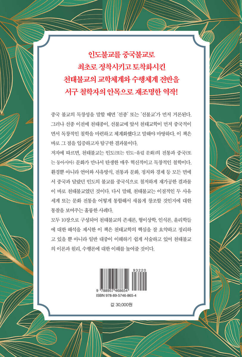 5세기 즈음에 중국에서 토대가 마련된 천태종에서 인도의 불교 전통을 가장 먼저 중국식으로 철저하게 재가공하려 했다. 천태종은 이 두 사유 세계를 창조적인 대화로 끌어들여 그 둘의 아주 다른 요구를 동시에 만족시키는 통합체를 개발했다. 천태종은 인도불교에서 파생된 논쟁과 실천의 방법을 써서 동아시아의 지성사에서 가장 엄밀한 이론적 체계를 만들어냈다. 그리고 그 이상과 형이상학적 결론은 중국 고유의 철학적 전통에 그 뿌리를 두고 있었다. 그 결과로 포괄적인 사유 체계가 탄생했다. 이 사유 체계는 아주 새롭고 드물게 이해되는 그리고 공교롭게도 천오백 년이 지난 뒤에도 여전히 흉내낼 수 없는 독특한 것이었다. 이 책은 모두 10장으로 구성되어 있으며, 천태불교의 존재론, 형이상학, 인식론, 윤리학들에 대한 해석을 제시한다. 이 이론들은 불교의 일반적인 철학적 개념들, 즉 괴로움, 연기법, 무아, 욕망, 공, 본각(本覺), 불성 따위를 천태종 전통에서 독창적으로 적용한 결과물이다. 그리고 그 이론들은 『법화경』의 서사적 혁신에 의해 근본적으로 재조정된 것들인데, 천태종 전통에서 그렇게 한 방식에 대한 해석도 이 책이 제시한다. 저자에 따르면 천태불교는 인도의 전통과 중국 또는 동아시아 문화가 만나서 탄생한 매우 혁신적이고 독창적인 철학이었다. 환경뿐 아니라 언어와 사유방식, 전통과 문화, 정치와 경제 등 모든 면에서 중국과 사뭇 달랐던 인도의 불교를 중국식으로 철저하게 토착화한 결과물이 바로 천태불교였던 것이다. 다시 말해, 천태불교는 이질적인 두 사유 세계 또는 문화 전통을 어떻게 통합해서 새롭게 창조할 것인지에 대한 통찰을 보여주는 훌륭한 사례다. 이 책에서는 난해하게 여겨질 수 있는 천태종의 주요한 관념들과 선례들을 가능한 한 일반인들에게도 생소하지 않은 용어들로 제시하려 했으며, 그 출신이나 배경이 어떠하든 교양 있고 철학적인 독자라면 이해할 수 있도록 썼다. 또 불교사상의 기본적인 전제들 뒤에 있는 논증의 단계들에 대해서, 그리고 공, 이제(二諦), 방편, 보살승, 불성, 본각 등 혁신적인 대승의 개념들에 의해 어떻게 그 전제들이 지지되고 허물어지는지에 대해서도 상세하게 설명한다. 비전문적인 언어 표현을 쓰면서도 최대한 명쾌하게, 또 변증법적으로 엄밀하면서도 직관적으로 이해할 수 있게, 철학적으로 정확하면서도 광범위하게 함축하도록 하려고 했다. 결국, 이 책은 현대의 철학적 반성과 대화에서 핵심이 되는 쟁점들에 공명할 만한 착상들을 끄집어내기 위해서 천태종 전통의 독특한 통찰들을 재구성하려는 과감한 시도라 할 수 있다. 오늘날 전 세계가 동시에 맞닥뜨린 상황, 즉 아주 이질적인 문화들이 서로 접촉하면서 두드러지고 있는 철학적 궁지와 위기 상황에서 참조해야 할 역사적 사례로 적합한 것이 바로 천태불교라는 것이 바로 이 책에서 말하고자 하는 주장이다. 천태불교의 존재론, 형이상학, 인식론, 윤리학들에 대한 다양한 해석을 제시함으로써 천태교학의 핵심을 잘 요약하고 정리하고 있을 뿐 아니라 일반 대중이 이해하기 쉽게 서술하고 있어 천태불교의 이론과 원리, 수행론에 대한 새로운 안목을 제시해줄 것이다. |