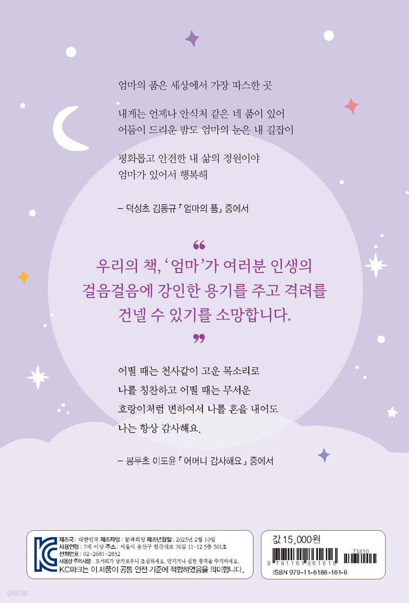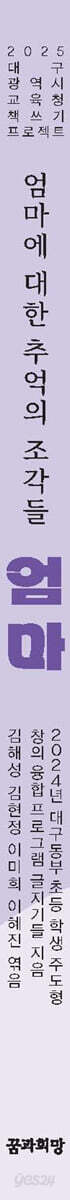 사랑하는 우리 친구들, 다시 만나게 되어 반가워요! ‘엄마’ 하면 어떤 생각이 가장 먼저 떠오르나요? 엄마를 주제로 한 많은 시와 노래, 엄마와 닮은 비유적 표현들이 떠오르지요? ‘엄마’라는 이름은 부를 때마다 마음이 오락가락하는 것 같습니다. 한껏 기뻤다가 울컥 눈물이 나기도 하고, 때로는 보고 싶고 설레기도 합니다. 이처럼 애틋함이 묻어나는 마법의 이름이 바로 ‘엄마’이지요. 여러분들이 엄마를 떠올리며 쓴 글들을 엮어서 이 세상 하나 뿐인 『엄마』라는 책이 세상에 탄생했습니다. 우리 친구들은 이제부터 멋진 작가입니다. 박완서 작가님의 『엄마의 말뚝』에서 딸이 신여성이 되길 바라는 엄마. 이정인 시인의 『남자들의 약속』에서 만난 라라라 잔소리 대장 엄마 늘 곁에서 자신보다 내가 잘 되기만을 소망하는 우리 엄마. 친구들이 쓴 글 한 편 한 편에 등장하는 엄마의 모습에서 ‘우리 엄마’가 떠오르기도 할 것입니다. 왜냐하면 모두 우리가 사랑하는 ‘엄마’의 모습이기 때문입니다. 그런 엄마 덕분에 오늘의 내가 있다는 사실, 꼭 기억하기 바랍니다. 평소 부끄러워 표현하지 못했던 여러분의 마음을 이 책으로 전해 보는 건 어떨까요? 마치 보물찾기를 하듯 친구들의 글에서 엄마를 향한 나의 마음을 대신해 줄 주옥같은 한 문장, 한 문장을 찾아보기 바랍니다. 먼 훗날 이 책을 다시 읽었을 때 2024년 토요일마다 진행된 창의융합 수업 또한 아련한 추억으로 남겠지요. 선생님들은 『엄마』라는 책을 발간한 우리 작가들이 저마다의 꿈을 향해 힘차게 나아갈 수 있기를 응원할게요. 아자! 아자! 파이팅! 2024년 ‘엄마 사랑’ 선생님들 씀 |