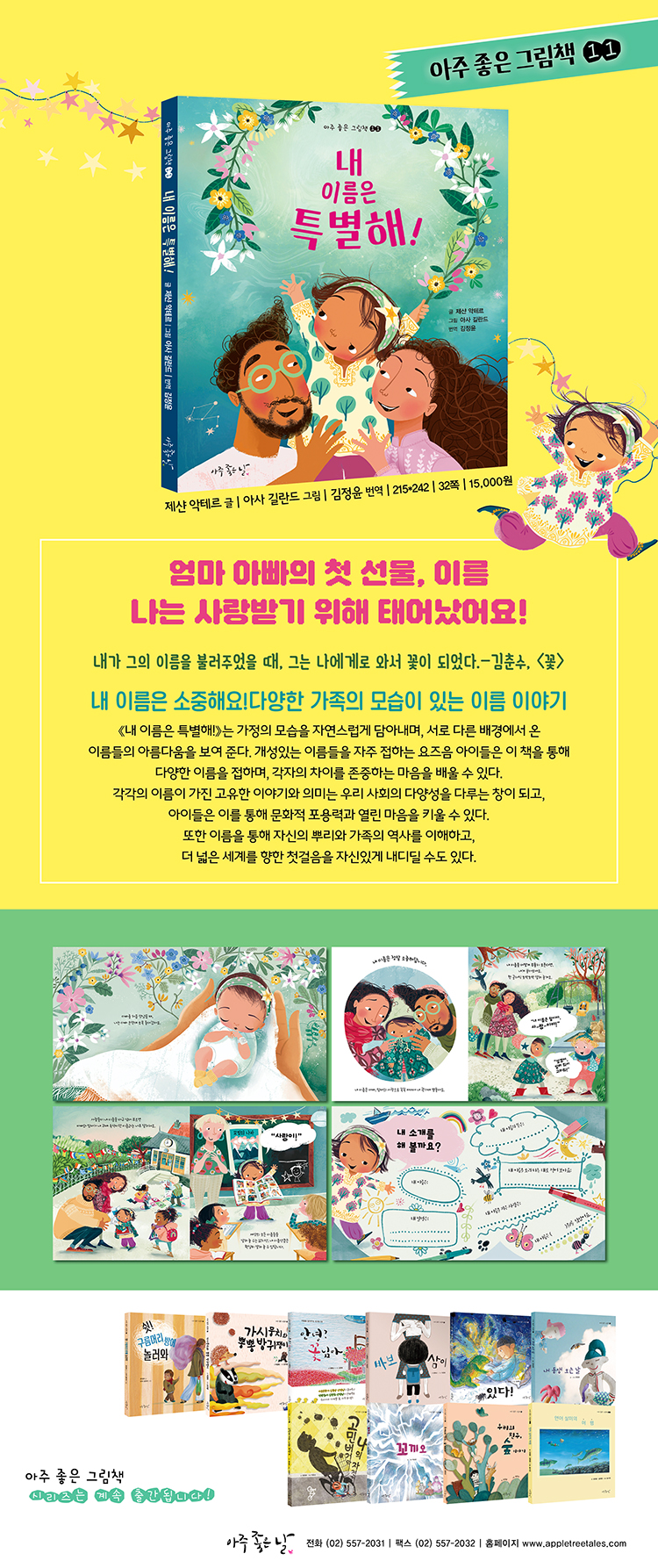 《내 이름은 특별해!》는 가정의 모습을 자연스럽게 담아내며, 서로 다른 배경에서 온 이름들의 아름다움을 보여 준다. 개성있는 이름들을 자주 접하는 요즈음 아이들은 이 책을 통해 다양한 이름을 접하며, 각자의 차이를 존중하는 마음을 배울 수 있다. 각각의 이름이 가진 고유한 이야기와 의미는 우리 사회의 다양성을 다루는 창이 되고, 아이들은 이를 통해 문화적 포용력과 열린 마음을 키울 수 있다. 또한 이름을 통해 자신의 뿌리와 가족의 역사를 이해하고, 더 넓은 세계를 향한 첫걸음을 자신있게 내디딜 수도 있다. 아사 길란드의 따뜻한 색감과 사랑스러운 일러스트레이션은 이야기에 깊이를 더한다. 특히 등장인물들의 표정과 감정을 섬세하게 표현하여, 아이들이 이야기에 더욱 깊이 몰입할 수 있도록 돕는다. 화면마다 풍성하게 펼쳐지는 다채로운 색감과 디테일은 이름이 가진 다양성과 아름다움을 시각적으로 또한 효과적으로 전달한다. 가족과 함께 나누는 나의 이름 이야기 책의 말미에는 독자가 직접 자신의 이름 이야기를 기록할 수 있는 특별한 페이지를 마련했다. ‘내 이름의 뜻은?’, ‘내 이름을 지은 사람은?’ 등의 질문에 답하며 아이들은 자신의 이름에 담긴 의미를 발견하고, 부모님과 함께 이름에 얽힌 추억을 나누며 자신의 소중함을 다시 한 번 느낄 수 있다. 금세 익숙해진 우리 아이의 이름을 새롭게 바라보는 경험을 통해, 부모는 아이에게 이름을 지어준 순간의 설렘과 기쁨을 다시 한번 떠올리고, 독자는 자신의 이름이 얼마나 특별한 의미를 가졌는지 깨닫게 된다면 《내 이름은 특별해!》가 전달하고자 한 메시지가 비로소 완성될 것이다. 그래서 《내 이름은 특별해!》는 이름이라는 소재를 통해 가족의 사랑, 자아 존중감, 문화적 포용성을 아우르는 의미 있는 메시지를 전달하는 소중한 그림책이다. |