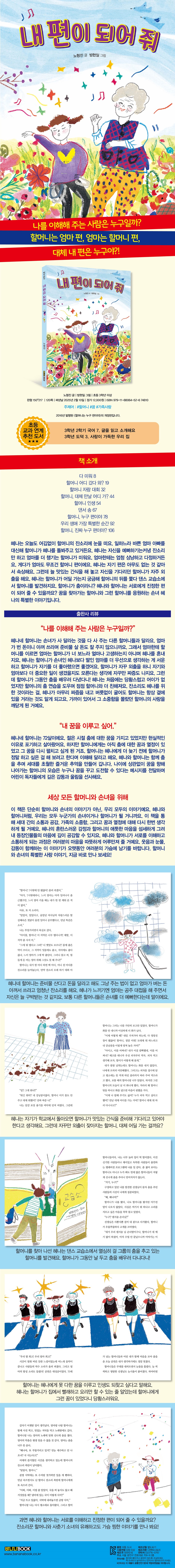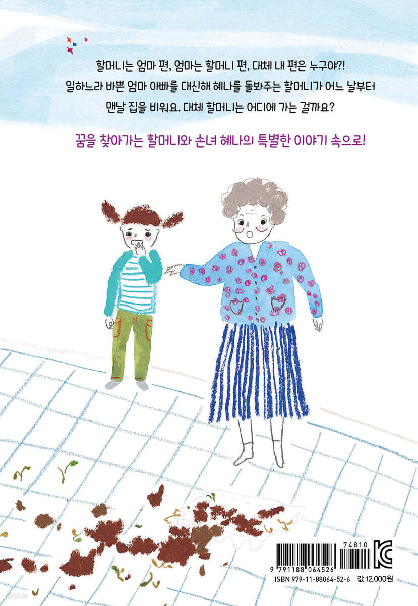 --- 본문 중에서 혜나는 자기가 학교에서 돌아오면 할머니가 맛있는 간식을 준비해 기다리고 있어야 한다고 생각해요. 그런데 자꾸만 외출이 잦아지는 할머니, 대체 어딜 가는 걸까요? --- 본문 중에서 할머니를 찾아 나선 혜나는 댄스 교습소에서 열심히 걸 그룹의 춤을 추고 있는 할머니를 발견해요. 할머니가 그동안 날 두고 춤을 배우러 다니다니! --- 본문 중에서 할머니는 혜나에게 못 다한 꿈을 이루고 인생도 되찾고 싶다고 말해요. 혜나는 할머니가 집에서 빨래하고 요리만 할 수 있는 줄 알았는데 할머니에게 그런 꿈이 있었다니 당황스러워요. --- 본문 중에서 과연 혜나와 할머니는 서로를 이해하고 진정한 편이 되어 줄 수 있을까요? 잔소리꾼 할머니와 사춘기 소녀의 유쾌하고도 가슴 찡한 이야기를 만나 봐요! --- 본문 중에서 |