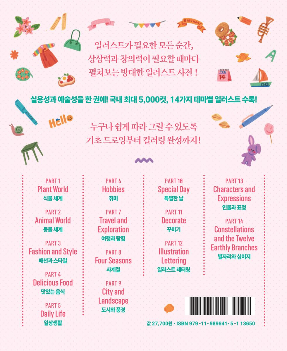 재료와 그림 그림을 그리는 순서 연필 드로잉 연습 PART 1 자연에서 만나는 일상_ Everyday Life in Nature PART 2 동물 세계_Animal World PART 3 패션과 스타일_Fashion and Style PART 4 맛있는 일상_ A Delicious Everyday Life PART 5 일상생활_Daily Life PART 6 취미 생활의 즐거움_ The Joy of Hobbies PART 7 여행과 탐험_Travel and Exploration PART 8 사계절_Four Seasons PART 9 도시와 자연_City and Nature PART 10 특별한 날_Special Occasions PART 11 꾸미기_ Decoration PART 12 일러스트 레터링_ Illustration Lettering PART 13 인물과 감정_People and Emotions PART 14 별자리와 십이지_ Constellations and the Twelve Earthly Branches 책 속 부록 : 일러스트로 만드는 소품 |