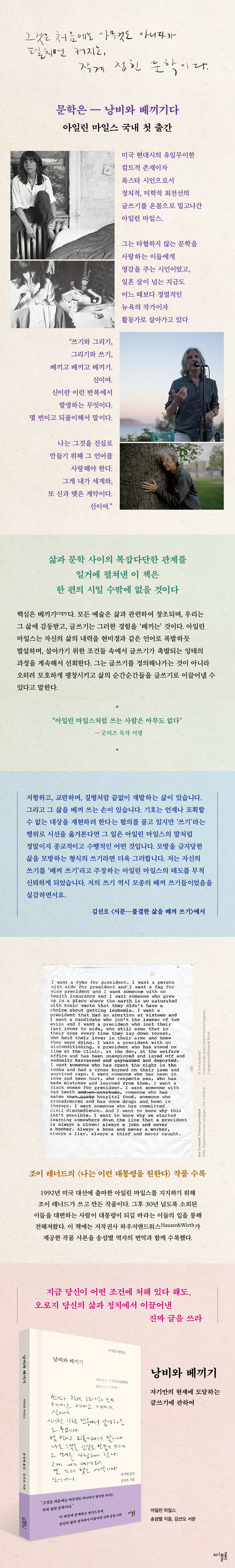 유일무이한 컬트적 존재이자 록스타 시인 아일린 마일스의 국내 첫 책 출간 문학은 낭비와 베끼기다! 이 세상에 존재하는 방식으로써, 당신의 삶과 정치에서 이끌어낸 진짜 글을 쓰라 미국 현대시의 유일무이한 컬트적 존재이자 ‘록스타’ 시인으로서 정치적, 미학적 최전선의 글쓰기를 온몸으로 밀고나간 아일린 마일스의 국내 첫 책이 출간되었다. 그는 반세기 가까운 전방위 글쓰기를 통해 타협하지 않는 문학을 사랑하는 이들에게 영감을 주는 시인이었고, 일흔 살이 넘는 지금도 어느 때보다 정열적인 뉴욕의 작가이자 활동가로 살아가고 있다. 1992년에는 노동계급 퀴어예술가로서 빌 클린턴과 조지 H. W. 부시가 맞붙었던 대선에 뛰어들어 미국 전역에 적지 않은 파문을 일으켰고, 당시 아일린 마일스의 출마에 응답하는 헌시 「나는 이런 대통령을 원한다I Want a President」(조이 레너드)는 삼십 년이 지난 현재까지도 전 세계 진보적 예술가들과 퀴어 커뮤니티의 열렬한 지지를 받고 있다. 핵심은 베끼기copy다. 모든 예술은 삶과 관련하여 창조되며, 우리는 그 삶에 감동받고, 글쓰기는 그러한 경험을 ‘베끼는 것’이다. 이는 어떤 존재를 원래의 장소에서 그대로 다른 맥락과 조건으로 옮겨옴으로써 생성되는 낯섦의 미학, 혹은 데페이즈망(전치)의 기법으로도 볼 수 있다. 마일스는 이러한 글쓰기를 항우울제나 유산소 운동처럼 삶을 획기적으로 바꿔줄 도구가 아니라, 끝없이 주문을 읊는 하나의 수행으로 지속한다. 자본으로 환원되지 않는, 순전한 시간 낭비로서 자기 삶과 우리를 둘러싼 세계를 베끼고 그 허위를 폭로하는 일이야말로 문학적 구원의 길이 된다. 그러므로 아일린 마일스의 글쓰기 스타일은 정치적 조건들과 밀접하면서도, ‘문학은 지극히 심오한 시간 낭비’일 뿐이라는 상반된 태도 사이에 존재한다. 그 사이에서 명멸하는 광증과 같은 글쓰기는 가난한 이들을 밀쳐대며 나아가는 대도시 뉴욕의 실체를 은유로서 그려낸다. 그리고 ‘대도시 뉴욕’은 ‘지금 여기의 도시’에서 반복되고 변주된다. 한국어판에는 저자와 자신을 기꺼이 ‘우리’라고 부르며 ‘대안적인 장소의 발명가’들이라고 밝힌 김선오 시인의 서문을 수록했다. 책 뒤편에는 조이 레너드의 헌시 「나는 이런 대통령을 원한다」 원문 도판과 번역을 실었다. 어떤 작품은 어수선하고 불결한 세계들이 모인 공공건물이다 작품을 끝내는 순간 여기 온 사람들의 것이니까 작가가 가장 먼저 그 속으로 사라지겠지만, 그다음은 독자들의 차례다 리베카 솔닛, 캐시 박 홍 등 유수의 작가들이 수상자로 이름을 올렸던 예일대학교 제정 윈덤캠벨문학상의 2019년 시상식에 아일린 마일스가 기조연설자로 나섰다. 그는 패티 스미스, 칼 오베 크나우스고르 등이 ‘나는 왜 쓰는가’라는 주제로 이어왔던 이 강연에서 사십 년 넘도록 살아온 아파트 이야기로 말문을 연다. 그를 작가로 만들어준 것은 다름 아닌 뉴욕의 아파트 임대 정책이라며, 자신의 글쓰기가 가능할 수 있었던 정치적, 사회적 조건들을 특유의 조소와 유머로 펼쳐 보인다. 자기 삶의 내력을 현미경과 같은 언어로 폭발하듯 발설하며, 번뜩이는 시적 문장들로 삶의 순간들이 글로 체화되는 과정을 비유한다. 이를 통해 작가의 마음은 어떤 조건에서 작동하는지, 세상에 존재하는 방식으로써 글쓰기란 무엇인지 파고든다. 이 책의 아름다움은 이러한 포스트모던적 글쓰기 스타일의 해부에 그치지 않는다. 아일린 마일스는 삶의 조건들에서 글쓰기가 촉발되는 잉태의 과정을 계속해서 선회하며, 자신의 글쓰기를 정의해나가는 것이 아니라 오히려 모호하게 팽창시키고 삶의 순간순간들을 글쓰기로 이끌어낼 수 있다고 말한다. 그 순간들은 대체로 가난한 사람들, 대안적인 사람들, 엉망진창인 사람들과 함께 사는 장소에서 이루어지는데 이들이야말로 삶의 목적을 가시화시키기 때문이다. 그러니 아일린 마일스 글쓰기의 형식이 ‘베끼기’에 있다면, 그 동력은 ‘불결하고 변칙적인 반사회적인 존재’ 자체로서 ‘표백된 정상성’의 사회에 계속해서 뛰어들려는, 그가 세계를 사랑하는 방식에 있다. “노동 계급 출신의 퀴어 예술가와 같은 반사회적 존재들의 불결함과 변칙성은 표백된 정상성 자본의 옆자리에서 더욱 역동적으로 가시화되기 마련입니다. 낙차에는 에너지가 있습니다. 시와 예술이 할 수 있는 일은 이러한 낙차를 동력으로 세계에 투신하고, 유희하며, 우리(‘노동 계급 출신의 퀴어 예술가’에 대한 거리 있는 접근처럼 글을 쓰려다가 실수로 우리라고 말해버렸지만 지우지 않겠습니다)를 위한 놀이터를 재창조하는 것입니다. 박탈의 경험은 언제나 공간을 전제로 할 뿐 아니라 공간을 만들어냅니다. 우리(또!)가 대안적인 장소의 발명가들이라는 사실은 언제나 자랑스러운 일입니다.”_「서문―불결한 삶을 베껴 쓰기」(김선오)에서 삶과 문학 사이의 복잡다단한 관계를 일거에 펼쳐낸 이 책은 한 편의 시일 수밖에 없을 것이다 이 책은 전체가 한 편의 시이기도 하다. 순순히 해독을 허락하지 않지만, 간결한 메시지로 통합할 수 없는 삶과 문학 사이의 