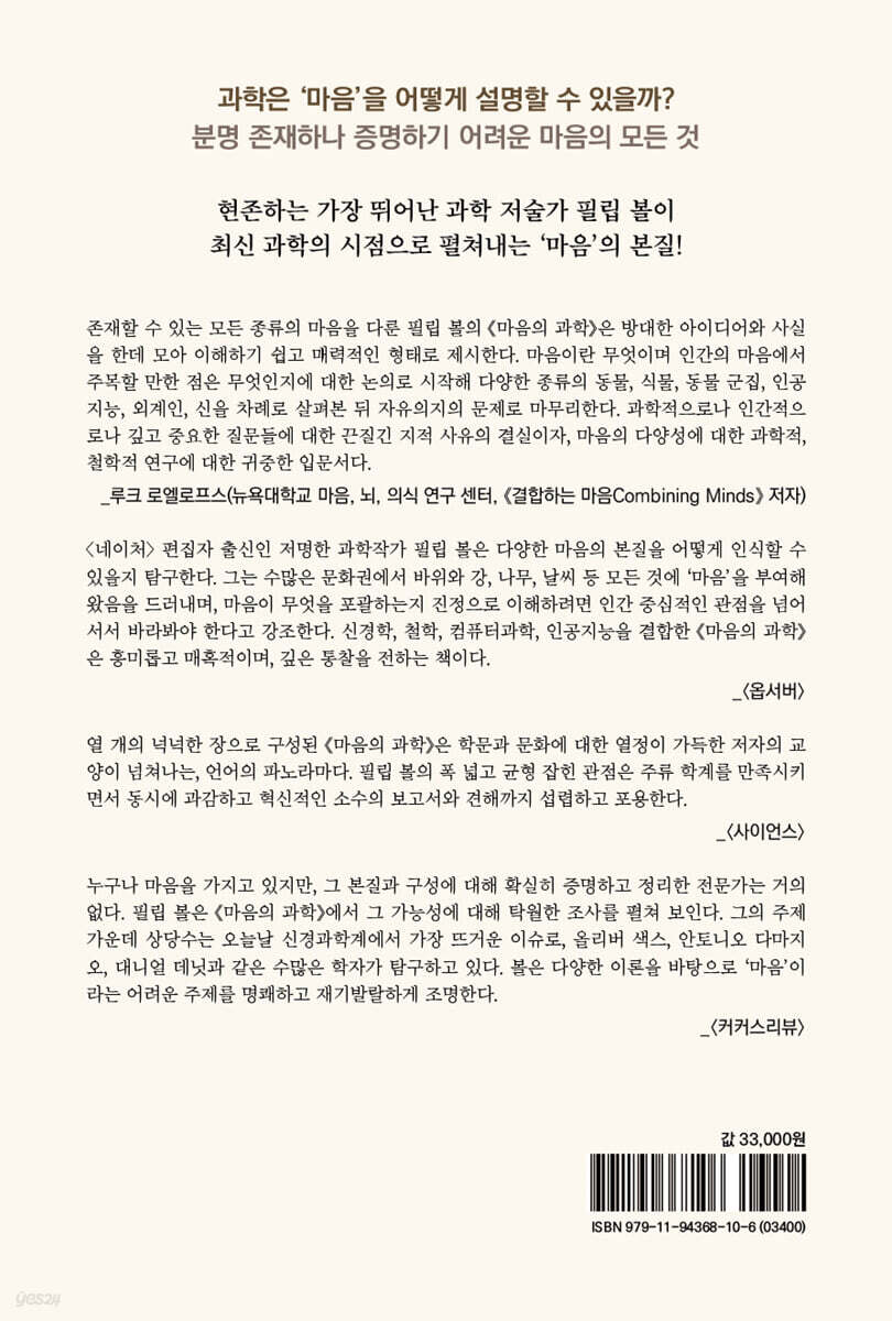 존재할 수 있는 모든 종류의 마음을 다룬 필립 볼의 『마음의 과학』은 방대한 아이디어와 사실을 한데 모아 이해하기 쉽고 매력적인 형태로 제시한다. 마음이란 무엇이며 인간의 마음에서 주목할 만한 점은 무엇인지에 대한 논의로 시작해 다양한 종류의 동물, 식물, 동물 군집, 인공지능, 외계인, 신을 차례로 살펴본 뒤 자유의지의 문제로 마무리한다. 과학적으로나 인간적으로나 깊고 중요한 질문들에 대한 끈질긴 지적 사유의 결실이자, 마음의 다양성에 대한 과학적, 철학적 연구에 대한 귀중한 입문서다. - 루크 로엘로프스 (뉴욕대학교 마음, 뇌, 의식 연구 센터, 《결합하는 마음Combining Minds》 저자)