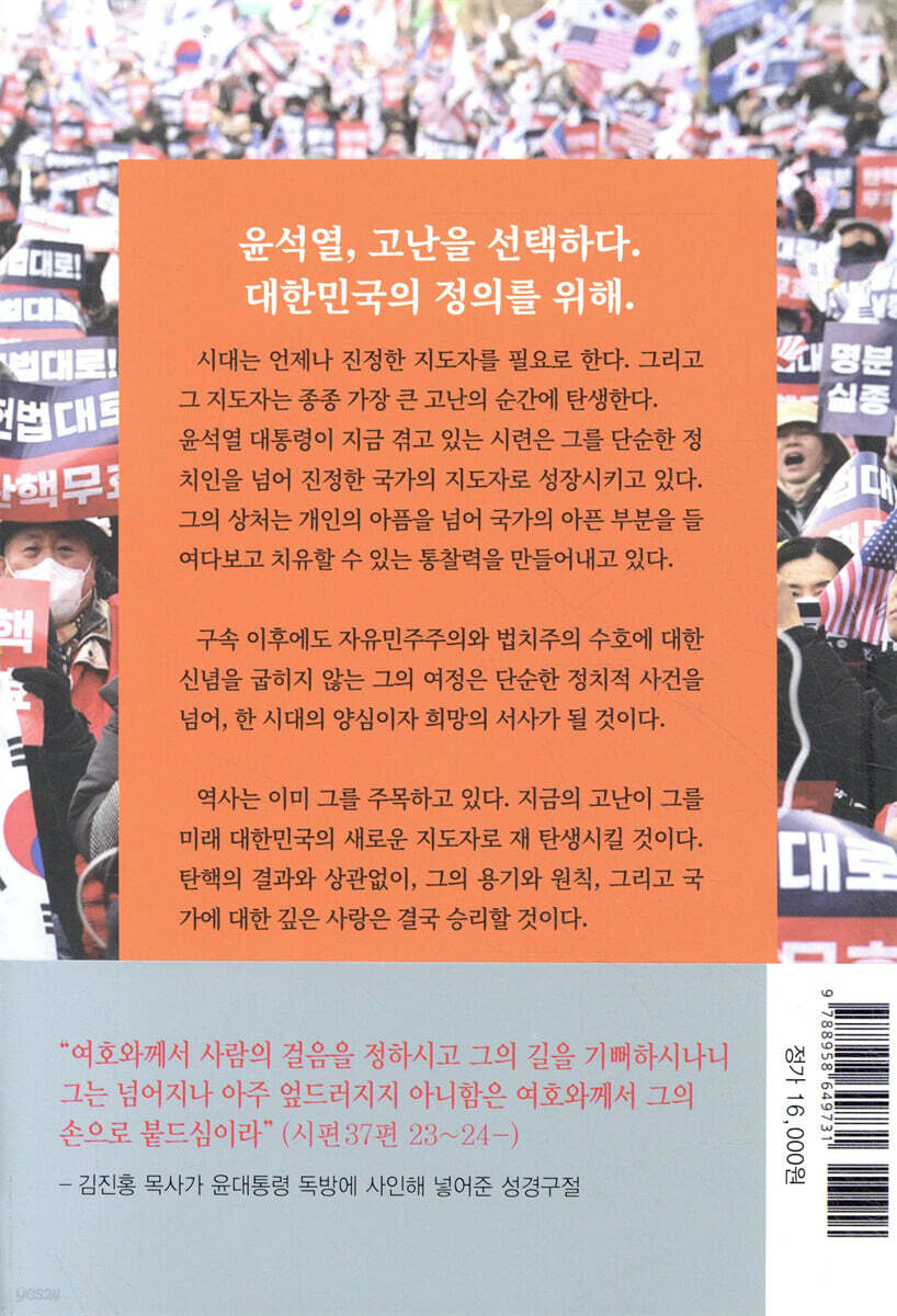 이 책은 증언이자 기록이다. 자유민주주의의 최전선에서, 혼돈과 위기 속에서도 흔들림 없이 법치를 수호하는 한 인물의 여정을 담은 역사적 기록이다. 대한민국이 직면한 이 탄핵 정국은 단순한 정치적 사건이 아니다. 이는 법치와 헌법 정신이 무너질 위기에서, 우리가 진정 어떤 가치를 지켜 내야 하는지를 묻는 시대적 시험대다. 어떤 이들은 이 기록에 불편함을 느낄 수 있다. 그러나 지금은 개인적 호불호를 논할 때가 아니다. 수십 년간 얽히고설킨 정치적 이해관계와 숨겨진 권력의 민낯이 적나라하게 드러나고 있다. 낡고 곪은 장판을 걷어낸 자리처럼, 그 이면에 가려진 진실이 백일하에 드러나고 있다. 2024년 12월 3일, 대한민국은 역사적 시험대에 올랐다. 왜 대통령은 스스로 십자가의 길을 선택했는가? 세계 유례없는 현직 대통령의 체포와 구속을 감내하며, 골고다를 향해 걸어가는 그의 발걸음에서 우리는 무엇을 목도하고 있는가? 최고의 자리에서 가장 낮은 곳으로, 그는 무엇을 위해 내려섰는가? 강도와 도둑 사이에서 십자가에 못 박혔던 것처럼, 단 15자의 구속영장 발부 사유로 잡범 취급을 받는 대통령의 모습에서 우리는 시대의 예수를 본다. "하나님의 것은 하나님에게, 카이사르의 것은 카이사르에게." 예수의 명쾌한 가르침처럼, 지금 우리 앞의 혼돈 역시 '대한민국과 반대한민국'으 로 갈라지고 있다. 법과 정의의 이름으로 포장된 그간의 행위들이 오히려 헌법 가치를 훼손하고, 공정과 정의를 왜곡해 왔음이 밝혀지고 있다. 이 혼돈의 한가운데서 윤석열 대통령은 홀로 최전선에 서있다. 그의 목소리는 단순한 자기 변호가 아니다. 그것은 대한민국 자유민주주의를 수호하기 위한 역사적 변론이며, 흔들리는 대한민국의 나침반이자, 위태로운 법치의 균형을 바로잡으려는 절박한 외침이다. 이 책은 단순한 사건의 나열이 아니다. 윤석열 대통령의 언행에 담긴 깊은 의미를 재조명하고, 우리가 추구해야 할 진정한 민주주의의 방향을 성찰하는 여정이다. 이 전대미문의 위기 앞에서, 대한민국은 무엇을 지키고 무엇을 바로잡아야 할 것인가? |