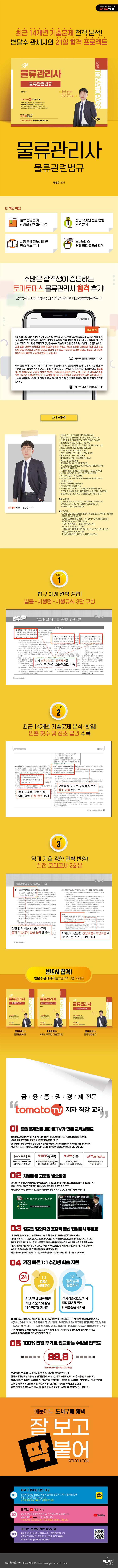 ‘토마토패스 물류관리사 물류관련법규’는 2012년 관세사 시험 최연소 합격자인 변달수 관세사가 물류관리사 자격시험 합격을 위하여 집필한 도서입니다. 오로지 수험생의 입장에서 물류관련법규를 공부하며 법상 상위체계와 하위체계를 구분하여 법의 체계를 이해하면서 공부할 수 있도록 구성하였습니다.