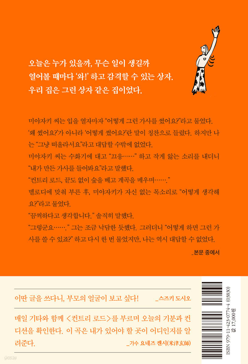 스튜디오 지브리의 프로듀서인 아빠 때문에 ‘토토로’라는 별명으로 불리는 것이 싫었던 어린 소녀에서 미야자키 하야오, 히사이시 조와 함께 작업하는 작사가, 아빠와 함께 영화 이야기를 나누는 ‘스즈키 P 패밀리’ 온라인 살롱을 운영하는 지금까지. 좋은 사람들과 좋은 인연을 이어 나가고 소중한 기회를 얻을 수 있었던 것은 모두 ‘스즈키 가의 상자’ 덕분이었다. 스즈키 가의 문을 열 때면 항상 두근거린다. 오늘은 누가 와 있을까? 무슨 일이 생길까? 아빠의 회사 직원들부터 엄마의 동창, 나의 학교 친구들, 친구의 친구들까지 문을 열 때마다 새롭고 반가운 사람들로 가득하기 때문! 마치 선물 상자 같은 스즈키 가에서 만난 인연들은 때로는 인생을 바꾸고, 때로는 황당할 때도 있지만, 언제나 즐겁고 행복한 기억을 만들어 낸다. 소중한 추억을 가득 모아둔 스즈키 가의 상자에서 가장 반짝이고 기억에 남는 에피소드를 소개한다. 스튜디오 지브리×스즈키 가 스즈키 패밀리만의 언어로 찾는 행복 “매일 기타와 함께 「컨트리 로드」를 부르며 오늘의 기분과 컨디션을 확인한다. 이 곡은 내가 있어야 할 곳이 어디인지를 알려준다.” _가수 요네즈 켄시 스즈키 도시오가 프로듀서이자 대표인 스튜디오 지브리가 만들어낸 「이웃집 토토로」, 「하울의 움직이는 성」, 「벼랑 위의 포뇨」 등 수많은 명작들. 그리고 딸 스즈키 마미코가 작사한 영화 「귀를 기울이면」의 주제곡 「컨트리 로드」, 「센과 치히로의 행방불명」의 수록곡인 「또다시」 가사의 공통점은 바로 사람들에게 행복과 희망을 나눠준다는 것! 스즈키 가의 사람들에게는 언제 어느 순간에서도 행복을 찾아내는 능력이 있다. 이들은 슬프고 기분 나쁜 일이 생겨도 즐거운 분위기로 바꾸며, 자신뿐만 아니라 주변 사람에게도 긍정적 에너지를 발산한다. 저자인 스즈키 마미코가 찾은 스즈키 가의 행복의 비결은 바로 ‘최선을 다하되, 전전긍긍하지 않는 것!’ 한 번도 해본 적 없는 어려운 일이 눈앞에 있어도, 낯선 사람들 속에서 혼자 덩그러니 남겨져 난감할 때도, 누군가 나에게 못되게 구는 상황에서도 일단 무엇이든 해본다. 무엇이든 열심히 하다보면, 전혀 예상치 못한 재미있는 기회와 인연들이 찾아와 스즈키 가의 상자를 풍성하게 만들어준다. 혹여 결과가 기대에 못 미치더라도 괜찮다. 스즈키 가에는 언제나 나의 편인 가족이 있고, 함께할 좋은 친구들이 있으며, 새로운 만남이 기다리고 있으니까. 《스즈키 가의 상자》는 소중한 가족, 마음이 맞는 친구와 보내는 일상의 소소한 시간이 얼마나 소중한 것인지를 일깨워준다. 현재를 충실하게 살며 작은 행복들이 우리 마음 속 상자를 가득 채울 때, 우리는 어떤 상황도 이겨낼 수 있는 힘을 얻게 된다는 것을 깨닫게 될 것이다. |
