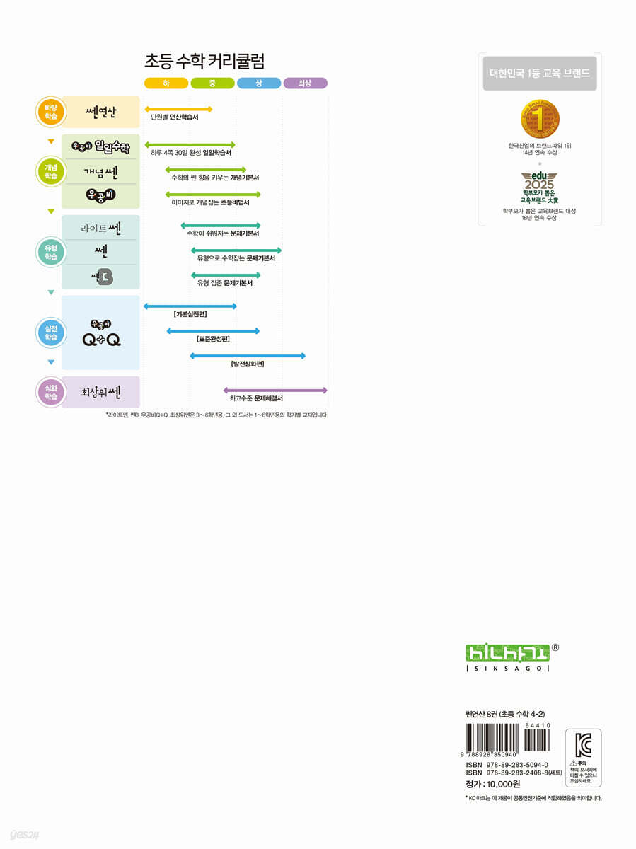1. 한 권으로 끝내는 한 학기 완벽 연산학습 2. 효율적 연산학습 관리를 위한 학습진단표 제공 3. 연산 원리를 쉽고 오랫동안 기억하게 하는 이미지 연상 학습 4. 절대 밀리지 않는 하루 1장 구성 수학 연산의 답=쎈 『쎈연산』 『쎈연산』은 이미지 연상 학습법으로 쉽고 재미있게 연산 원리를 익히고, 반복 연산 훈련을 한 후 해당 연산이 실생활에 어떻게 접목되는지 활용하는 연습을 통해 문제해결력까지 키울 수 있도록 구성된 교재입니다. 또한 연산 영역뿐 아니라 도형, 측정, 규칙성, 자료 등 연산이 필요한 모든 영역의 문제를 제공하여 한 권으로 해당 학기의 연산 학습을 완벽하게 마스터 할 수 있는 단원별 연산강화 학습서입니다. |