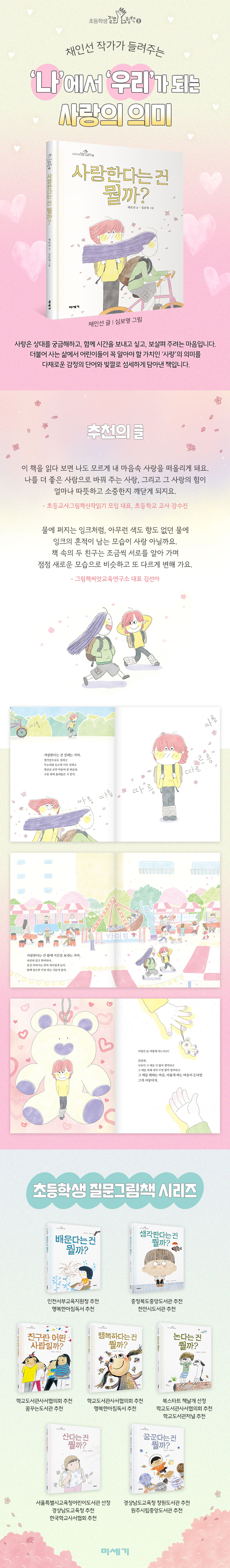 사랑은 참 신기해요. 설레고, 궁금하고, 함께하고 싶어지는 마음. 그 모든 감정이 사랑이라는 이름 아래 모여요. 이 책을 읽다 보면 나도 모르게 내 마음속 사랑을 떠올리게 돼요. 나를 더 좋은 사람으로 바꿔 주는 사랑, 그리고 그 사랑의 힘이 얼마나 따뜻하고 소중한지 깨닫게 되지요. 사랑에 대해 알고 싶어 하는 모든 아이들에게 이 책을 권하고 싶어요. - 강수진 (초등교사그림책신작읽기 모임 대표, 초등학교 교사)