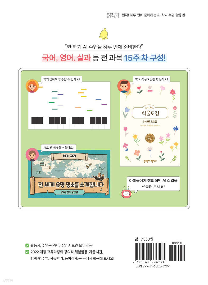 “AI 교육으로 창의력을 키우는 최고의 안내서” - 전라남도 교육감 “변화해야 할 교실 수업에 부담을 느끼는 교사들에게 단비 같은 책” - 하남초등학교 교장 “AI 시대에 더 나은 교육을 위해 고민하는 모든 선생님께 이 책을 추천합니다” - 월곡초등학교 교사 “이론에 머무르지 않고, 실제 수업에서 즉시 적용할 수 있습니다” - 한국과학창의재단 강사 “집에 가서 다시 한번 해 보고 싶을 정도로 재미있었어요!” - 문O현 학생 “코딩이나 소프트웨어 수업을 하는 것보다 더 재미있었어요!” - 박O율 학생 교육감, 교장 선생님, 한국과학창의재단 AI 강사, 초·중학교 선생님까지 추천한 이 책과 함께 AI 수업으로 전환을 시작해 보자. 이 책의 특징 - 15주 차, 과목별 30가지 수업으로 구성해 1학기 또는 1년 수업 가능! - 국어, 수학, 영어, 사회, 실과(정보), 음악, 미술 등 전 과목 수업 내용 수록 - 챗GPT, 캔바, 미리캔버스 등 무료 AI 프로그램 사용 - 활동지, 수업 지도안, 수업용 PPT 모두 제공 - AI 디지털 교과서의 보조 교재로 사용 가능 이런 분께 추천해요! - 수업에서 바로 활용할 수 있는 교재와 학습 지도안이 필요한 학교·학원 선생님 - AI로 자녀의 창의성을 길러 주고 싶은 학부모 - 다양한 학습 결과물을 만들고 싶은 방과 후 교사 - AI를 활용한 에듀테크를 도입하고 싶은 학원 선생님 새 학기에 2022 개정 교육과정에 따라 수업해야 하는 선생님들께 딱 맞춘 책! AI 활용 교육에 관심이 많은 학부모에게도 추천! 신문과 방송에선 AI 디지털 교과서로 연일 시끄럽고, 새 학기는 다가오고…. 혼란스러운 선생님들의 상황을 해결해 줄 책이 나왔다. 자신의 생각과 가치관이야 어떻든 AI를 수업에 도입해야 하는 선생님들을 위해 먼저 이 길을 가본 상위 1% 에듀테크 교사가 자신이 직접 수업한 교안을 모두 공개했다. 국어, 수학, 영어, 사회, 실과(정보), 음악, 미술 등 전 과목의 AI 수업 내용을 교육 현장에 바로 적용할 수 있어서 이 책을 펼치기만 해도 수업이 된다. 이 책은 15주 차로 구성해서 1학기 내내 걱정 없이 AI 수업을 진행할 수 있다. 학생의 수준별 학습을 고려해서 한 차시 당 수업을 두 개로 쪼개 총 30가지 수업을 할 수도 있다. 이렇게 모든 수업을 나눠서 진행한다면 1년도 채울 수 있는 분량이다. AI 수업이 막막하고 1학기 수업을 어떻게 채울지 걱정이 가득한 교사라면 이 책으로 준비한 AI 수업 밥상에서 떠먹기만 하면 될 것이다. “선생님! 저는 선생님 화면과 달라요!” 실제 교실에서 아이들을 만난 사람만 아는 디테일한 코칭! AI 수업을 한 번이라도 시도해 본 사람이라면 아이들이 얼마나 사소한 곳에서 막히는지 뼈저리게 느낄 것이다. 이 같은 상황을 날마다 겪어 본 저자가 자신의 태블릿 PC를 교실의 스마트 TV에 미러링하는 방법부터 학습 결과물을 공유 게시판 플랫폼인 ‘패들렛’에 올리는 방법까지 세세하게 소개한다. 따로 유료 설치할 필요가 없는 무료 AI 프로그램 사용! 이 책에서 다루는 AI 프로그램은 모두 무료다. 또한 구글에 기반해서 작동하므로 학급에 배포된 ‘디벗’의 학생용 구글 계정으로 로그인해 수업에 쉽게 적용할 수 있다. 챗GPT, 캔바, 미리캔버스 등 대중적이고 인기 있는 AI 프로그램을 비롯해 음악, 미술, 체육 등에 특화된 다양한 AI 프로그램도 함께 사용한다. 활동지, 수업용 PPT, 수업 지도안 모두 제공! 이 책은 수업에 필요한 자료를 이지스퍼블리싱 홈페이지(www.easyspub.co.kr)의 자료실에서 모두 제공한다. 아이들이 직접 손으로 쓰는 활동지는 한글 파일이어서 바로 인쇄해서 사용할 수 있고, 수업용 PPT 파일을 제공해 수업 준비 시간을 단축할 수 있다. 수업 지도안 파일도 제공해 선생님들의 행정 업무 일손을 덜 수 있도록 도왔다. 교육감, 교장 선생님, 한국과학창의재단 AI 강사, 초등학교·중학교 선생님까지 손꼽아 기다린 바로 그 책! AI 수업은 많은 이들이 걱정하는 것처럼 교육계에 아주 중요한 이슈다. 하지만 교육의 본질을 생각하고 AI를 도구로 생각한다면 오히려 해답은 쉬울 수 있다. 앞으로 새로운 세상을 펼쳐 나갈 우리 아이들에게 AI는 아주 친숙한 도구가 될 것이다. 그러므로 교육계는 아이들이 AI를 활용해서 자신의 ‘창의성’을 발휘할 수 있도록 도와야 한다. AI가 아이들의 생각에 날개를 달아 주고 더 많은 가능성을 만나는 도구로 쓰일 수 있도록 말이다. 이 책은 그 시작점이 될 것이다. 악기 없이 합주를 하고, 상상 속의 동화를 직접 만들어 보고, 온라인으로 도자기를 빚고, 해양 쓰레기를 치우며 머신러닝도 직접 시켜 본다. 이런 AI 수업을 경험해 본 아이들은 ‘AI로 자신이 할 수 있는 것’을 앞으로 더 찾아보고 문제를 쉽게 해결하면서 AI를 자연스럽게 받아들일 것이다. [먼저 수업을 들은 초등학생의 한마디!] 집에 가서 다시 한번 해 보고 싶을 정도로 재미있었어요! 다른 친구들도 인공지능 활용 수업을 받고 재미있게 공부했으면 좋겠어요. - 문O현 코딩이나 소프트웨어 수업보다 더 재미있었어요! 선생님과 인공지능을 더 배우고 싶어요. - 박O율 ‘인공지능을 이렇게 활용할 수 있구나!’라는 생각이 들었어요. 다른 과목 수업도 들어 보고 싶어요. - 김