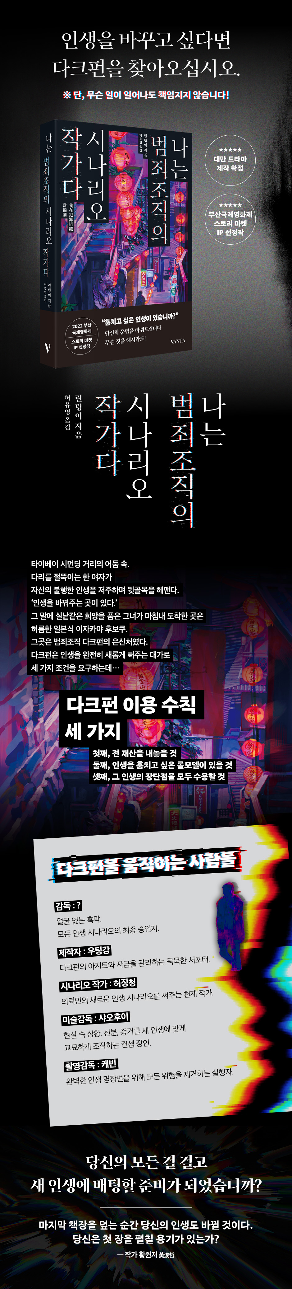 “당신의 인생을 바꿔드립니다.무슨 짓을 해서라도!”타이베이의 한적한 골목 끝, 겉보기에는 평범한 일본식 이자카야 후보쿠. 이곳의 다락방은 법과 도덕의 경계를 넘나드는 은밀한 범죄조직 다크펀의 아지트다. 다크펀의 조직원들은 절망적인 현실을 살아가는 의뢰인들의 운명을 완전히 바꾸어준다. 그러나 완벽한 인생을 얻기 위해서는 세 가지 대가가 따른다. 첫째, 전 재산을 내놓을 것. 둘째, 인생을 훔치고 싶은 롤모델이 있을 것. 셋째, 그 인생의 장단점을 모두 수용할 것. 스스로의 인생을 자조하며 불행 속에 살아가는 사람들에게 운명을 바꾸어준다는 말보다 매력적인 제안이 있을까? 원하는 인생을 살 수만 있다면 무엇이든 할 수 있다고 말하는 사람들이 다크펀의 문을 두드린다. 장애가 있어 잘 걷지 못하는 린위치는 잘나가는 의사의 아내 샤오원의 인생이 부럽기만 하다. 같은 의사 남편을 두고도 샤오원의 삶은 완벽해 보인다. 건강한 몸, 넘치는 경제적 여유, 다정한 남편까지……. 그런 샤오원과 자기 인생을 바꾸고 싶어 다크펀을 찾는다.(1장) 어린 시절 왕따를 당했던 자신의 삶을 아들에게 되물림하고 싶지 않은 영어 교사 왕푸런,(2장) 어머니를 간병하기 위해 빚을 졌지만 꿈을 포기할 수 없어 극장과 바를 오가며 일하는 류샤오위(3장) 또한 인생을 바꾸기 위해 다크펀에 발을 들인다.이들은 결국 꿈꾸던 삶을 손에 거머쥔다. 린위치는 롤모델인 샤오원처럼 건강하게 두 발로 걸을 뿐 아니라 뛸 수도 있게 되고, 그녀의 남편 또한 샤오원의 남편처럼 개업의로 승승장구한다. 왕푸런도 자신만만한 유명 인플루언서가 되고, 류사오위도 버거운 일상에서 벗어나려는 듯 보인다. 그러나 이들이 그토록 꿈꾸던 삶을 손에 넣었다고 생각한 순간, 예상치 못한 그림자가 드리워지기 시작한다. 완벽하다고 믿었던 롤모델의 삶에는 끔찍한 어둠이 서려 있었던 것이다. 완벽한 인생은 없다그저 나의 인생이 있을 뿐다크펀은 실제로 의뢰인의 삶을 완벽하게 바꾼다. 시나리오 작가인 허징청이 새로운 인생 시나리오를 쓰면, 의뢰인은 그 시나리오를 가지고 후보쿠의 2층 다락방으로 올라간다. 문이 닫히고 정확히 언제인지는 알 수 없지만 시간이 흘러 의뢰인이 다락방에서 나오는 순간 곧바로 인생이 바뀌기 시작한다. 하지만 다락방 위에서 어떤 일이 벌어지는지는 아무도 모른다. 누군가는 다락방에서만 만날 수 있다고 알려진 얼굴 없는 ‘감독’이 마법을 부린다고 말하고, 또 다른 누군가는 그곳에서 ‘운명’이 재창조된다고 믿는다. 그저 의뢰인들이 새로운 인생을 시작하기 위해 반드시 거쳐야 하는 공간이라는 점만 확실할 뿐이다. 바로 이 지점에서 현실과 환상을 넘나드는 이 책만의 독창적인 매력이 시작된다. 의뢰인이 다락방에서 나오는 순간, 미술 감독 샤오후이는 의뢰인이 살아온 환경과 인간관계, 사건을 정밀하게 다시 세팅하고, 촬영 감독 케빈은 합법과 불법 사이를 넘나들며 위험 요소를 제거한다. 실제 영화 제작 팀처럼 움직이는 다크펀은 의뢰인의 새로운 인생을 현실이라는 무대 위에 올리는 마이더스의 손이다. 하지만 모든 각본이 그렇듯 예상치 못한 변수는 언제든 찾아온다.한편, 서술자이자 다크펀의 시나리오 작가인 허징청은 자신의 재능을 살려 의뢰인의 인생 시나리오를 새롭게 써주고, 그들의 인생을 진정으로 변화시키는 일에 보람을 느낀다. 하지만 의뢰인 중 일부는 바뀐 인생에 만족하지 못하고 또다시 다크펀의 문을 두드린다. 원하는 삶을 손에 넣었음에도 왜 어떤 이들은 만족하고, 왜 어떤 이들은 그렇지 못한 걸까? 허징청은 어떤 삶이 과연 완벽한 삶인지, 다크펀의 역할은 무엇인지 깊은 고민에 빠진다. 결국 인생에서 흑과 백처럼 좋은 일과 나쁜 일을 걸러낼 수는 없는 걸까? ‘완벽한 인생’이란 없는 걸까? 모든 인생에는 명암이 서려 있다. 누구나 더 나은 삶을 꿈꾸지만 인생의 행복과 불행은 마치 동전의 양면처럼 맞닿아 있다. 좋은 일이 생기면 나쁜 일도 생기고, 나쁜 일이 생기면 좋은 일도 생긴다. 오히려 삶의 불행을 지우려 할수록 우리는 또 다른 불완전함을 마주하게 된다. 진정한 변화는 새로운 인생을 선택하는 것이 아니라, 현재의 삶을 어떻게 바라보느냐에 달려 있는 것은 아닐까?《나는 범죄조직의 시나리오 작가다》는 단순한 미스터리 소설이 아니다. “지금보다 더 나은 인생을 살고 싶다”고 한 번이라도 생각해 봤다면, 이 소설을 통해 삶의 불행과 행복에 대해 묵직한 질문을 마주하게 될 것이다. 선택은 언제나 우리 자신의 몫이다. 당신이라면 모든 것을 걸고 새로운 인생에 배팅할 것인가?
