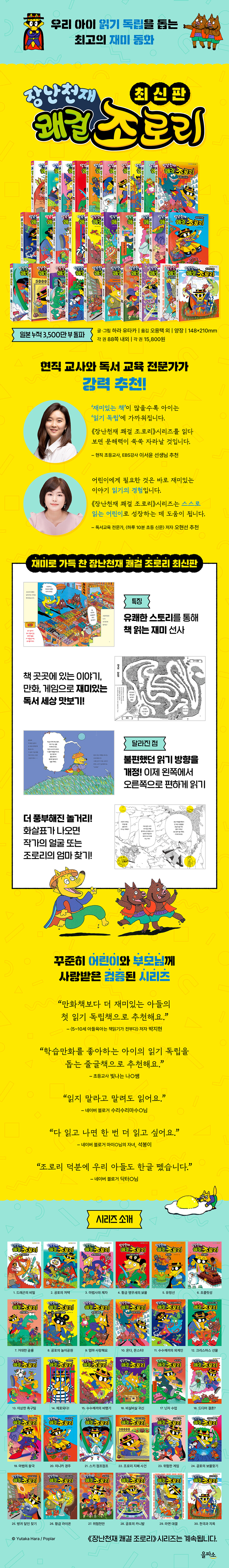 아이들 대부분은 독서 사다리가 필요합니다. 이때 중요한 것은 독서 사다리가 ‘재미있는 책’이어야 한다는 것입니다. 《장난천재 쾌걸 조로리》 시리즈는 ‘영상이 아닌 글자도 재미있구나.’ 하는 걸 느낄 수 있는 요소가 책 곳곳에 숨어있습니다. 이야기 내용뿐 아니라 숨은그림찾기, 다른 그림 찾기, 만화 등이 들어가 있어서 ‘책’을 보는 것도 재미구나, 하는 걸 느끼게 해 줍니다. 그렇게 아이들에게 스며드는 책의 권수가 많아질수록 ‘읽기 독립’의 단계에 가까워집니다. 특히나 문해력을 기르기에 좋은 책은 긴 호흡의 글입니다. 주인공은 같으면서 에피소드가 바뀌는 시리즈의 책을 읽다 보면 긴 호흡으로 글을 읽게 되고, 그 안에 있는 다양한 캐릭터가 얽힌 서사를 읽으면서 문해력이 쑥쑥 자라날 것입니다. - 이서윤 (현직 초등교사, EBS강사, 《이서윤의 초등생활처방전365》 저자)