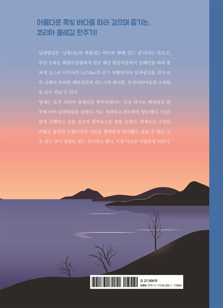 코리아둘레길이란 남파랑길이란 01 오륙도해맞이공원 → 부산역 유엔기념공원과 역사적 초량동 이바구길탐방 02 부산역 → 영도대교 입구 태종대와 영도대교까지 이어지는 절영해안산책로 03 영도대교 입구 → 감천사거리 자갈치시장부터 암남공원 두도전망대까지, 부산의 진수를 맛보며 04 감천사거리 → 신평동교차로 다대포의 몰운대에서 아미산 벚꽃길까지, 봄의 향연 05 신평동교차로 → 송정공원 낙동강하구둑에서 을숙도까지, 벚꽃과 함께하는 여정 06 송정공원 → 제덕사거리 황포돛대 노래비와 웅천읍성의 역사적 발걸음 07 제덕사거리 → 상리마을 입구 창원해양공원에서 진해 해안로까지, 해변의 여유를 즐기며 08 상리마을 입구 → 진해드림로드 입구 아름다운 장복산 진해드림로드를 걸으며 09 진해드림로드 입구 → 마산항 입구 가고파 꼬부랑 벽화마을에서 임항선 그린웨이까지의 예술적 탐험 10 마산항 입구 → 구서분교 앞 삼거리 마창대교의 전망을 즐기며 청량산 산책로를 휘돌아 11 구서분교 앞 삼거리 → 임아교차로 진동항에서 미더덕의 맛, 해안가의 진미를 맛보고 12 임아교차로 → 배둔시외버스터미널 고성공룡세계엑스포에서 당항만로까지, 고성의 매력 탐험 13 배둔시외버스터미널 → 황리사거리 면화산둘레길 따라 고성의 해안과 함께하는 자연 여행 14 황리사거리 → 충무도서관 통영 해안길, 내죽도수변공원에서 바다의 향기를 느끼며 15 충무도서관 → 사등면사무소 신거제대교를 건너서 통영과 거제의 아름다운 해안 경관을 즐기며 16 사등면사무소 → 고현버스터미널 거제 사등성에서 사곡해수욕장까지, 거제의 숨겨진 매력 17 고현버스터미널 → 장목파출소 석름봉과 거제맹종죽, 자연의 아름다움 속으로 18 장목파출소 → 김영삼 대통령 생가 매미성과 김영삼 대통령 생가, 역사의 증인들과 함께 19 김영삼 대통령 생가 → 장승포 시외버스터미널 이순신 장군을 만나는 길, 영웅의 업적을 되새기며 20 장승포 시외버스터미널 → 거제어촌민속전시관 한려해상의 아름다운 해안 경관에 취해 장승포항에서 지세포항까지 21 거제어촌민속전시관 → 구조라 유람선터미널 공곶이 몽돌해변에서 내도의 아름다운 풍경을 감상하며 22 구조라 유람선터미널 → 학동고개 구조라성에서 해수욕장의 아름다운 경치를 조망하며 23 학동고개 → 저구항 뫼바위전망대에서 외도보타니아, 바람의 언덕 등 해안의 절경을 만끽하고 24 저구항 → 탑포마을 입구 거제 ‘무지개길’, 쌍근항 ‘하늘물고기’의 환상적인 조화 25 탑포마을 입구 → 거제파출소 부춘리와 오수리, 시골길에서 만나는 황금 들녘의 정취 26 거제파출소 → 청마기념관 외관리 동백나무와 대봉산임도, 신두구비재의 자연 속으로 27 청마기념관 → 장평리 신촌마을 청마기념관과 거제둔덕기성, 해안의 아름다움을 감상하며 28 장평리 신촌마을 → 남망산 조각공원 입구 이순신공원과 남망산 조각공원, 예술과 자연의 조화 29 남망산 조각공원 입구 → 무전동 해변공원 동피랑 벽화마을과 서피랑 공원의 산책 30 무전동 해변공원 → 바다휴게소 제석봉과 발암산에서 바라보는 남해안의 웅장한 풍경 31 바다휴게소 → 부포사거리 해지개 해안둘레길의 아름다움과 고성 남산공원의 자연 속으로 32 부포사거리 → 임포항 고성 학동마을 탐방, 전주 최씨 집성촌의 역사와 문화를 찾아서 33 임포항 → 하이면사무소 상족암둘레길을 걸으며 공룡의 흔적, 발자국 화석을 찾아서 34 하이면사무소 → 삼천포대교 사거리 삼천포항과 노산공원을 지나며 삼천포 수산시장의 신선함을 맛보고 35 삼천포대교 사거리 → 대방교차로 각산전망대에서 한려해상의 전경을 감상하고 사천바다케이블카로 하늘여행 36 대방교차로 → 창선파출소 삼천포대교와 연륙교를 건너서 단항마을의 왕후박나무를 감상하고 37 창선파출소 → 적량 버스정류장 가인리 고사리밭의 이국적인 풍경 속에서 자연의 여유를 만끽하며 38 적량 버스정류장 → 지족리 하나로마트 창선 추섬공원의 자연미와 창선교를 건너 남해의 비경 속으로 39 지족리 하나로마트 → 물건마을 지족해협의 아름다운 길을 따라 죽방렴과 물건방조어부림의 생태를 탐험하며 40 물건마을 → 천하몽돌해변 입구 파독 광부와 간호사의 이야기가 깃든 독일마을과 남해편백숲길을 걸으며 41 천하몽돌해변 입구 → 남해바래길 안내센터 상주은모래해변의 부드러움과 두모마을해변에서 바라보는 노도의 절경 42 남해바래길 안내센터 → 가천다랭이마을 가천해안숲길의 아름다운 해안 절경과 유채꽃 만발한 가천다랭이마을 43 가천다랭이마을 → 평산항 펜션단지 빛담촌의 아름다움과 항촌항 조약돌해변을 거닐며 44 평산항 → 서상여객선터미널 임진성의 역사적 공간을 둘러보고 천황산전망대에서 아난티해안의 절경에 취해 45 서상여객선터미널 → 새남해농협 중현지소 예계마을의 왕벚꽃 터널과 망운산노을길에서 시간이 멈춘 듯한 평화를 느끼며 46 새남해농협 중현지소 → 노량공원주차장 해안데크길 관음포 이락사와 충렬사에서 이순신 장군의 애국충절 정신을 되새기며 47 노량공원주차장 해안데크길 → 섬진교 동