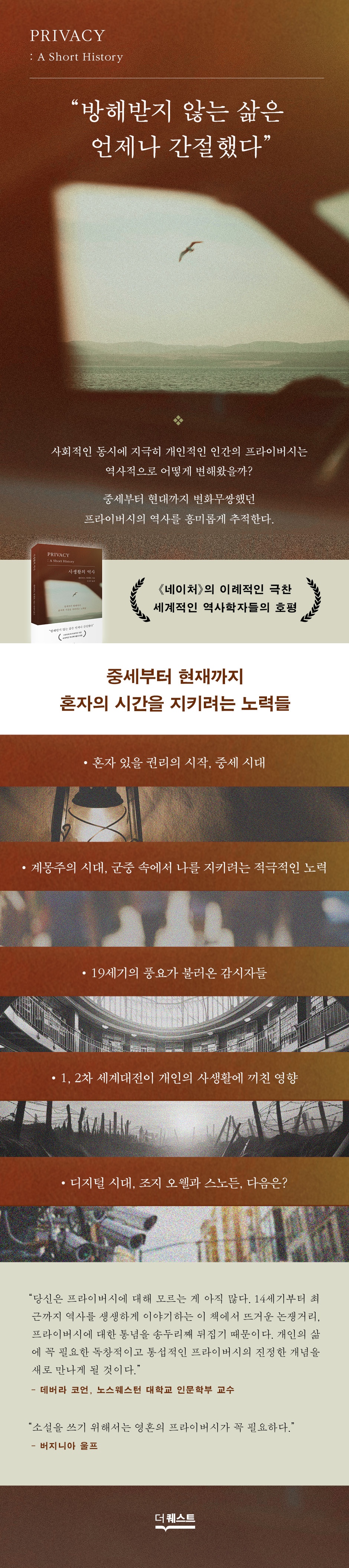 1. 혼자 있을 권리의 시작, 중세 시대 14세기의 사생활 침해 소송 사적인 공간의 탄생 혼자 하는 기도와 혼자 쓰는 일기 오직 둘만을 위한 편지 내밀한 관계를 지키려는 노력들 2 군중 속에서 나를 지키다 익명성이라는 예절 결혼 이후 개인의 사생활 혼자 있는 시간과 읽는 행위 편지가 가져온 사적인 소통의 혁명 3. 19세기의 풍요가 불러온 감시자들 대도시 속 사생활의 기술 일상으로부터 우아한 탈출 은둔하고 싶은 자를 위한 건축 전화와 편지의 프라이버시 타인에 대한 위험한 호기심 4. 전쟁이 개인의 사생활에 끼친 영향 평범한 가정의 프라이버시가 지켜지기까지 가족의 삶을 보호해주는 것들 부부의 은밀한 프라이버시 국가의 개인 사찰이 시작되다 5 조지 오웰, 스노든, 다음은? 모두가 프라이버시의 죽음을 외치다 사생활 패턴의 3가지 변화 국가는 개인의 감시자인가, 보호자인가 재산권으로서의 프라이버시 |