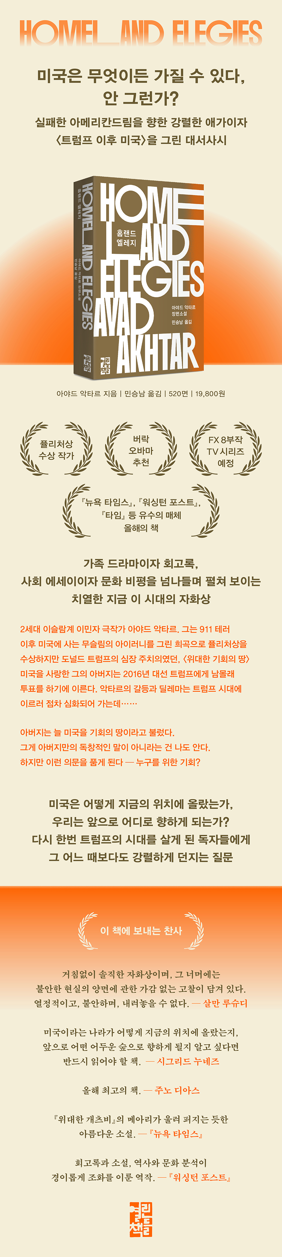 ★★★ [뉴욕 타임스], [워싱턴 포스트], [타임], [퍼블리셔스 위클리] 외 다수의 언론사 올해의 책 선정 ★★★ 버락 오바마 추천, FX 8부작 TV 시리즈 예정 미국은 무엇이든 가질 수 있다, 안 그런가? 다시 한번 트럼프의 시대를 살게 된 독자에게 바치는 〈트럼프 이후 미국〉을 그린 대서사시 〈『위대한 개츠비』의 메아리가 울려 퍼지는 듯한 아름다운 소설〉이라는 찬사를 받고, 유수의 언론사에서 〈올해의 책〉으로 선정되며 주목을 받은 아야드 악타르의 장편소설 『홈랜드 엘레지』가 민승남 씨의 번역으로 출간되었다. 동시대 가장 주목받는 미국의 극작가이자 소설가인 아야드 악타르는 미국의 이민자에 대한 혐오와 자본주의의 폭력을 날카롭게 포착한 희곡과 소설 들로 대중과 평단의 뜨거운 관심을 받아 왔다. 특히 911 테러 이후 강화된 이슬람 혐오로 인해 느끼는 정체성의 혼란을 그린 희곡 「수치Disgraced」로 퓰리처상을 수상하며 큰 화제를 몰고 왔다. 『홈랜드 엘레지』는 악타르의 두 번째 장편소설로, 〈회고록과 소설, 역사와 문화 분석이 경이롭게 조화를 이룬 역작〉이라는 극찬을 받으며 아메리칸 북 어워드를 수상하고, 앤드루 카네기 메달상 후보에 올랐다. 자전적 소설인 이 작품은 도널드 트럼프 심장 주치의인 아버지를 둔 2세대 이슬람계 이민자 극작가 아야드 악타르를 주인공으로, 트럼프와의 화려한 식사 자리와 뉴욕 브로드웨이 무대 뒤편부터 할리우드힐스와 스크랜턴의 낙후된 공장 지대에 이르기까지 미국 전역을 종횡무진 가로지르며 〈미국〉과 〈미국적 삶〉의 이면을 과감하게 파헤친다. 미국에서 살아가며 정체성의 딜레마를 겪는 무슬림으로서 조국에 대한 분노와 애증을 담아 써 내려간 강렬한 이 자전 소설은 예술, 금융, 인종, 종교, 학계, 국가 등 다양한 주제를 관통하며 트럼프 시대의 실패한 〈아메리칸드림〉을 세련된 블랙 코미디로 탁월하게 그려 냈다. 가족 드라마이자 회고록, 사회 에세이이자 문화 분석을 넘나들며 치열하게 펼쳐 보이는 이 시대의 자화상 『홈랜드 엘레지』는 가족 드라마, 사회 에세이, 희곡 등 다양한 형식을 자유로이 넘나든다. 소설의 첫 장은 「트럼프 취임 1주년 기념일에」 라는 의미심장한 제목으로 시작된다. 성공한 극작가인 아야드와 트럼프 주치의였던 아버지가 갈등을 빚는 장면이다. 작가 자신이자 소설 속 화자이기도 한 극작가 아야드는 무슬림의 미국적 딜레마와 고통을 글에 담아내어 퓰리처상을 받고 미국의 대표적 무슬림 출신 작가로 부상했으나 무슬림의 배타성, 미국의 약탈적 자본주의를 동시에 비판하며 무슬림과 미국, 양쪽에서 배척당하고 있는 상황이다. 파키스탄에서 의대를 졸업하고 미국으로 이민 온 아버지는 〈위대한 기회의 땅〉 미국을 사랑하는 인물로, 1993년 트럼프의 심장 주치의로서 잠깐 교류한 기억으로 그를 추억하며 2016년 트럼프가 대선에 출마하자 남몰래 그에게 표를 준다. 이토록 사상과 가치관이 전혀 다른 아들과 아버지의 이야기로부터 뻗어 나간 소설은 이제 아버지의 친구이자 어머니가 남몰래 진정으로 사랑했던 인물, 미국에 살았지만 고국으로 돌아가 빈 라덴을 비롯한 무슬림의 독립을 지지했던 〈라티프〉라는 인물을 중심으로, 아버지 세대와 자신의 세대 시선으로 미국과 파키스탄 간 관계의 역사를 르포 형식으로 재조명한다. 라티프는 〈이슬람 테러리스트 스파이〉로 지목되어 암살당하고, 악타르는 미국에서 살아가는 〈미국인〉으로서의 자신의 자아와 무슬림으로서의 자아로 살아가는 민족의 믿음이 다름에서 오는 분열을 정면으로 마주하게 된다. 악타르는 911 테러 이후, 미국인들로부터는 〈테러리스트의 민족〉으로, 무슬림 연인으로부터는 무슬림의 정체성을 지지하지 않는 〈미국인〉으로 여겨지며 그 어느 곳에도 속하지 못하는 극렬한 아이러니를 겪게 된다. 이후 그는 대출 평가 사업을 운영하며 빚을 팔아 자본을 굴리는 시스템을 운영하는 또 다른 무슬림 리아즈라는 인물을 만나게 된다. 빚과 자본이 초국가적 힘을 가진 수단과 논리가 되어 수많은 하층 계급의 삶을 파괴하는 것을 본 동시에 바로 그 리아즈가 주선한 주식으로 크나 큰 부를 거머쥐게 된 악타르는 자본주의적 성공에 얽힌 욕망을 거부할 수가 없게 된다. 이후 설상가상으로 도박과 술에 중독된 아버지는 자신의 의료 과실로 인해 죽은 환자 사건을 고백하고, 환자보다도 자본 이익의 증대를 추구한 기업형 의료 네트워크의 비리가 있었다는 사실을 알게 된 악타르가 가진 〈미국〉에 대한 딜레마는 심화되어 가는데……. 미국은 어떻게 지금의 위치에 올랐으며, 어디로 향하게 되는가 〈지금 우리의 시대〉를 향한 요동치는 질문들 2024년 11월, 트럼프는 〈미국을 다시 위대하게〉라는 슬로건을 내걸고 재선에 성공했다. 현재 그는 〈크고 아름다운 벽〉을 강조하며 불법 이민자를 추방하고 국경 장벽을 더욱 강화하겠다고 선언하기에 이르렀다. 아이러니하게도 『홈랜드 엘레지』는 2020년 출간 당시보다도 더욱 동시대적이면서도 이후 미국의 행보로 더욱 요동치는 전 세계의 모습을 묘사한 예언서