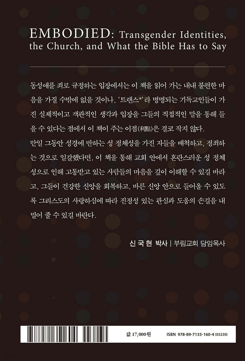 동성애를 죄로 규정하는 입장에서는 이 책을 읽어 가는 내내 불편한 마음을 가질 수밖에 없을 것이나, ‘트랜스*’라 명명되는 기독교인들이 가진 실제적이고 객관적인 생각과 입장을 그들의 직접적인 말을 통해 들을 수 있다는 점에서 이 책이 주는 이점(利點)은 결코 작지 않다. 만일 그동안 성경에 반하는 성 정체성을 가진 자들을 배척하고, 정죄하는 것으로 일갈했다면, 이 책을 통해 교회 안에서 혼란스러운 성 정체성으로 인해 고통받고 있는 사람들의 마음을 깊이 이해할 수 있길 바라고, 그들이 건강한 신앙을 회복하고, 바른 신앙 안으로 들어올 수 있도록 그리스도의 사랑하심에 따라 진정성 있는 관심과 도움의 손길을 내밀어 줄 수 있길 바란다. - 신국현 (부림교회 담임목사)