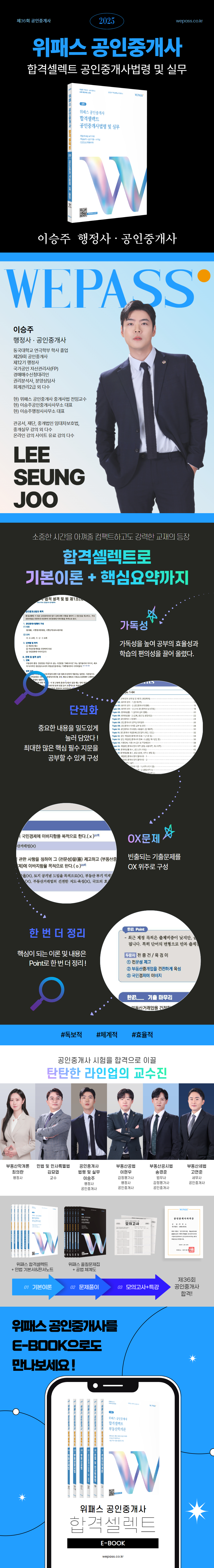 이 책 한 권을 통해 최대한 많은 ‘핵심 필수 지문’을 공부하실 수 있도록 노력했습니다. 책의 가독성을 높이고, 단권화에 있어 최적을 도모하도록 노력했습니다. 또한, 최근 10여 년 간의 기출문제를 엄선했습니다. 본서에서 핵심 필수 지문을 함께 공부한다면 높은 효율을 기대할 수 있을 것입니다. 빈출되는 기출을 OX 위주로 구성했습니다. 합격샐렉트 한 권에 최대한 중요한 내용을 밀도 있게, 꾹꾹 눌러 담고자 했습니다. 여러 권의 책을 중복되는 내용으로 여러 번 찾아보는 것보다, 한 권의 책을 여러 번 읽으며 공부하는 것이 “연상법”의 측면과 효율성 측면에서 좋다고 판단하여, 한 권으로 단권화 한 교재입니다. 기본 이론의 중요 내용을 정리합니다. 기출빈도가 아주 낮은 부분은 과감히 배제했습니다. 그중 가장 핵심이 되는 이론 및 내용을 한 끝(끗) point로 한 번 더 정리합니다. 단순 암기가 아닌 조문과 판례를 함께 공부하여 기본 내용을 이해하고, 적용하실 수 있도록 구성하려 노력했습니다. 토픽 약 100개로 꾸려 단권화하여, 정말 핵심 내용들만 꾹꾹 눌러 담았습니다. 「저자의 말」 중에서 공부를 해도 점수가 오르지 않는 것 같고, 추울 때는 추운 대로, 더울 때는 더운 대로 무척 힘이 듭니다. 문제를 푸는 것이 두려울 때도 있었습니다. 분명 외운 것 같았는데, 공부한 것 같았는데 문제를 풀면 틀리고, 또 틀리기도 했습니다. 그런 인고의 과정을 묵묵히, 꾸준히 보낸 결과, 고득점으로 동차 합격의 기쁨을 누렸습니다. 여러분께 꼭 한 가지 말씀드리고 싶은 것이 있습니다. 꾸준히만 공부하신다면, 반드시 "유레카"를 외칠 날이 온다는 것입니다. 여러분이 이론을 공부하고, 문제를 풀고, 틀리고 또 다시 보는 과정을 반복해 보세요. 보이지 않는 땅속 깊은 곳에서부터 "합격의 싹"이 틔워 나오고 있다는 사실을, 저는 알고 있습니다. 처음에는 어두운 터널에 갇힌 기분이 들 것입니다. 누군가는 그 터널을 “합격”이라는 믿음을 갖고 묵묵히 걸어가고, 누군가는 중간에 주저앉아 버리기도 합니다. 이 교재를 통해 저와 함께 공부하는 모든 분들에게, 터널 끝에서 환한 전등을 켜고 달려가겠습니다. 여러 과목을 한 번에 공부해야 하는 시험일수록, “전략 과목”이 반드시 필요합니다. 꼼꼼하게, 확실하게 공부할 수만 있다면 중개사법은 여전히 전략 과목이 될 수 있습니다. 객관식 시험의 장점 중 하나는, “문제를 많이 풀수록 유리하다.”입니다. ‘눈에 바른다’는 표현처럼, 주관식은 모두 외워야 쓸 수 있는 반면 객관식 시험이기에 눈에 발라도 찍어 맞출 수 있습니다. 또한, 우리 시험은 100점을 맞는 시험이 아닙니다. 평균 60점을 넘을 수 있으면 됩니다. 점수가 높다고 실무에서 더 일을 잘하는 것은 아닙니다. 여러분은 “자격”을 받기 위한 검증만 통과하면 됩니다. 어차피 실무에서는 새로운 공부를 하고 경험을 해나가야 하기 때문입니다. 이 책을 통해 100점을 맞게 해드릴 수는 없습니다. 하지만, “60점 못 맞아서 떨어졌다.“라는 말은 안 나오게 하겠습니다. 여명, 동트기 전 시간대를 말합니다. 동트기 전이 가장 어둡다는 말이 있습니다. 시험이 임박할수록 막막하고 두려울 것입니다. 하지만 그때가 바로, 동트기 전이라는 사실을 꼭 기억하시길 바랍니다. 36회 공인중개사가 되기 위한 여러분에게 이 책이 좋은 길잡이 역할이 되길 진심으로 기원합니다. 실무 현장에서 여러분을 기다리고 있겠습니다. 행정사&공인중개사 이승주 배상 |
