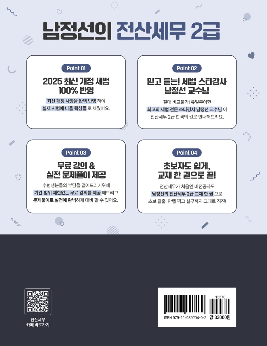 Ⅰ 재무회계 1. 회계의 기본개념 8 2. 회계의 순환과정 12 3. 재무회계 개념체계 15 4. 유동자산 22 5. 비유동자산 39 6. 부채 60 7. 자본 68 8. 수익과 비용 77 9. 회계변경과 오류수정 86 Ⅱ 원가회계 1. 원가회계의 개요 92 2. 제조원가의 흐름 101 3. 원가배분 108 4. 부문별 원가계산 : 보조부문 원가의 배분 110 5. 결합원가계산 116 6. 개별원가계산 118 7. 종합원가계산 124 Ⅲ 부가가치세 1. 부가가치세의 기본개념 136 2. 과세거래 145 3. 부수재화 또는 용역의 공급 151 4. 거래시기(=공급시기) 152 5. 부가가치세 세율, 영세율 및 면세 155 6. 과세표준 및 매출세액 161 7. 거래징수와 세금계산서 166 8. 매입세액 공제와 납부세액 계산 173 9. 신고·납부 및 환급 183 10. 간이과세자 185 Ⅳ 소득세 1. 소득세의 기본개념 188 2. 종합소득세 과세대상 소득의 종류 198 3. 근로소득에 대한 과세방법 211 4. 사업소득에 대한 과세방법 217 5. 종합소득공제 228 6. 종합소득 산출세액 234 7. 소득세의 신고·납부 242 PART 2 실기 1. 전산세무 2급 실기시험 개요 248 2. 재무회계 실무능력 정복하기 250 3. 부가가치세 실무능력 정복하기 300 4. 원천징수 실무능력 정복하기 349 PART 3 기출문제 문제편 1. 제 116회 문제 396 2. 제 115회 문제 410 3. 제 114회 문제 423 4. 제 113회 문제 437 해설편 1. 제 116회 해답 450 2. 제 115회 해답 463 3. 제 114회 해답 474 4. 제 113회 해답 488 |