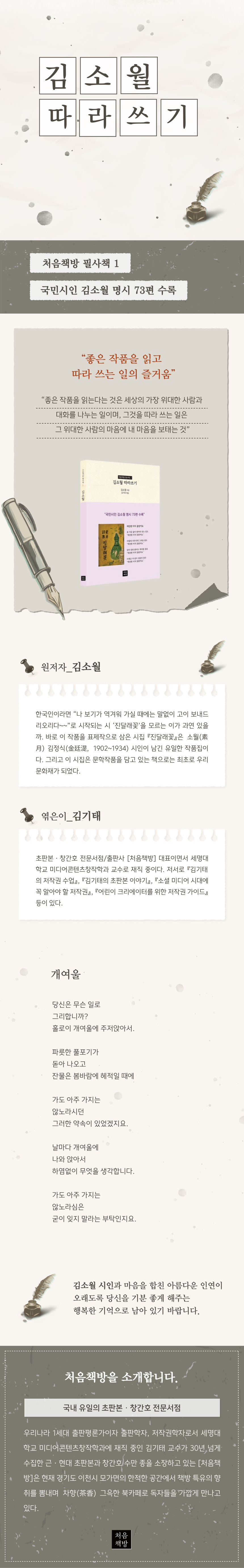 닭은 꼬꾸요 / 8 먼 후일 / 10 가는 길 / 12 고적한 날 / 14 첫 치마 / 16 님의 노래 / 18 옛이야기 / 20 황촉(黃燭) 불 / 22 제비1 / 24 제비2 / 26 자나 깨나 앉으나 서나 / 28 못 잊어 / 30 진달래꽃 / 32 개여울의 노래 / 34 왕십리 / 36 눈 오는 저녁 / 38 구름 / 40 예전엔 미처 몰랐어요 / 42 길 / 44 접동새 / 48 나의 집 / 50 부부 / 52 가을 저녁에 / 54 닭 소리 / 56 해가 산마루에 저물어도 / 58 만나려는 심사 / 60 기억 / 62 봄밤 / 64 무덤 / 66 나는 세상 모르고 살았노라 / 68 산유화 / 70 애모 / 72 님에게 / 74 꿈으로 오는 한 사람 / 76 부귀공명 / 78 엄숙 / 80 빛 / 82 맘에 있는 말이라고 다 할까 보냐 / 84 들놀이 / 86 바라건대는 우리에게 우리의 보습 대일 땅이 있었더면 / 88 찬 저녁 / 90 널 / 92 춘향과 이도령 / 94 분(粉) 얼굴 / 96 추회(追悔) / 98 엄마야 누나야 / 100 금잔디 / 102 초혼(招魂) / 104 산(山) / 106 밭고랑 위에서 / 108 꿈꾼 그 옛날 / 110 강촌(江村) / 112 밤 / 114 실제(失題)1 / 116 실제(失題)2 / 118 그를 꿈꾼 밤 / 120 부모 / 122 반달 / 124 비단 안개 / 126 개아미 / 128 서로 믿음 / 130 한식(寒食) / 132 저녁때 / 134 꿈길 / 136 원앙침 / 138 건강한 잠 / 140 무신(無信) / 142 기분전환 / 144 기회 / 146 고향 / 148 절제(節制) / 154 넝쿨타령 / 156 김기태의 초판본 이야기 _ 우리 정서를 농축시켜 빛는 국민 애송시 ‘진달래꽃’이 담긴 시집 / 158 |