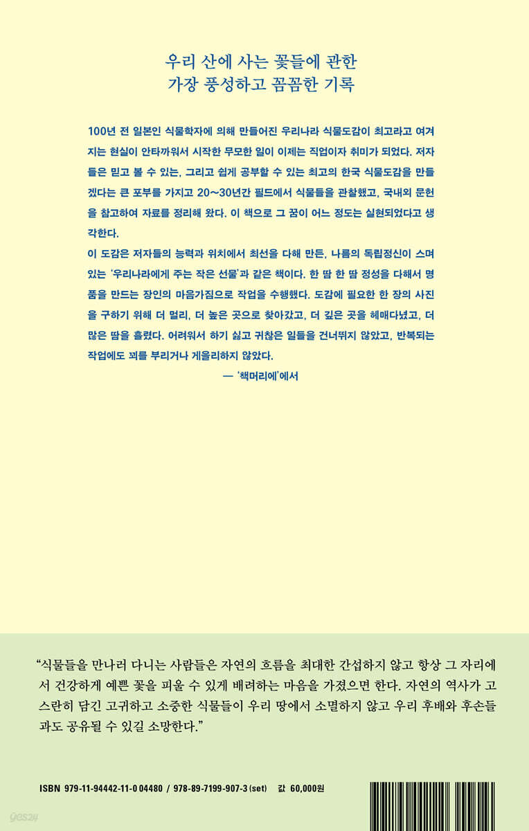 가장 풍성하고 꼼꼼한 기록 “100년 전 일본인 식물학자에 의해 만들어진 우리나라 식물도감이 최고의 도감이라고 여겨지는 현실이 안타까워서 시작한 무모한 일이 이제는 직업이자 취미가 되었다. 저자들은 믿고 볼 수 있는, 그리고 쉽게 공부할 수 있는 최고의 한국 식물도감을 만들겠다는 큰 포부를 가지고 20~30년간 필드에서 식물들을 관찰했고, 국내외 문헌을 참고하여 자료를 정리해 왔다. 『한국의 산꽃』의 발간으로 그 꿈이 어느 정도는 실현되었다고 생각한다.” ― ‘책머리에’ 100년 전 일본인 식물학자에 의해 만들어진 식물도감이 한국 최고의 도감으로 여겨지던 시기는, 『한국의 산꽃』이 출간됨으로써 이제 완전히 막을 내리게 되었다. 한국인 스스로에 의한 최고의 한국 식물도감을 만들겠다는 큰 포부로 30년간 한반도 전역과 주변 지역을 누비며 ‘어려워서 하기 싫고 귀찮은 일들을 건너뛰지 않고, 반복되는 작업에도 꾀를 부리거나 게을리하지 않았던’ 우리 연구자들의 성실하고 꾸준한 노력은 비로소 이 책을 통해 집대성되었다. 그 바탕에는 “자연의 역사가 고스란히 담긴 고귀하고 소중한 식물들이 우리 땅에서 소멸하지 않고 우리 후배와 후손들과도 공유될 수 있길 소망”하는 저자들의 꽃과 식물, 한반도와 지구의 생명에 대한 귀한 사랑이 담겨 있다. 그렇기에 풍성하고 꼼꼼하게, 새로운 식물들의 식생을 발견하는 기쁨과 함께, 때로는 희귀식물들이 자생지에서 소멸해 가는 모습을 안타까운 마음으로 기록하며 이 거대한 작업에 임할 수 있었던 것이다. 한국 최고의 필드용 식물도감의 출간과 함께, 연구자와 애호가들의 산행과 관찰, 조사는 한 단계 더 풍성해질 것이다. 『한국의 산꽃』이 “우리나라에게 주는 작은 선물”인 동시에 오랫동안 이 책의 출간을 기다린 많은 독자들에게도 반가운 선물인 이유다. 저자의 말 “그간 주변의 많은 분들이 『한국의 산꽃』이 언제 발간되는지 궁금해했고 출간을 고대하였다. 지인뿐만 아니라 처음 뵙는 『한국의 나무』나 『한국의 들꽃』의 독자들께서 건네는 인사말 중 하나가 ‘『한국의 산꽃』은 언제 나오나요?’였다. 이러한 기대와 응원은 저자들이 음침한 숲속이나 갑갑한 컴퓨터 앞에서의 고된 작업을 즐겁게 할 수 있게 하는 원동력이 되어 주었다.” “아마 오래전부터 식물 공부를 하신 분들의 대부분은 외국 도감, 특히 일본의 식물도감을 신뢰하며 동정에 참고하였을 것이다. 저자들도 마찬가지였다. 지금도 가장 가까운 자리에 꽂아둔 책이 일본의 식물도감류들이다. 100년 전 일본인 식물학자에 의해 만들어진 우리나라 식물도감이 최고의 도감이라고 여겨지는 현실이 안타까워서 시작한 무모한 일이 이제는 직업이자 취미가 되었다. 저자들은 믿고 볼 수 있는, 그리고 쉽게 공부할 수 있는 최고의 한국 식물도감을 만들겠다는 큰 포부를 가지고 20~30년간 필드에서 식물들을 관찰했고, 국내외 문헌을 참고하여 자료를 정리해 왔다. 『한국의 산꽃』의 발간으로 그 꿈이 어느 정도는 실현되었다고 생각한다.” “이 도감은 저자들의 능력과 위치에서 최선을 다해 만든, 나름의 독립정신이 스며 있는 ‘우리나라에게 주는 작은 선물’과 같은 책이다. 한 땀 한 땀 정성을 다해서 명품을 만드는 장인의 마음가짐으로 도감 작업을 수행했다. 어려워서 하기 싫고 귀찮은 일들을 건너뛰지 않았고, 반복되는 작업에도 꾀를 부리거나 게을리하지 않았다.” “무엇보다도 식물들을 만나러 다니는 사람들은 자연의 흐름을 최대한 간섭하지 않고 항상 그 자리에서 건강하게 예쁜 꽃을 피울 수 있게 배려하는 마음을 가졌으면 한다. 자연의 역사가 고스란히 담긴 고귀하고 소중한 식물들이 우리 땅에서 소멸하지 않고 우리 후배와 후손들과도 공유될 수 있길 소망한다.” - 책머리에 중에서 |
