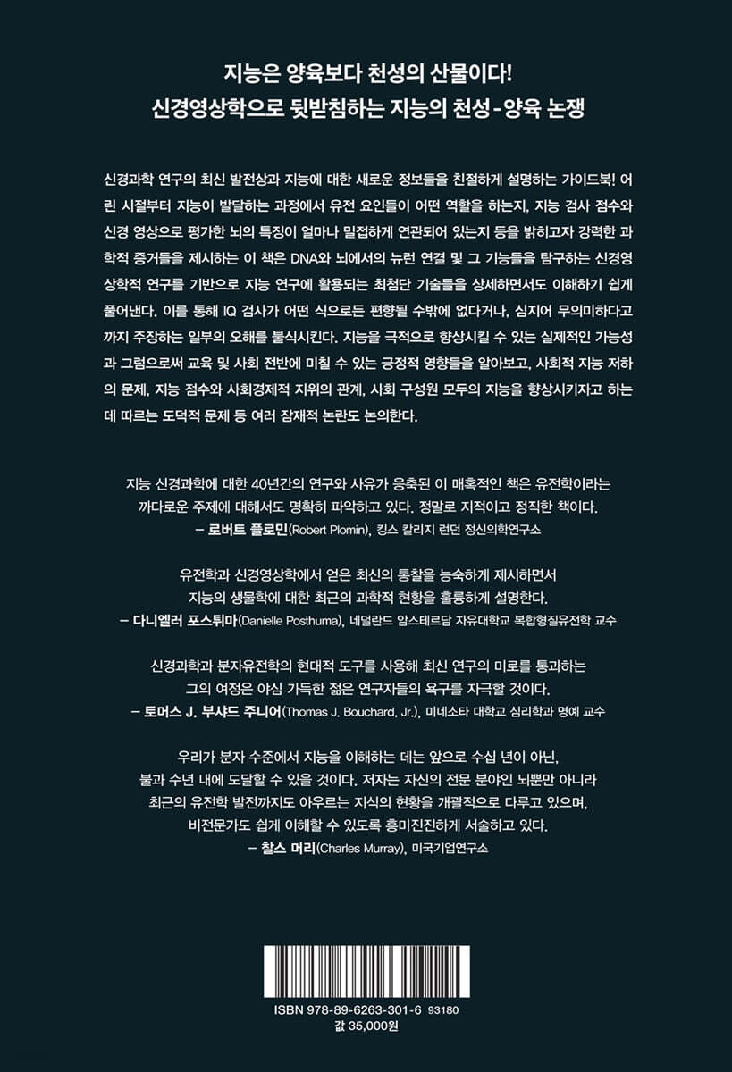 지능 신경과학에 대한 40년간의 연구와 사유가 응축된 이 매혹적인 책은 유전학이라는 까다로운 주제에 대해서도 명확히 파악하고 있다. 정말로 지적이고 정직한 책이다. - 로버트 플로민 (킹스 칼리지 런던 정신의학연구소)
