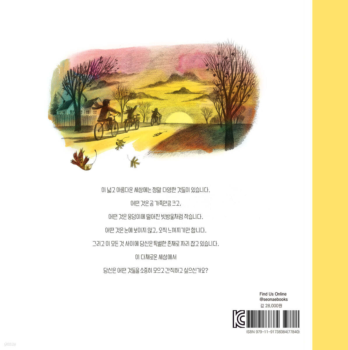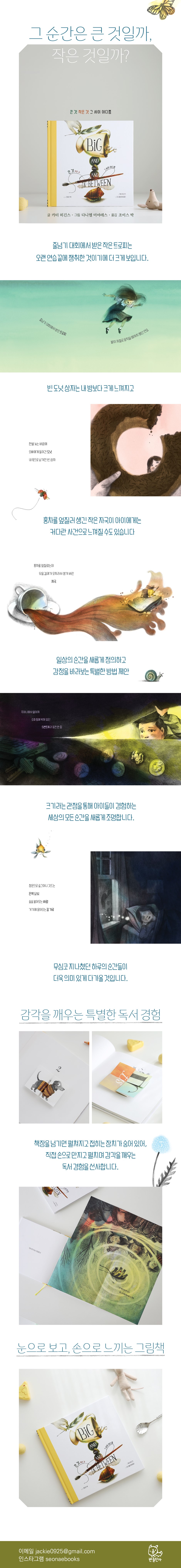 아이들이 만들어가는 세계 이 아름다운 그림책에는 누구나 겪음직한 많은 순간이 ‘크기’를 기준으로 분류되어 있습니다. 실제 형태의 크기라기보다는 그 순간 느낀 감정에 대한 것입니다. 홍차를 엎질러 생겨버린 작은 자국은 아이에게는 크게만 보이고, 엄마 잔소리에 말끔히 정리한 방은 작게만 느껴집니다. 빈 도넛 상자는 내 방보다 크게 느껴질 테고, 아침에 나를 깨우는 햇살은 그보다 더 크게 느껴지겠지요. 『큰 것 작은 것 그 사이 어디쯤』은 시적 표현과 아름다운 그림으로 아이들이 느끼는 감정은 물론 아이들이 발견해내는 세상을 다채롭게 보여줍니다. 아이들은 나비가 목을 축일 정도로 작은 웅덩이, 흙을 비집고 고개를 내민 연둣빛 싹 같은 작은 것들을 발견하고, 코끼리와의 티 파티를 상상하며 세상을 만들어가지요. 작가는 이렇게 아이들이 매일 새롭게 발견하는 순간들과 그 순간들에 대한 아이들의 감정을 하나하나 나열하며 독자의 시선을 오래 머물게 하고, 무심코 흘려보낸 오늘의 장면들이 새롭게 정의되는 선물 같은 기분을 느끼게 합니다. 무대에 섰을 때 자신을 뒤덮을 듯 커다랗게만 느껴졌던 정적이 손톱만큼도 느껴지지 않게 되는 변화를 겪으며 아이는 성장하게 될 것입니다. 줄넘기 대회에서 받은 트로피는 대회에서 발이 절로 움직일 정도로 땀 흘려 연습했던 시간들에 비례해 그 크기가 점점 커진다는 것을, 모래성을 만들기 위해 뜬 첫 삽이 결국엔 커다란 구멍으로 이어질 거라는 사실을 깨달으며 어른이 되어가겠지요. 아이들은 ‘큰 것 작은 것 그 사이 어디쯤’을 분주히 오가며 계속 자신들의 세상을 만들고 넓혀갈 것입니다. 오늘 여러분은 어떤 순간들을 모았나요? 어떤 발견을 했고, 어떤 마음을 가졌을까요? 이 책이 알려주는, 순간들을 포착하고 자신의 감정을 정의하는 특별한 방법을 통해, 여러분의 하루는 더욱 풍성해질 것입니다. |