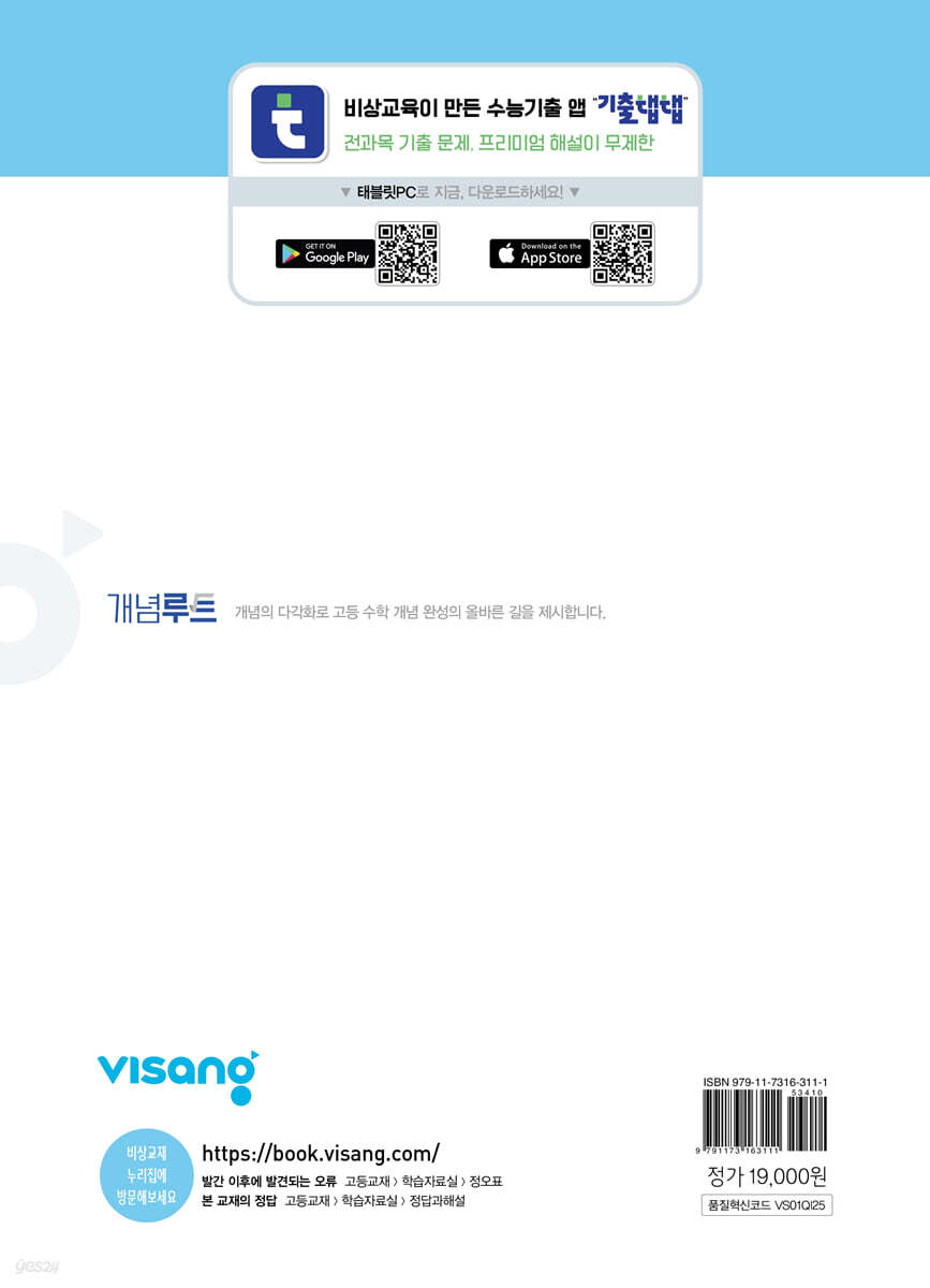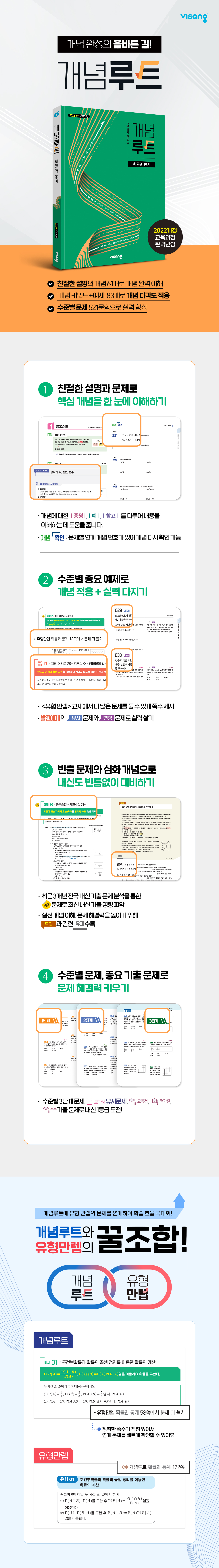 “개념 부분은 보기 쉽게, 읽기 쉽게 정리하고 개념을 이해하는 데 빠지는 내용이 없도록 하는 데 중점을 두었습니다. 거기에 더하여 실전 문제를 풀 때 알아야 할 내용이 있다면, 그런 부분들도 개념 정리 부분에 녹아 있도록 실전형 개념으로 구성하였습니다.” [예제에서 익힐 핵심 개념과 예제의 세트 구성& 충분한 수의 유제] “개념서의 핵심이면서, 가장 많은 부분을 차지하는 예제와 유제 부분을 기존 교재들과 차별화하고자 노력을 많이 했습니다. 문제가 나오기 전에 제시되는 실전 개념키워드는 핵심 개념을 짚어주면서, 힌트도 될 수 있고, 중요 내용에 대한 기억을 강화하는 역할도 합니다. 예제 풀이에서도 핵심 내용을 강조 표시하여 서술형 풀이 작성 때 놓치지 말아야 할 부분들을 한눈에 알 수 있습니다. 혼자 공부하는 학생들도 쉽게 이해할 수 있도록 다른 교재들보다도 더 상세한 풀이를 제시하였습니다. 학습자가 문제를 풀어야 하는 유제 코너는 책의 오른쪽 페이지로 고정 구성하면서 여백을 넉넉하게 2단 구성하여 사용하기 편리하게 구성하였습니다.” [넓고 깊게, 수학적 이해도를 UP 시켜주는 특강] “교육과정에서 다루고 있지 않지만 알아 두면 개념 이해에 도움이 되고 문제 해결이 쉬워지는 내용을 다루고, 필요한 경우 유제를 제시하여 연습을 해볼 수 있도록 하였습니다.” [단계별 연습문제를 통해 해당 단원 개념을 완벽히 습득하고 적용] “1단계 기본 문제를 통해 배운 내용을 확인하고 2단계 실전 문제로 배운 내용을 응용하고 3단계 고난도 문제로 문제 해결력을 기를 수 있도록 구성하였습니다. 단계별 문제 번호색이 노랑, 파랑, 초록으로 한눈에 구별할 수 있어 필요에 따라 선택적으로 사용하기에도 편리하게 하였습니다. 최신 문제들로 채워진 연습문제를 통해 개념 학습을 완벽하게 마무리하고 내신 1등급으로 향하는 발판을 마련할 수 있게 합니다.” [친절한 정답과 해설] “본책 뒤 빠른정답 코너에서 답을 모아 제시하여, 푼 문제에 대한 채점을 보다 편리하게 할 수 있습니다. 교재 전체의 문제의 번호가 이어져 있어 정답을 찾기에 편리합니다. 별책인 정답과 해설에서 오답 풀이를 스스로 해결할 수 있도록 자세한 풀이를 실었고, 사고력이 필요한 문제에서는 풀이 앞에 접근방법을 제시하여 문제를 어떻게 해석하여 풀어 나갈 수 있는지 제시하였습니다.” 개념의 다각화로 고등 수학 개념 완성의 올바른 길을 제시합니다. -개념 루트! 친절한 설명의 개념 61개로 개념 완벽 이해 -적용 루트! ‘개념 키워드+예제’ 83개로 개념 다각도 적용 -실력 루트! 수준별 문제 521문항으로 실력 향상 |