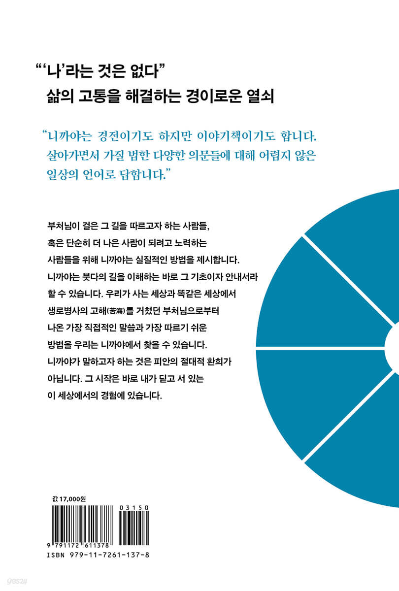 1. 니까야를 우리는 왜 알아야 할까 불타가 아닌 붓다와의 인도적 만남 고민 해결사 부처님께 직접 듣는다 2. 니까야는 왜 만들어졌을까 자유를 찾아 나선 사람들 인도의 암송 문화와 니까야의 문서화 초기불교는 어떻게 알려졌나 3. 니까야가 말하고자 하는 것은 무엇일까 사람으로 태어나 발 딛고 있는 이 자리에서 진리는 동굴… 세상과 나를 만드는 다섯 가지, 열두 가지, 그리고 열여덟 가지 정말 내가 없다는 말인가 네 가지 성스러운 진리 고통의 본질 세상이 굴러가는 방식 바른 선택을 할 수 있는 힘 4. 니까야에서 우리는 무엇을 배울 수 있을까 만들어진 세상과 까르마의 작용 원리 때에 맞는 말의 위력 |