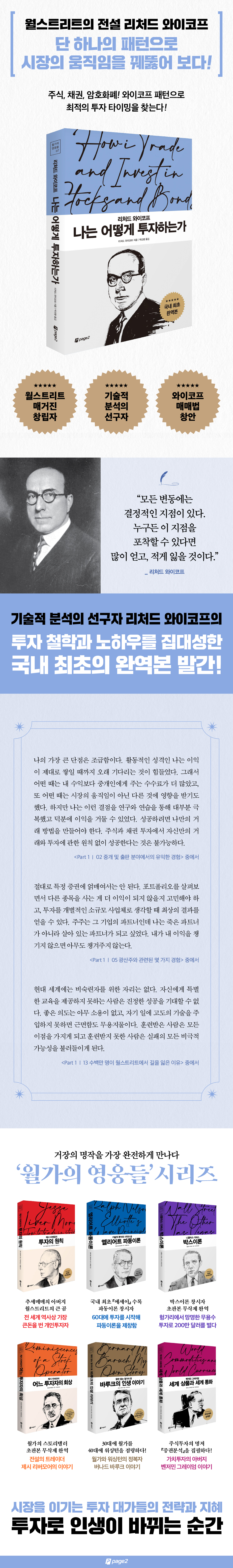 “숫자를 보면 시장의 투자 심리가 보인다”주식투자는 투자자의 마음을 먼저 읽는 사람이 이긴다리처드 와이코프는 이 책을 통해 주식 및 채권 투자와 거래의 기본 원칙을 체계적으로 정리하고자 했다. 그는 성공적인 투자자가 되기 위해서는 단순한 지식뿐만 아니라 실전 경험과 시장의 원리를 깊이 이해해야 한다고 강조하면서 많은 투자자들이 주식과 채권 투자 시장에서 지속적인 성과를 낼 수 있도록 실용적인 전략을 제시하고 있다.이 책은 크게 두 개의 부로 구성되어 있다. [PART 1 주식 및 채권 거래와 투자 방법]에서는 성공적인 주식 및 채권 투자를 위한 기본 원칙과 전략을 설명한다. 시장의 움직임을 분석하고, 장기적인 자산 보호 및 증식을 위한 투자 방법을 제시하며, 투자 기회를 발굴하는 방법과 리스크 관리 및 심리적 요소의 중요성을 강조한다. 또한, 차트 및 테이프 리딩 기법을 활용한 데이터 기반 접근법으로 투자자의 실수를 줄이고 안정적인 포트폴리오를 구성하는 방법을 제시한다.[PART 2 데이 트레이더의 바이블]에서는 데이 트레이딩을 위한 핵심 기술과 전략을 다룬다. 테이프 리딩의 개념과 실시간 시장 데이터를 활용한 트레이딩 기법을 설명하고, 거래량 분석, 차트 활용, 추세 분석 등을 통해 최적의 매매 타이밍을 포착하는 방법을 제시한다. 또한 효과적인 트레이딩 규칙과 리스크 관리 전략을 강조하면서 초보자들이 흔히 저지르는 실수를 분석한다. 더불어 단기 및 장기 투자 비교, 시장 변동성 대응, 손실 최소화 기법 등 실전 트레이딩에 적용할 수 있는 다양한 기술적 분석 방법을 소개한다.“20세기 주식투자법이 21세기에도 각광받는 이유”테이터에서 수급의 역학과 시장의 흐름을 읽어내는 방법오늘날 금융 시장은 더욱 복잡하고 빠르게 변화하고 있지만, 와이코프의 시장 분석과 투자 원칙은 여전히 유효하다. 특히, 시장 참여자들의 심리를 반영한 와이코프 패턴(Wyckoff Pattern)은 현대 트레이더들에게도 중요한 가이드라인을 제공하며, 기술적 분석을 활용하는 투자자들에게 필수적인 전략으로 자리 잡고 있다. 특히 암호화폐 시장에서 그의 와이코프 패턴(Wyckoff Pattern)이 투자자들에게 주목받고 있는 것을 주목해야 한다.와이코프 기법은 가격 변동의 핵심인 매집(Accumulation)과 분배(Distribution) 단계를 분석하여 시장의 흐름을 예측하는 전략으로, 변동성이 큰 암호화폐 시장에 적합하다는 평가를 받고 있다. 특히, 비트코인과 알트코인의 급격한 가격 변동 속에서 대형 투자자(고래)의 움직임을 파악하는 데 유용하다는 점에서 개인 투자자들에게 인기를 끌고 있으며, 전문가들은 와이코프 패턴을 활용하면 펌핑(Pump)과 덤핑(Dump) 같은 인위적인 가격 조작에도 휩쓸리지 않고 보다 전략적인 투자 결정을 내릴 수 있다고 조언한다. 20세기에 창안된 패턴과 매매법이 21세기에도 유용하게 활용되고 있는 이유를 직접 확인해보길 바란다.