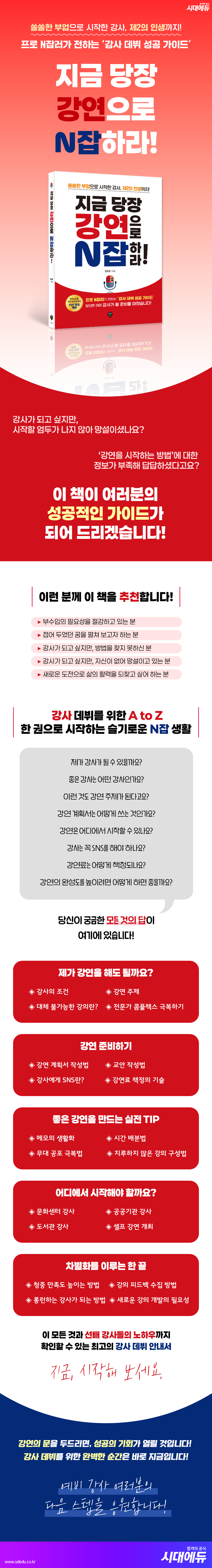 들어가는 글│N잡의 시대, 강사가 되고 싶다고요?PART 1│누구나 강연을 할 수 있다어떤 사람이 강사가 될까?내향적인 사람도 강연을 할 수 있나요?이런 것도 강연 주제가 된다고?대체 불가능한 강의 만들기전문가 콤플렉스 극복하기선배 인터뷰 1) 본업의 전문성을 바탕으로 인사이트를 전하는 전안나 대표PART 2│강연 준비 A to Z강연의 첫걸음, 강연 계획서 작성하기누구나 쉽게 따라하는 교안 작성법보여지는 것도 중요하다강사에게 SNS는 필수일까?초보 강사를 위한 강연료 책정의 기술선배 인터뷰 2) 블로그를 통해 관심사를 탐구하다 전문가로 거듭나게 된 김나연(요니나) 작가PART 3│좋은 강연을 만들기 위한 실전 TIP 경험이 재산이다! 메모의 생활화 무대 공포, 어떻게 극복할 것인가? 많이 봐야 빨리 는다 전달력을 높이기 위한 끊어 읽기 연습 지루함을 타파하는 강의 구성법 예상치 못한 질문에 대처하기 시간 배분, 강의의 완성도를 좌우한다 선배 인터뷰 3) 같은 길을 걷고자 하는 이들에게 동기부여 강의로 용기를 북돋아 주는 최선영 평론가 PART 4│나에게 맞는 무대 찾기청소년 대상 강의의 특징과 맞춤 전략 성인 대상 강의의 특징과 맞춤 전략 문화센터 강사 도전하기 공공기관 강사 도전하기 도서관 강사 도전하기 셀프 강연 도전하기 선배 인터뷰 4) 작가로서의 삶을 살다 강의로 전문 영역을 넓힌 이지니 작가 PART 5│롱런하는 강사, 차별화를 이루는 한 끝섭외 담당자가 말하는 좋은 강사란? 청중의 만족도에 사활을 걸어야 하는 이유 롱런하는 강사는 책을 쓴다 강연은 늘 최신성을 갖추어야 한다 강의 피드백을 수집하는 세 가지 방법 새로운 강의를 개발해야 하는 이유 선배 인터뷰 5) 현업 웹소설 작가로서 예비 작가를 위한 다회차 강의를 제공하는 태린 작가 마치는 글│두드려라, 그러면 열릴 것이다