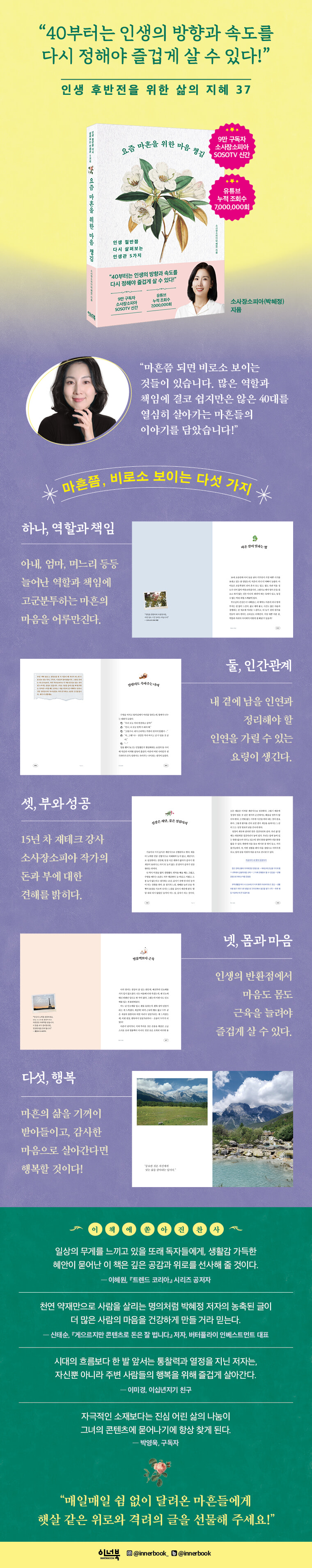 마흔쯤, 비로소 보이는 것들인생 후반전을 위한 삶의 지혜 37삶의 무게를 가장 무겁게 느끼는 나이 마흔에 이르렀다. 세상일에 정신을 빼앗겨 판단을 흐리는 일이 없는 나이, 마흔을 가리켜 불혹(不惑)이라 했건만, 마흔이 지나도 여전히 실수투성이에 미성숙한 결정을 내리기도 한다. 마흔이 되었다고 갑자기 삶의 지혜가 샘솟는다거나 인생을 깨우쳤다거나 하는 건 없었다. 그럼에도 삶을 받아들이고 남은 시간도 잘 지내려면 스스로를 보듬고 나아가야 한다.10만 구독자의 〈소사장소피아 SOSOTV〉로도 잘 알려진 박혜정 저자의 신간 『요즘 마흔을 위한 마음 챙김』은 인생의 중턱에서 점점 무거워지는 삶의 무게와 그 안에서 여전히 흔들리는 인생을 살고 있는 마흔들을 위한 진한 위로와 공감의 말을 전한다. 특히 이 책을 통해 독자들은 역할과 책임, 인간관계, 부와 성공, 몸과 마음, 행복에 관련된 37가지의 글을 통해 따뜻한 위로와 응원, 삶의 지혜를 얻게 될 것이다. “당신의 노력을 존중하세요. 당신 스스로를 존중하세요. 자존감은 자제력을 낳습니다. 이 둘을 모두 겸비한다면, 진정한 힘을 갖게 됩니다.” _클린트 이스트우드마흔, 나를 다시 찾는 시간인생 절반쯤 다시 살펴보는 인생관 5가지20~30대 때는 무조건적으로 성과를 향해 달렸다면, 지금은 자신의 한계와 상황을 인정하고 받아들여야 한다. 부모의 역할을 하면서 같이할 수 있는 일, 가정과의 균형을 지키면서도 할 수 있는 일을 선택하게 된다는 저자는 큰 야망을 보고 달렸던 젊은 시절과 달리 작은 것 하나에 집중하고, 인맥을 넓히는 대신 만나는 한 사람의 인연을 소중하게 대하려고 한다. 늘어나는 커리어와 역할 사이에서 잘해 나가기 위해 가장 필요한 것은, 결국 자신에게 집중하는 것이다. 스스로 삶에서 무엇을 중요하게 여기고, 어떤 것을 잘하고 좋아하는지, 어떤 상황이 힘든지 등등 자신을 더 잘 알수록 성과도 좋아진다고 말한다. 너무 많은 책임과 일들로 인하여 정신이 없을수록 자신을 만나는 시간을 가져보자. 이 책을 통해 독자들은 잊고 있던 자신을 찾고 조금 더 스스로를 발견하게 될 것이다.