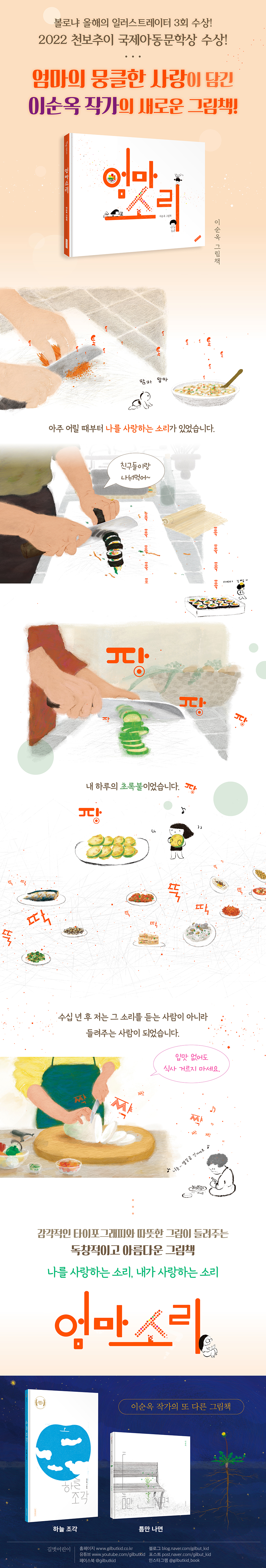 도마를 무대로 쌓아 올린 엄마의 사랑, 그리고 뭉클한 성장의 순간들. 아주 어릴 때부터, 사랑이 담긴 소리가 있었습니다. 야채를 ‘톡톡톡’ 곱게 다져 이유식을 만들던 때부터 들려오던 이 도마 소리는 아이가 학교에 입학하고 청소년기를 거쳐 어른이 될 때까지 모든 성장의 순간 멈춘 적이 없습니다. 생일마다 ‘당 당 당’ 마늘을 빻아 진하게 끓여 주신 미역국은 나를 당당하게 만들었고 ‘스윽’ 고기를 손질하고 버섯을 ‘똑똑’ 큼직하게 썰어 만들어 낸 엄마표 갈비찜은 나를 힘 나게 했습니다. 추운 겨울 ‘드르륵’ 만두피를 만들어 뜨끈하게 찐 만두와 ‘써억’ 시원하게 썰리는 김치도 빼놓을 수 없습니다. “엄마가 김밥 많이 싸 줄 테니까 친구들이랑 나눠 먹어.”라며 건넨 소풍 도시락에는 정성이 가득합니다. 이렇듯 도마에서 울려 퍼지는 수많은 ‘엄마소리’에는 건강하고 행복하기를 바라는 마음이 담겨 있습니다. ‘내 삶을 응원하던 소리. / 내 몸에 켜켜이 새겨진 소리.’ (본문41-43) 시간이 흘러 엄마의 바람대로 잘 자라 나도 엄마가 되었습니다. 이제 엄마를 위해 도마 앞에 섰습니다. 엄마에게 받은 사랑이 한 겹 한 겹 내 몸에 새겨져 ‘콩 콩’ 심장을 타고 흐릅니다. 나를 키워 낸 그 소리가 내 손끝에서도 울려 퍼집니다. 엄마에서 나에게로, 그리고 이제 다시 엄마에게로. “나를 사랑한 소리, 내가 사랑을 하는 소리!” “너 좋아하는 반찬 해 놨어. 아픈 데 없는 거지? 애들은 밥 잘 먹고?” 세월이 흘러 어른이 된 뒤에도 나와 내 가족을 위해 손에 들려 주시던 반찬에는 한결같은 엄마의 사랑이 담겨 있습니다. 넘치도록 다정하고 너른 엄마의 마음에 가슴이 뭉클해져 옵니다. 그리고 오늘, 엄마가 나를 위해 들려주었던 소리를 엄마에게 들려드리려 합니다. “엄마, 뭐 드시고 싶어요?” “입맛 없어도 식사 거르지 마세요.” “다 됐다. 엄마, 얼른 오세요.” (본문45-53) 밥상에서 김이 모락모락 피어오릅니다. 작아진 엄마를 모시고 앉은 식탁에는 엄마의 건강을 바라며 차린 맛있는 음식이 정갈하게 놓여 있습니다. 지금까지 엄마에게 받은 사랑이 이렇게 다시 엄마에게로 이어집니다. 《엄마소리》에 적힌 문장들에는 실제로 엄마가 할 법한 걱정과 위로, 진심이 녹아 있습니다. 그도 그럴 것이 작가는 요리를 하던 자신에게 다가와 ‘엄마소리’ 참 좋다던 딸의 말을 듣고 이 책을 구상했다고 합니다. 자신이 아이였던 시절과 엄마였던 순간이 딸의 ‘엄마소리’라는 말로 이어졌던 것이지요. 작가는 또한 ‘엄마’라는 존재를 넘어 아이들을 사랑으로 키우는 모든 양육자의 소리를 ‘엄마소리’라는 말에 담고자 했습니다. 이토록 다정한 그림책, 《엄마소리》를 읽어 보세요. 사랑을 담은 소리가 ‘톡 톡’ 우리 모두의 마음을 두드립니다. 감각적인 타이포그래피와 따뜻한 그림이 빚어낸 독창적이고 아름다운 그림책! 이순옥 작가는 볼로냐 ‘올해의 일러스트레이터’에 3회 선정되고 천보추이 ‘국제아동문학상’을 수상한 세계 무대에서 주목받는 작가입니다. 《하늘 조각》에서는 ‘하늘’을 단순한 배경이 아닌 인식의 영역으로 다루어 ‘보다’라는 감각을 확장시켰고, 《틈만 나면》에서는 좁은 틈에서 자라는 들풀의 생명력에 주목해 독자들에게 진한 위로와 안부를 건네며 많은 사랑을 받았지요. 이번 《엄마소리》에서는 말 그대로 도마에서 울려 퍼지던 소리 속에 양육자의 마음을 감각적으로 담아냈습니다. 그림책에서 단연 돋보이는 것은 오렌지빛 타이포그래피입니다. 소리글자인 한글을 활용한 타이포그래피가 주방에서 들려오는 다양한 소리를 시각적으로 구현해 리듬감 있게 전달합니다. 여기에 따뜻하고 정감 있는 그림과 진심이 꾹꾹 눌러 담긴 글이 더해져 이야기가 차곡차곡 쌓여 갑니다. 밝고 경쾌한 색감의 ‘엄마소리’를 따라가다 보면 긴 세월 동안 한결같았던 엄마의 사랑을 만나게 되지요. 이순옥 작가만이 할 수 있는 독창적인 방식으로 풀어낸 이 그림책은 엄마의 사랑을 잔잔하게 때로는 밝고 화사하게 전달합니다. 또한 작가는 세월이 흐르는 동안 도마에 새겨진 무수한 칼선을 책 곳곳에 숨겨 두었습니다. 그림책을 좋아하는 독자들이라면 표지와 면지, 본문에서 ‘엄마소리’에 새겨진 흔적을 새롭게 발견하게 될지 모릅니다. 긴 시간 동안 켜켜이 쌓여 온 엄마의 소리, 그 아름다운 울림을 《엄마소리》에서 만나 보세요. 정겨운 사랑의 소리가 들려오는 것만 같습니다. [작가의 말] 누군가를 위해 울리는 그 소리를 ‘엄마소리’라 불러 봅니다. 어릴 적 이불 속에서 ‘엄마소리’를 들으며 행복감을 느낀 기억이 있습니다. 수십 년 후 저는 그 소리를 듣는 사람이 아니라 들려주는 사람이 되었습니다. 제가 만드는 소리를 듣고 어느 날, 아이가 다가와 말을 합니다. ‘엄마소리’가 참 좋다고. 이 책은 그날부터 시작되었습니다. [교과연계] 국어 2학년 1학기 8. 마음을 짐작해요 국어 3학년 2학기 9. 작품 속 인물이 되어 국어 4학년 1학기 10. 인물의 마음을 알아봐요 미술 5학년 2. 표현과 창작의 세계 |