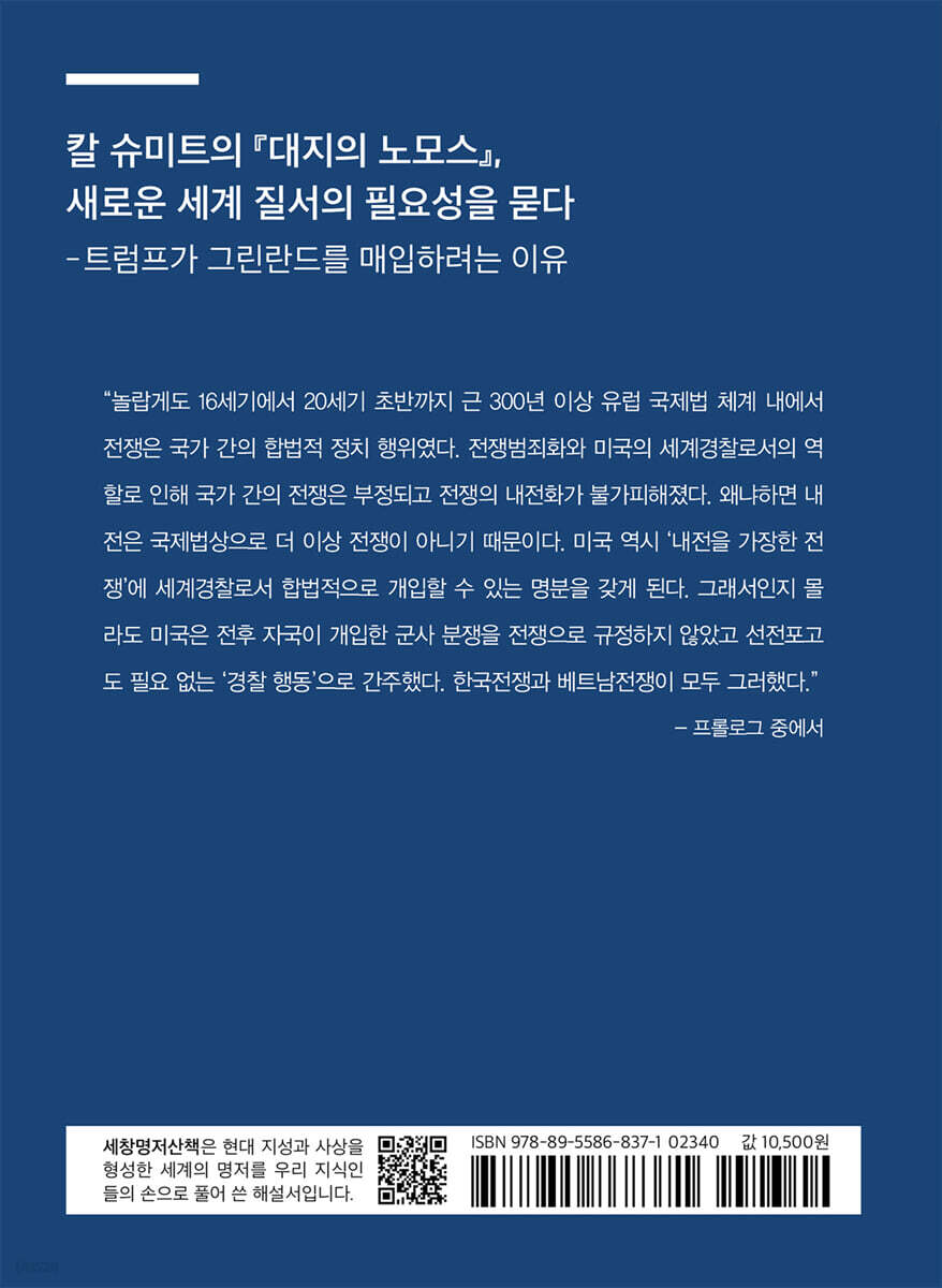 제1장 ‘대지의 노모스’로서의 국제법 017 1. 법이 탄생하는 근원적 공간으로서의 대지 018 2. ‘대지의 노모스’란 무엇인가? 025 제2장 신세계의 육지 취득과 경계선 사고 035 1. 국제법 창설 과정으로서의 육지 취득 035 2. 국제법의 토대로서의 경계선 사고 039 3. 신세계 육지 취득에 대한 정당화: ‘발견’과 ‘점유’ 057 제3장 유럽 공법의 국제법의 구성 요소 071 1. 포괄적 공간질서 072 2. 국가 형태의 전쟁에 의한 내전의 극복: ‘정당한 적’과 ‘정당한 전쟁’ 개념 076 3. 전쟁의 제한과 세력균형 079 4. 두 개의 공간질서: 육지와 자유로운 해양 083 5. 영국, 해양적 존재로의 이행 088 6. 육전과 해전의 차별성 096 제4장 유럽 국제법의 이론과 현실 101 1. 유럽 국제법상의 영토 변경의 의미 105 2. 유럽 국제법상의 강대국의 지위와 역할 111 3. 영토 변경의 두 가지 차원: 문명의 유럽과 야만의 비유럽 119 제5장 새로운 대지의 노모스 131 1. 최후의 육지 취득과 유럽 공법의 해체 133 2. 서반구라는 경계선의 등장과 새로운 대지의 노모스 139 3. 국가 승인에 관한 국제법상의 의미 변화: ‘불승인주의’ 143 4. 국제연맹과 대지의 공간질서 문제 154 5. 미국의 공식적 부재와 실효적 현존이 초래한 공간무질서 160 6. 전쟁의 의미 변화: 전쟁범죄화로의 길 172 7. 공간의 의미 변화: 현대적 파괴수단으로서의 전쟁 216 에필로그 223 참고문헌 236 |