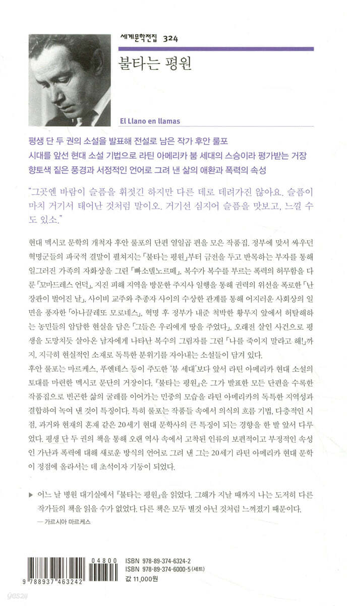 시대를 앞선 현대 소설 기법으로 라틴 아메리카 붐 세대의 스승이라 평가받는 거장 향토색 짙은 풍경과 서정적인 언어로 그려 낸 삶의 애환과 폭력의 속성 ▶ 어느 날 병원 대기실에서 『불타는 평원』을 읽었다. 그해가 지날 때까지 나는 도저히 다른 작가들의 책을 읽을 수가 없었다. 다른 책은 모두 별것 아닌 것처럼 느껴졌기 때문이다. ―가르시아 마르케스 ▶ 룰포의 소설은 20세기 세계 문학의 걸작 중의 하나일 뿐 아니라, 영향력이 가장 큰 작품 중의 하나이다. ―수전 손택 ▶ 『불타는 평원』은 멕시코 민중들의 삶, 그리고 그들이 살고 있는 땅과 깊이 연관된 인물들에 대한 잊을 수 없는 이야기로, 라틴 아메리카 문단의 가장 중요한 작품 중 하나이다. ―《뉴욕 타임스》 불우한 개인적 경험을 바탕으로 민중의 삶을 생생하게 재현한 작품집 현대적인 소설 기법과 향토색 짙은 문체로 창조한 삶의 애환과 폭력의 속성 후안 룰포는 1917년 멕시코 아뿔꼬에서 태어나 양친이 일찍 사망한 이후 불우한 어린 시절을 보냈다. 정치적 혼란기까지 더해져 학업조차 제대로 마치지 못한 그는 문학에 관심을 갖게 된다. 생계를 위해 회사에 다니면서 틈틈이 집필한 단편을 모아 1953년 『불타는 평원』이라는 제목으로 출간한 데 이어 1955년 장편소설 『뻬드로 빠라모』를 발표해 거장의 반열에 오른다. 『불타는 평원』에서는 20세기 초반 혼란스러운 멕시코의 사회상이 생생하게 형상화된다. 지도자들의 내분과 부르주아 권력에 휘둘리며 고통스러운 삶을 이어 가던 민중들은 삶의 터전을 포기한 채 산업화가 진행되는 대도시로 떠나고, 남은 자들은 가난과 폭력을 숙명으로 받아들이며 비참한 삶을 살아간다. 정부에 맞서 싸우던 혁명군들의 파국적 결말이 펼쳐지는 「불타는 평원」부터 금전을 두고 반목하는 부자를 통해 일그러진 가족의 자화상이 담긴 「빠소델노르떼」, 어린 소년의 독백을 통해 비참하리만치 빈곤한 가족의 비극을 그린 「우리는 너무 가난하답니다」, 복수가 복수를 부르는 폭력의 허무함을 다룬 「꼬마드레스 언덕」, 지진 피해 지역을 방문한 주지사 일행을 통해 권력의 위선을 폭로한 「난장판이 벌어진 날」, 사이비 교주와 추종자 사이의 수상한 관계를 통해 어지러운 사회상의 일면을 풍자한 「아나끌레또 모로네스」, 혁명 후 정부가 내준 척박한 황무지 앞에서 허탈해 하는 농민들의 암담한 현실을 담은 「그들은 우리에게 땅을 주었다」, 오래전 살인 사건으로 도망치듯 평생을 살아온 남자에게 나타난 복수의 그림자를 그린 「나를 죽이지 말라고 해!」까지, 『불타는 평원』에는 지극히 현실적인 소재로 독특한 분위기를 자아내는 소설들이 담겨 있다. 고통스러운 운명에 굴복하며 살아기는 민중들의 삶을 포착하고 직시한 룰포는 향토색 짙고 건조한 특유의 문체와 연극적인 대사로 담담히 묘사해 나간다. 20세기 라틴 아메리카 문학의 효시이자 산파, 후안 룰포 현대 라틴 아메리카 문단은 노벨 문학상 수상 작가를 여러 명 배출하는 등 걸출한 성과를 이루어 냈다. 룰포는 이 년이라는 짧은 시간 동안 집중적으로 발표한 두 권의 소설을 통해 후배 작가들의 문학 작품에 영감을 제공하는 산파 역할을 했다. 그가 구사한 소설 기법, 특히 의식의 흐름이나 내적 독백, 플래시백, 페이드아웃, 시간과 시점의 혼재 등의 새롭고 독창적인 기법들은 흔히 포크너와 비교되며, 이후 많은 현대 작가들에게 다양한 방식으로 뿌리를 내렸다. 특히 ‘마술적 리얼리즘’의 대가 가르시아 마르케스의 『백년의 고독』의 배경이 된 마술적인 장소 ‘마콘도’가 룰포의 『뻬드로 빠라모』의 ‘꼬말라’에서, 그리고 그 이전에 이미 『불타는 평원』 속 단편 「루비나」의 배경 ‘루비나’에서 영향을 받은 것이라는 일화는 역시 알려져 있다. 수전 손택은 “룰포의 소설은 20세기 세계 문학의 걸작 중의 하나일 뿐 아니라, 영향력이 가장 큰 작품 중의 하나”라고 평가했으며, 가르시아 마르케스는 “300쪽도 안 되는 분량임에도 꽉 찬 것 같은 그의 작품은 소포클레스에 대해 우리가 아는 만큼이나 오래 지속될 것”이라고 평가했다. 또한 르 클레지오는 2008년 노벨 문학상 수상 연설에서 자신에게 영감을 준 작가에 후안 룰포를 손꼽기도 했다. 후안 룰포가 쓴 열일곱 편의 단편은 시대를 넘어 혁명적인 창작 기법과 인상적인 상징성을 기반으로 전 세계 오십여 개 언어로 번역되었으며, 영화와 연극으로도 새롭게 창작되는 등 이후 문학과 예술 사회에 끊임없는 영향을 주고 있다. |