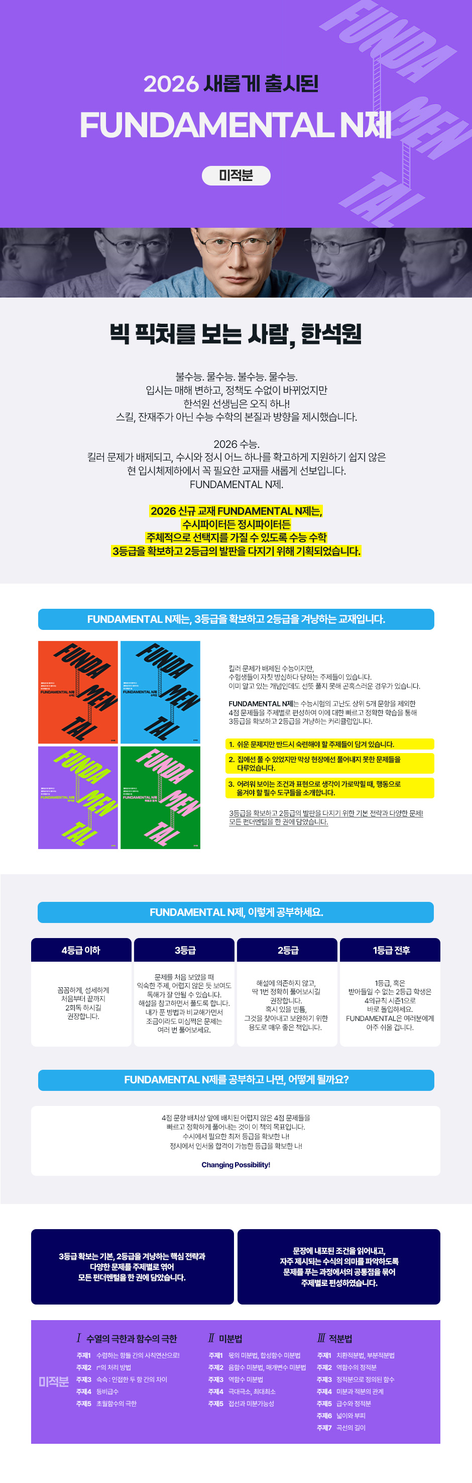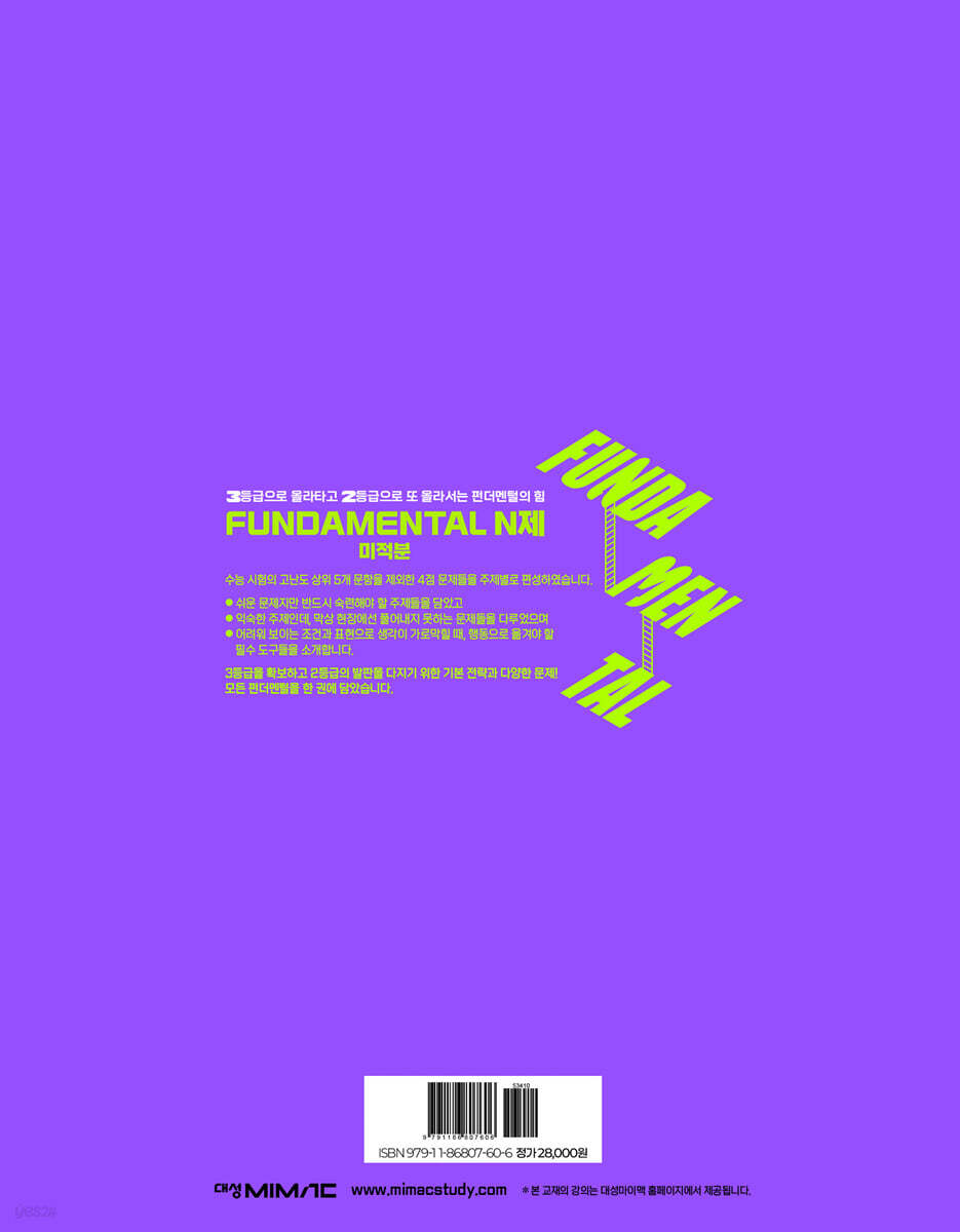[ 2026 FUNDAMENTAL N제 미적분 ]은 수능 수학의 쉬운 4점 문제들을 주제별로 편성하여 이에 대한 빠르고 정확한 학습을 통해 3등급을 확보하고 2등급을 겨냥하는 교재입니다. 킬러 문제가 배제된 수능이지만, 수험생들이 자칫 방심하다 당하는 주제들이 있습니다. 이미 알고 있는 개념인데도 선뜻 풀지 못해 곤혹스러운 경우가 있습니다. 이러한 문제점을 해소하기 위해 FUNDAMENTAL N제는, 1. 쉬운 문제지만 반드시 숙련해야 할 주제들을 담고 있습니다. 2. 집에선 풀 수 있었지만 막상 현장에선 풀어내지 못한 문제들을 다루었습니다. 3. 어려워 보이는 조건과 표현으로 생각이 가로막힐 때, 행동으로 옮겨야 할 필수 도구들을 소개합니다. [ 2026 FUNDAMENTAL N제 미적분 ]은 다음과 같이 구성되어 있습니다. 1. 3등급 확보는 기본, 2등급을 겨냥하는 핵심 전략과 다양한 문제를 주제별로 엮어 모든 펀더멘털을 한 권에 담았습니다. 2. 문장에 내포된 조건을 읽어내고, 자주 제시되는 수식의 의미를 파악하도록 문제를 푸는 과정에서의 공통점을 묶어 주제별로 편성하였습니다. FUNDAMENTAL N제, 이렇게 공부하세요 - 4등급 이하 : 꼼꼼하게, 섬세하게 처음부터 끝까지 2회독 하시길 권장합니다. - 3등급 : 문제를 처음 보았을 때 익숙한 주제, 어렵지 않은 듯 보여도 독해가 잘 안될 수 있습니다. 해설을 참고하면서 풀도록 합니다. 내가 푼 방법과 비교해 가면서 조금이라도 미심쩍은 문제는 여러 번 풀어보세요. - 2등급 : 해설지에 의존하지 않고 딱 1번 정확히 풀어보시길 권장합니다. 혹시 있을 빈틈, 그것을 찾아내고 보완하기 위한 용도로 매우 좋은 책입니다. - 1등급 전후 : 1등급, 혹은 받아들일 수 없는 2등급 학생은 4의규칙 시즌1으로 바로 돌입하세요. FUNDAMENTAL은 여러분에게 아주 쉬울 겁니다. FUNDAMENTAL N제를 공부하고 나면, 어떻게 될까요? 4점 문항 배치상 앞에 배치된 어렵지 않은 4점 문제들을 빠르고 정확하게 풀어내는 것이 이 책의 목표입니다. 수시에서 필요한 최저 등급을 확보한 나! 정시에서 인서울 합격이 가능한 등급을 확보한 나! Changing Possibility! 여러분이 그 주인공이 되세요! |