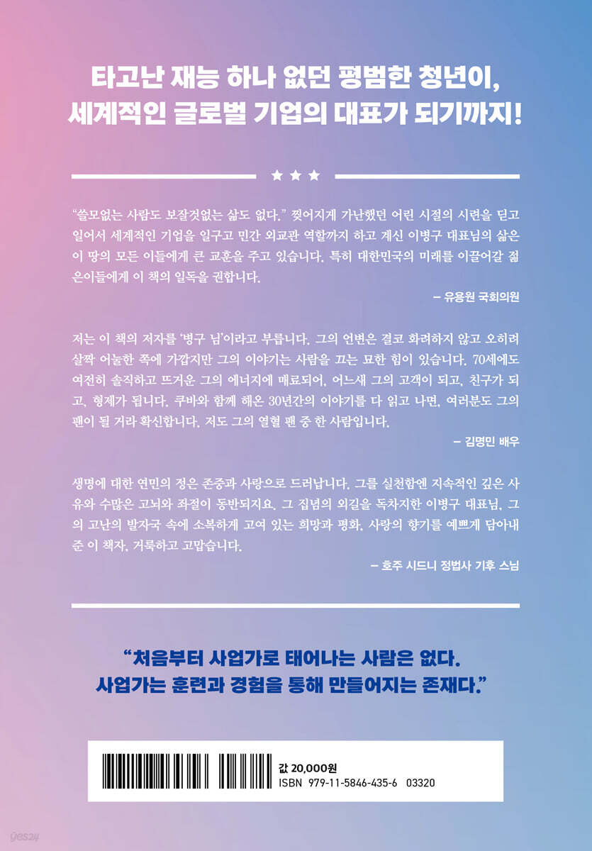 “쓸모없는 사람도 보잘것없는 삶도 없다.” 찢어지게 가난했던 어린 시절의 시련을 딛고 일어서 세계적인 기업을 일구고 민간 외교관 역할까지 하고 계신 이병구 대표님의 삶은 이 땅의 모든 이들에게 큰 교훈을 주고 있습니다. 특히 대한민국의 미래를 이끌어갈 젊은이들에게 이 책의 일독을 권합니다. - 유용원 (국회의원)