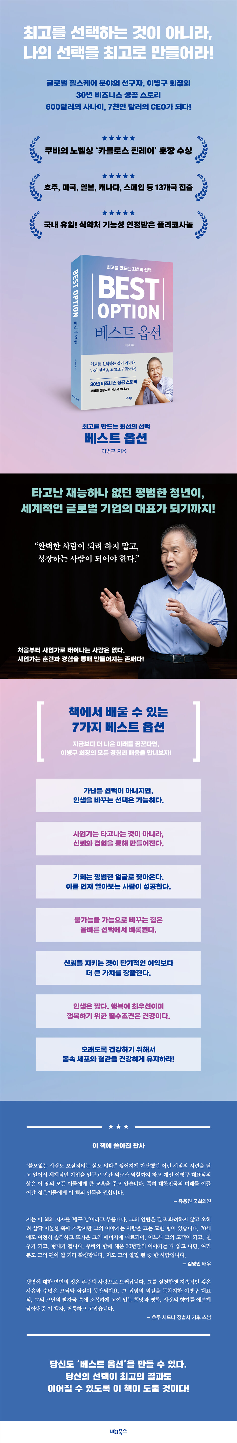세계적인 글로벌 기업의 대표가 되기까지! 글로벌 헬스케어 분야의 선구자, 이병구 회장은 인생이 크고 작은 선택의 연속임을 강조한다. 중요한 것은 처음부터 최고의 선택을 하는 것이 아니라, 내린 선택을 최고의 길로 만들어가는 과정이다. 실패와 위기를 겪으면서도 흔들리지 않았던 그의 철학은 결국 성공으로 이어졌다. 이 책은 단순한 성공담이 아니다. 수많은 위기와 난관을 넘어선 과정 속에서 배우고 성장한 그의 경험을 통해, 독자들은 기회를 포착하는 법과 불가능을 가능으로 바꾸는 힘을 얻게 될 것이다. 책에서 배울 수 있는 핵심 메시지 ▶ 가난은 선택이 아니지만, 인생을 바꾸는 선택은 가능하다. ▶ 사업가는 타고나는 것이 아니라, 신뢰와 경험을 통해 만들어진다. ▶ 기회는 평범한 얼굴로 찾아온다. 이를 먼저 알아보는 사람이 성공한다. ▶ 불가능을 가능으로 바꾸는 힘은 올바른 선택에서 비롯된다. ▶ 신뢰를 지키는 것이 단기적인 이익보다 더 큰 가치를 창출한다. ▶ 인생은 짧다. 행복이 최우선이며 행복하기 위한 필수조건은 건강이다. ▶ 오래도록 건강하기 위해서 몸속 세포와 혈관을 건강하게 유지하라! 지금보다 더 나은 미래를 꿈꾼다면, 당신도 ‘베스트 옵션’을 만들 수 있다. 당신의 선택이 최고의 결과로 이어질 수 있도록 이 책이 도울 것이다. |