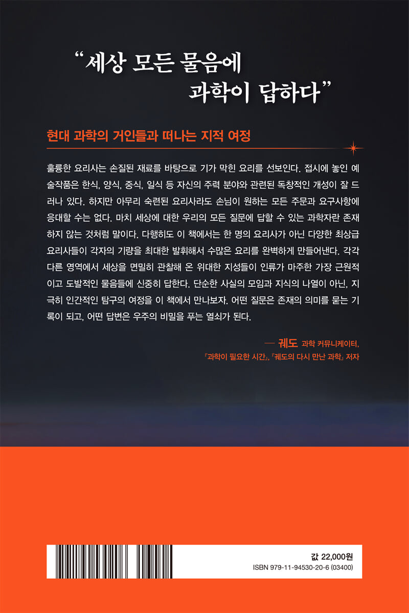 훌륭한 요리사는 손질된 재료를 바탕으로 기가 막힌 요리를 선보인다. 접시에 놓인 예술작품은 한식, 양식, 중식, 일식 등 자신의 주력 분야와 관련된 독창적인 개성이 항상 잘 드러나 있다. 하지만 아무리 숙련된 요리사라도 손님이 원하는 모든 주문과 요구사항에 응대할 수는 없다. 마치 세상에 대한 우리의 모든 질문에 답할 수 있는 과학자란 존재하지 않는 것처럼 말이다. 다행히도 이 책에서는 한 명의 요리사가 아닌 다양한 최상급 요리사들이 각자의 기량을 최대한 발휘해서 수많은 요리를 완벽하게 만들어낸다. 각각 다른 영역에서 세상을 면밀히 관찰해 온 위대한 지성들이 인류가 마주한 가장 근원적이고 도발적인 물음들에 신중히 답한다. 단순한 사실의 모임과 지식의 나열이 아닌, 지극히 인간적인 탐구의 여정을 이 책에서 만나보자. 어떤 질문은 존재의 의미를 묻는 기록이 되고, 어떤 답변은 우주의 비밀을 푸는 열쇠가 된다. - 궤도 (과학 커뮤니케이터, 『과학이 필요한 시간』, 『궤도의 과학 허세』 저자)