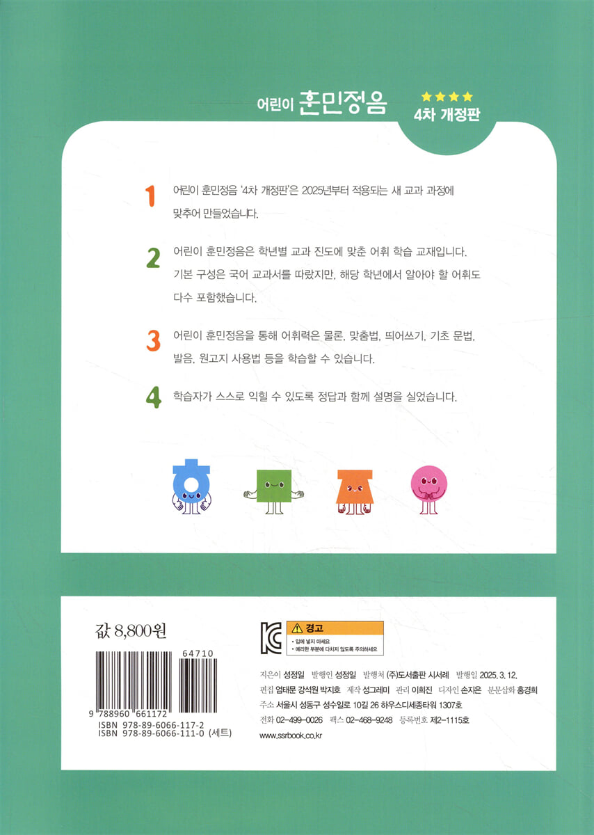 그림 보고 낱말 맞히기 / 책을 읽기 전에 질문을 만들어요 / 무슨 낱말일까요? 1. 깊이 있게 읽어요(1) - 8쪽 바다 생물 / 사이시옷 / 누구일까요? / 꾸며 주는 말 / 같은 소리, 다른 뜻 / 비슷한말 / ‘껍질’과 ‘껍데기’ / 십자말풀이 2. 깊이 있게 읽어요(2) - 18쪽 무슨 물건일까요? / 흉내 내는 말 / 무슨 낱말일까요? / 바르게 읽어요 / 무슨 뜻일까요? / 낱말 뜻풀이 / 바르게 쓰기 / 원고지 쓰기 3. 서로 다른 의견(1) - 28쪽 -용 / 토의 절차 / 꾸며 주는 말 / 다듬은 말 / 환경 보호 / 낱말 뜻풀이 / 띄어쓰기 / 십자말풀이 4. 서로 다른 의견(2) - 37쪽 포함하는 낱말 / ‘등교’와 ‘개교’ / 과학 기술 / 무슨 낱말일까요? / 같은 소리, 다른 뜻 / 국가유산 / 비슷한말, 반대말 / 원고지 쓰기 5. 자세하게 살펴요(1) - 46쪽 한식 / -적 / 비슷한말 / 반대말 / 준말 / 꾸며 주는 말 / 바르게 쓰기 6. 자세하게 살펴요(2) - 55쪽 그림 보고 낱말 맞히기 / 필기도구 / 낱말 뜻풀이 / 무슨 낱말일까요? / 포함하는 말, 포함되는 말 / 동작을 나타내는 말 / ‘자국’과 ‘자극’ / 원고지 쓰기 매체. 인터넷에서 자료를 찾아요 - 64쪽 인터넷 / 비슷한말, 반대말 / 무슨 낱말일까요? 7. 뜻을 파악하며 읽어요(1) - 68쪽 질병 / 무슨 뜻일까요? / 글자의 짜임과 국어사전에 낱말이 실리는 차례 / 복수 표준어 / 같은 소리, 다른 뜻 / ‘다르다’와 ‘틀리다’ / 바꾸어 쓰기 / 바르게 쓰기 8. 뜻을 파악하며 읽어요(2) - 77쪽 자연재해 / -스럽다 / 무슨 낱말일까요? / 비슷한말, 반대말 / 다의어 / 낱말 뜻풀이 / ‘이’와 ‘히’ / 원고지 쓰기 9. 말과 글로 전하는 생각(1) - 86쪽 그림 보고 낱말 맞히기 / 감정을 나타내는 말 / 무슨 낱말일까요? / 외국에서 들어와 쓰이는 말 / 토박이말 / 흉내 내는 말 / 비슷한말, 반대말 / 바르게 쓰기 10. 말과 글로 전하는 생각(2) - 95쪽 새 / 독서 감상문을 써요 / 꾸며 주는 말 / ‘한참’과 ‘한창’ / 날짜 세기 / 바꾸어 쓰기 / 동물의 분류 / 무슨 뜻일까요? / 원고지 쓰기 11. 경험을 표현해요(1) - 104쪽 해설 / 끝말잇기 / 흉내 내는 말 / 이어 주는 말 / 비슷한말 / 바르게 쓰기 12. 경험을 표현해요(2) - 112쪽 음식을 만들 때 쓰는 물건 / 꾸며 주는 말 / 무슨 낱말일까요? / 같은 소리, 다른 뜻 / 맛을 표현하는 말 / 수를 세는 말 / 낱말 뜻풀이 / 원고지 쓰기 ♣ 부록 / 정답과 해설 |