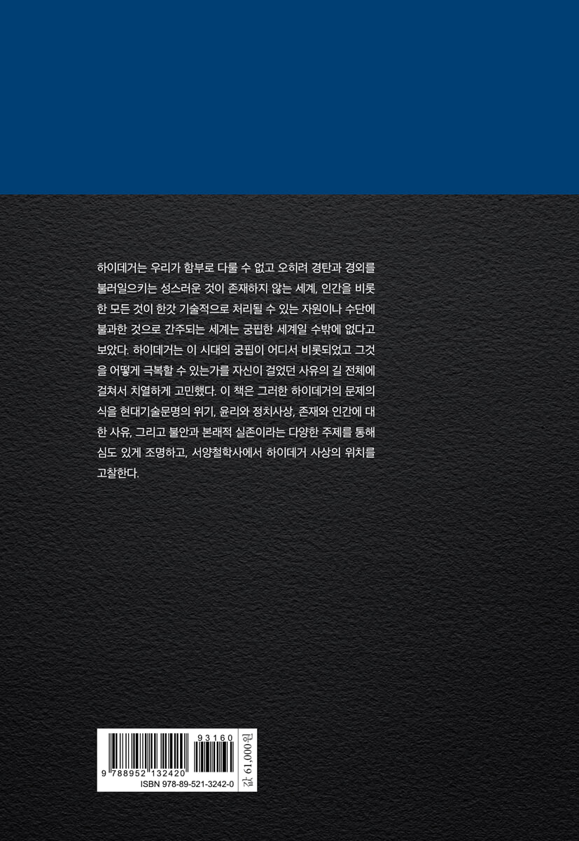 I 현대기술문명과 하이데거의 존재물음 현대기술문명의 위기와 극복 현대기술문명에 대한 청송 고형곤과 하이데거의 사상 고향상실의 극복과 하이데거의 존재물음: 「형이상학이란 무엇인가?」를 중심으로 고향상실과 인간소외: 하이데거와 마르크스의 대화 II 정치철학과 윤리학 하이데거와 나치즘 하이데거의 사상적 전회와 나치 참여: 하이데거의 정치철학 하이데거 철학과 전체주의 신칸트학파와 후설 그리고 셸러의 가치철학에 대한 하이데거의 비판 하이데거의 양심과 아리스토텔레스의 프로네시스: 『니코마코스 윤리학』의 근원적 반복으로서의 하이데거 철학 III 존재와 인간 존재에 대한 하이데거의 8가지 명제 운정 소광희 교수의 시간론 인간은 동물과 어떻게 다른가?: 동물의 존재방식에 대한 하이데거의 현상학적 분석 IV 불안과 본래적 실존 초기 하이데거의 불안 개념: 하이데거의 불안 분석은 얼마나 사태 자체를 드러내는가? 초기 하이데거의 철학을 결단주의나 주의주의로 보는 해석에 대한 비판적 고찰 키르케고르와 하이데거의 불안 개념 유식불교의 삼성설(三性說)과 하이데거의 실존방식 분석 V 하이데거와 철학자들 하이데거 철학이 서양철학사에 갖는 위치와 의의 하이데거의 플라톤 해석 헤겔과 하이데거 니체와 하이데거 후설과 하이데거의 진리 개념 후설과 후기 하이데거의 현상학: 후기 하이데거의 ‘퓌지스의 현상학’에 끼친 후설 현상학의 영향과 관련하여 포퍼와 초기 하이데거의 과학관 포퍼와 후기 하이데거의 과학관: 소크라테스 이전의 자연철학자들에 대한 양자의 견해를 중심으로 하버마스의 하이데거 해석과 비판 참고문헌 찾아보기 |