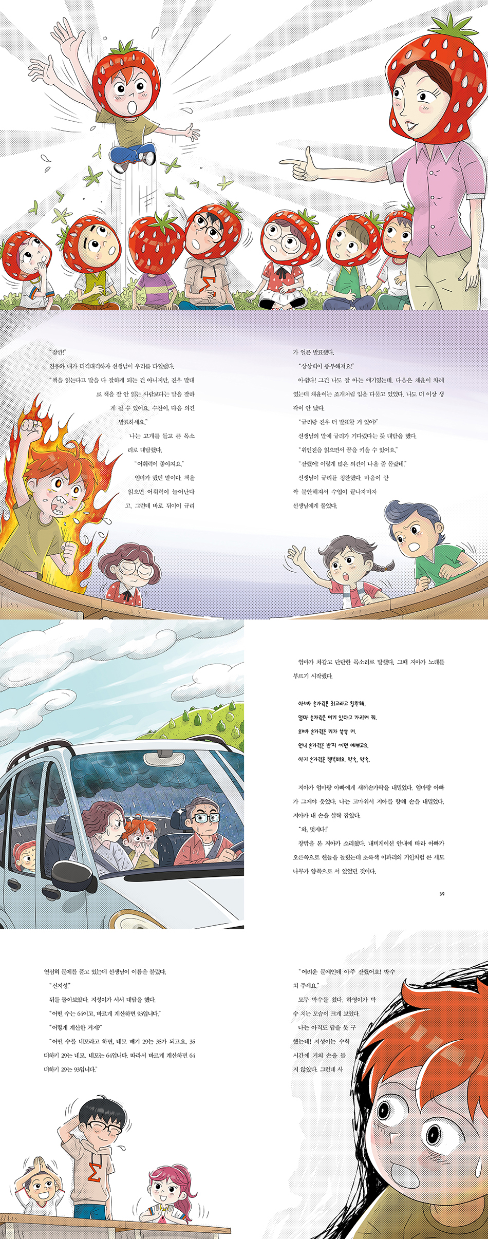 선생님이 환하게 웃으며 반겨 주었다. “제가 1등이에요? “그럼. 네가 항상 1등이잖아.” 항상 1등이라는 말이 듣기 좋아 공책을 꺼내 놓고 바르게 앉았다. 곧이어 진우가 오고 바로 뒤에 채윤이가 들어왔다. “숙제해 왔어? 나는 채윤이를 보자마자 물었다. “안 해 왔어.” “뭐? 야, 너 진짜!” 내 얼굴이 빨개지는 게 느껴졌다. 배 속까지 꿈틀거렸다. --- pp. 9-11 “난 수찬이랑 같은 팀 되는 거 싫어.” “나도 싫어!” 규리가 고개를 쌀쌀 흔들었다. “왜? 나랑 같은 팀 되면 맨날 이기잖아. 이번이 처음 진 거라고!” 나를 거부하다니! 기분이 나빠서 씩씩거렸다. “너는 너무 열심히 해서 숨 막혀.” “맞아. 감시당하는 거 같아. 숙제해 왔나 확인하고, 말도 못 하게 하잖아.” 숙제 잘해 오라고 하고 수업 시간에 떠들지 말라고 하는 게 뭐가 잘못인데? --- pp. 33-34 나는 어려운 문제라도 자신 있었다. 그래서 손을 들 준비를 단단히 했다. 선생님이 천천히 칠판에 문제를 썼다. 어떤 수에 29를 더해야 하는데 잘못해서 뺐더니 35가 되었어요. 어떤 수를 찾고, 바르게 계산한 값을 구하세요. 어? 어렵다! 나는 갑자기 멍해졌다. 심장도 빠르게 뛰었다. 고개를 돌려 뒤를 돌아보았다. 다행히 아무도 손을 들지 않았다. 열심히 문제를 풀고 있는데 선생님이 이름을 불렀다. “신지성.” 뒤를 돌아보았다. 지성이가 서서 대답을 했다. “어떤 수는 64이고, 바르게 계산하면 93입니다.” --- pp. 49-50 “이채의 관심과 사랑 덕분에 채소들이 그렇게 잘 자랐구나!” 선생님이 폭풍 칭찬을 했다. “관찰력도 좋고 색칠까지 완벽하네. 우리 다 같이 박수 쳐 주자!” 교실에 박수 소리가 가득 찼다. 이채 그림이 멋진 건 사실이지만 박수를 크게 칠 수가 없었다. 맨날 늦게 와서 1등은 한 번도 못 할 줄 알았는데 그림을 제일 먼저 그리다니! 그것도 엄청 잘 그린 그림을 말이다. 빨리만 그리려고 했던 내 그림은 완전 실패인데. 수학은 지성이한테 밀리고 그림은 이채한테 밀렸다. 뭐든 1등을 하려고 열심히 했는데……. 기운이 빠지면서 온몸이 단단하게 굳었다. 손바닥에 땀도 나고 뒷머리도 아파 왔다. --- p. 64 |