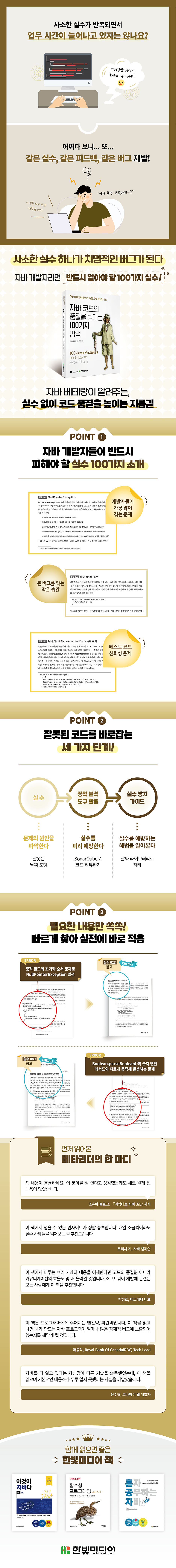 CHAPTER 1 코드 품질 관리코드 리뷰와 페어 프로그래밍코드 스타일정적 분석자동화된 테스트뮤테이션 커버리지동적 분석코드 어설션정리 CHAPTER 2 표현식실수 001 숫자 연산자 우선순위 오해실수 002 조건식의 괄호 누락실수 003 덧셈이 아닌 결합으로 작동실수 004 멀티라인 문자열 리터럴실수 005 단항 덧셈 연산자실수 006 조건 표현식의 묵시적 타입 변환실수 007 비단락 논리 연산자 사용실수 008 &&와 || 혼동실수 009 잘못된 가변 인수 호출실수 010 조건 연산자와 가변 인수 호출실수 011 반환값 무시실수 012 새롭게 생성된 객체를 사용하지 않음실수 013 잘못된 메서드를 참조하는 바인딩실수 014 메서드 참조 시 잘못된 메서드 지정정리CHAPTER 3 프로그램 구조실수 015 잘못된 if-else 연쇄실수 016 이전 조건의 다음 조건 지배실수 017 switch 문 통과 실수실수 018 구형 for 루프 오류실수 019 루프 변수 미사용실수 020 잘못된 루프 방향실수 021 루프 오버플로실수 022 멱등 루프 본문실수 023 잘못된 초기화 순서실수 024 누락된 슈퍼클래스 메서드 호출실수 025 우발적인 정적 필드 선언정리CHAPTER 4 숫자실수 026 우발적인 8진수 리터럴 사용실수 027 수치 오버플로실수 028 정수 나눗셈 중 반올림실수 029 Integer.MIN_VALUE의 절댓값실수 030 홀수 검사와 음수실수 031 확장으로 인한 정밀도 손실실수 032 무조건적인 축소 변환실수 033 16진수 음수실수 034 복합 할당의 묵시적 타입 변환실수 035 나눗셈과 복합 할당실수 036 short 타입실수 037 비트 조작 알고리즘실수 038 음수 바이트실수 039 잘못된 클램핑 순서실수 040 특수한 부동소수점 수정리CHAPTER 5 일반적인 예외실수 041 NullPointerException실수 042 IndexOutOfBoundsException실수 043 ClassCastException실수 044 StackOverflowError정리CHAPTER 6 문자열실수 045 char 값을 문자로 간주실수 046 대소문자 변환실수 047 기본 로케일에서 String.format 사용실수 048 포맷 인수 불일치실수 049 정규 표현식 대신 일반 문자열 사용실수 050 replaceAll 오용실수 051 이스케이프 시퀀스 오용실수 052 문자열의 대소문자 비교실수 053 indexOf 메서드 결과 미확인 실수 054 indexOf 인수 오용정리CHAPTER 7 객체 비교실수 055 equals 메서드 대신 참조 동등성 비교실수 056 equals()가 내용을 비교한다고 간주함실수 057 URL.equals() 사용 실수 058 스케일이 다른 BigDecimal 비교실수 059 관련 없는 타입에 equals() 사용실수 060 잘못된 equals() 구현실수 061 배열 필드 hashCode()실수 062 equals()와 hashCode() 불일치실수 063 특정 반환값에 의존하는 compare()실수 064 동일한 객체를 비교할 때 0을 반환하지 않음실수 065 뺄셈을 이용한 숫자 비교실수 066 비교 메서드가 반환하는 NaN 값 무시실수 067 비교 메서드에서 객체를 키 시퀀스로 표현하지 못함실수 068 비교자의 난수 반환정리CHAPTER 8 컬렉션과 맵실수 069 관련 없는 객체 타입 검색실수 070 단일 객체와 컬렉션 혼합실수 071 null을 허용하지 않는 컬렉션에서 null을 검색함실수 072 맵에서 null 값 사용실수 073 수정 불가 컬렉션의 수정 시도실수 074 가변 객체를 키로 사용실수 075 HashMap 및 HashSet의 등장 순서 의존실수 076 순회 도중 수정하기실수 077 List.remove() 오버로드 오용실수 078 List.remove() 직후 원소 생략실수 079 Collection.removeIf() 내부의 컬렉션 조회실수 080 Map.computeIfAbsent()의 동시 수정실수 081 이터레이터 계약 위반 정리 CHAPTER 9 라이브러리 메서드실수 082 StringBuilder 생성자에 char 전달실수 083 스트림 API 체인에서 부수 효과를 일으킴실수 084 스트림을 두 번 소비실수 085 null 사용 불가 스트림에서 null 값 사용실수 086 스트림 API 연산 계약 위반실수 087 instanceof 대신 getClass()를 사용실수 088 열거형, 어노테이션, 클래스에서 getClass()를 사용실수 089 문자열을 불리언으로 잘못 변환실수 090 잘못된 날짜 포맷실수 091 약한 참조, 부드러운 참조의 우발적 무효화실수 092 세상이 안정적이라는 가정실수 093 동시 업데이트 데이터 구조에 대한 비원자적 접근정리CHAPTER 10 유닛 테스트실수 094 assert 문의 부수 효과실수 095 잘못된 assertion 메서드 호출실수 096 잘못된 예외 테스트실수 097 테스트 메서드 조기 종료실수 098 유닛 테스트에서 AssertionError 무시하기실수 099 assertNotEquals()로 동등성 비교하기실수 100 양식이 잘못된 테스트 메서드정리APPENDIX A 정적 분석 어노테이션어노테이션 패키지어노테이션 종류 APPENDIX B 정적 분석 툴 확장Error Prone 플러그인SpotBugs 플러그인IntelliJ IDEA 플러그인 IntelliJ IDEA의 구조적 검색 및 교체 기능