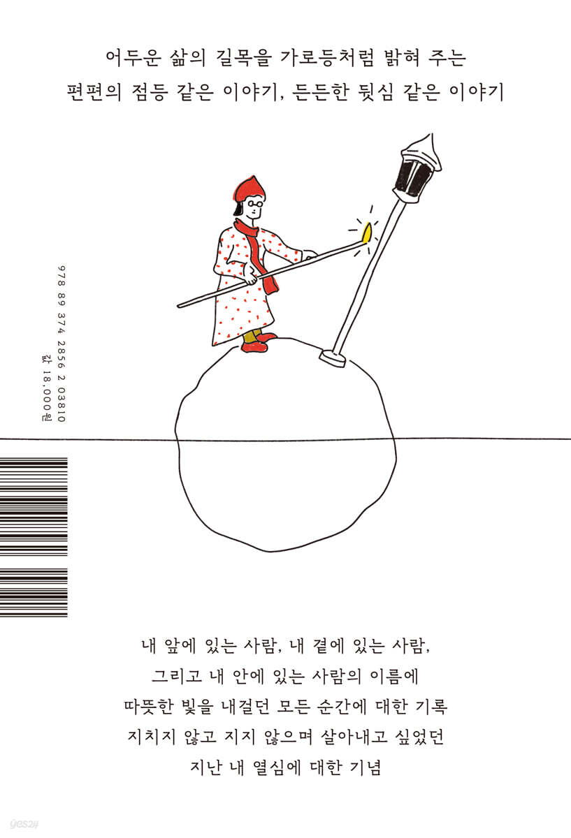 묶어 놓고 보니 어릴 적 동화책에서 읽었던 ‘점등인’이라는 단어가 떠올랐다. 우리에게 익숙하지 않아 사전적 의미만으로는 다 그려지지 않는, 여분의 상상력을 불러일으키던 단어다. 정확하게는 ‘가로등 점등인’, 다르게는 ‘가로등지기’, 석유나 가스를 이용해 거리를 밝히는 가로등에 저녁에는 점등을, 아침에는 소등을 했던 사람을 일컫는다. 여기 묶인 글들은 내 삶이 어둠에 잠기지 않도록 삶의 길목들에서 가로등처럼 환한 불이 되었던 편편의 점등과도 같았다. 내 앞에 있는 사람, 내 곁에 있는 사람, 그리고 내 안에 있는 사람, 그들의 이름에 따뜻한 빛을 내걸던 순간들에 대한 기록인 셈이다. 내가 모방하고 인용하고 표절하며 살았던 가족들, 그러니까 내 시작과 끝 혹은 내 둘레와 바탕에 대한 기억이기도 할 것이다. 기다리며 지키고, 견뎌 내며 버티고, 지치지 않고 지지 않으려, 그렇게 살고 싶었던 내 삶에 대한 기념이라고나 할까.” --- 「서문」 중에서 한 선배네 ‘인생재난 방재대책 훈련요강’의 그 세칙 조항들은 이렇다. 그 일(一), 주머니에 손 넣고 걷지 말라. 이거 중요하다. 일생을 좀 살다 보면 알게 된다. 낙법(落法)에 도통할수록 인생이 안전해진다는 걸. 낙법의 가장 손쉬운 방법이 손을 이용하는 것. 손이 바닥을 먼저 짚는 한, 최소한 머리는 안전한 법. 그 일(一), 엘리베이터 탈 때 바닥을 확인하라. 인생은 자주 상승하고 하강한다. 살다 보면 상승하고 하강하는 고속의 엘리베이터를 탈 때가 있는 법이다. 상승이든 하강이든 바닥이 있는지를 확인하고 타야 안전하다. 자칫 바닥 모를 나락으로 추락하지 않으려면 말이다. 그 일(一), 건널목을 건널 때는 가운데 서라. 뭐, 꼭, 조사해 보지는 않았지만, 건널목 사고의 8할은 맨 앞이나 맨 뒤에서 일어나기 마련이다. 언제, 어디서, 그 어떤 불행이 인생에 덮쳐올지 모르는 일. ‘가만 있으면 가운데는 간다’라는 말이 괜히 있겠는가. 이 세칙 조항들을 삶이라는 인생길에 비유해 보자면 그것들은 각각 삶의 방관자가 되지 말고, 성공할 때 실패를 준비하고, 너무 앞서거나 너무 뒤서지 말라는 자못 교훈적인 의미를 담고 있다. 학원과 학교와 학벌과 학연으로 세워진 사각의 링 위에서 옴짝달싹 못 하는, 갈팡질팡하다 내 그럴 줄 알고도 남음 직한 대한민국 교육 시스템에 시달리는 우리 아이들을 향한 ‘인생재난 방지대책 훈련요강’ 수칙을 나도 이렇게 쿠키에 빗대어 수정해 본다. 그 일(一), 눅눅한 쿠키는 부드럽다. 그 일(一), 쿠키 맛은 재료와 요리법에 따라 무한하다. 그 일(一), 쿠키 아니어도 맛있는 건 많다. 모든 쿠키가 바삭해야만 하는 건 아니다. 또 모두가 쿠키를 먹어야 하는 것은 아니다. 그것도 한 가지 쿠키나 갓 구운 쿠키만을 먹어야 하는 것은 더더욱. 아이들에게 시험 성적과 대학 서열과 연봉으로 구워 낸 쿠키만 대수겠는가? --- pp.24쪽-25 저녁 귀가 후 집 청소를 하는데 소파에서 툭, 하니 아버지 시계가 떨어졌다. 20여 년 전 둘째 오빠가 선물해 드렸던 회사 로고가 새겨진 금장 도색의 오리엔트 손목시계였다. 모서리마다 이미 금도금이 벗겨져 있었다. 그런데, 세 개의 바늘이 1시와 39분과 28초를 가리킨 채 멈춰 있었다. 순간 가슴이 철렁했다. 아버지에게 손목시계는 장식품에 불과했던 게다. 아버지는 갑자기 무슨 생각으로 막내딸 집을 방문한 것이며, 아버지의 시계는 언제부터 멈춰 있었던 걸까. 도대체 언제부터 아버지 삶에서 시간은 의미가 없어져 버린 걸까. 그러니 아버지는 언제부터 이 삶에서 시간의 경계를 훌쩍 넘어 버리셨던 걸까. 그냥 둬라. 시계를 가져다드리겠다고 전화했을 때 아무렇지도 않은 듯 툭 던지셨던 아버지의 말이었다. 이젠 장식으로도 귀찮으시다는 걸까. 이튿날 시계방에 달려가 건전지를 갈아 끼워 봤으나 세 개의 시곗바늘은 여전히 움직이지 않았다. 이 시계 꼭 고쳐 주세요. 고치는 값이 더 든다고 시큰둥해하는 시계방 주인에게 낡고 낡은 아버지의 시계를 맡기고 나오는데 또 가슴이 먹먹했다. 사진 속 아버지는 양 품에 어린 손주들을 안고 한껏 웃고 계시는데, 유품으로 남겨진 아버지의 오리엔트 손목시계는 다시 숨 가쁘게 제 시간을 달리고 있는데……. --- pp.52-53 명령이라서 거절하지 못했고 부탁이라서 거절하지 못했다. 제안이고 약속이라서 거절하지 못했고, 연대고 고백이라서 거절하지 못했다. 아니다. 거절을 못 했던 진짜 이유는 그것들이 다 일종의 거래였기 때문이었을 것이다. 거절하지 못한 내가 이후에 상대에게 다시 명령하고 부탁하고 제안하기 위해서였을 것이고, 또다시 약속하고 연대하고 고백하기 위해서였을 것이다. 거절해야 할 때 거절하지 못하는 건 바라는 게 있기 때문이다. 그러니 거절하는 게 거래 혹은 권력으로부터의 자유이고, 거절할 수 있다는 게 또 다른 자유이자 권력이라는 걸 알게 된 건 또 언제였을까. 거절해야 할 때 거절하는 것이 선물이다. 따뜻하되 냉정하고 부드럽되 단호한 거절, 숙고하되 여지가 없는 거절, 마음을 담은 그런 거절은 거절하는 자를 깨끗하게 하지만 더 나아가 상대의 깨끗한 단념을 부른다. 지지부진한, 마지못한, 어