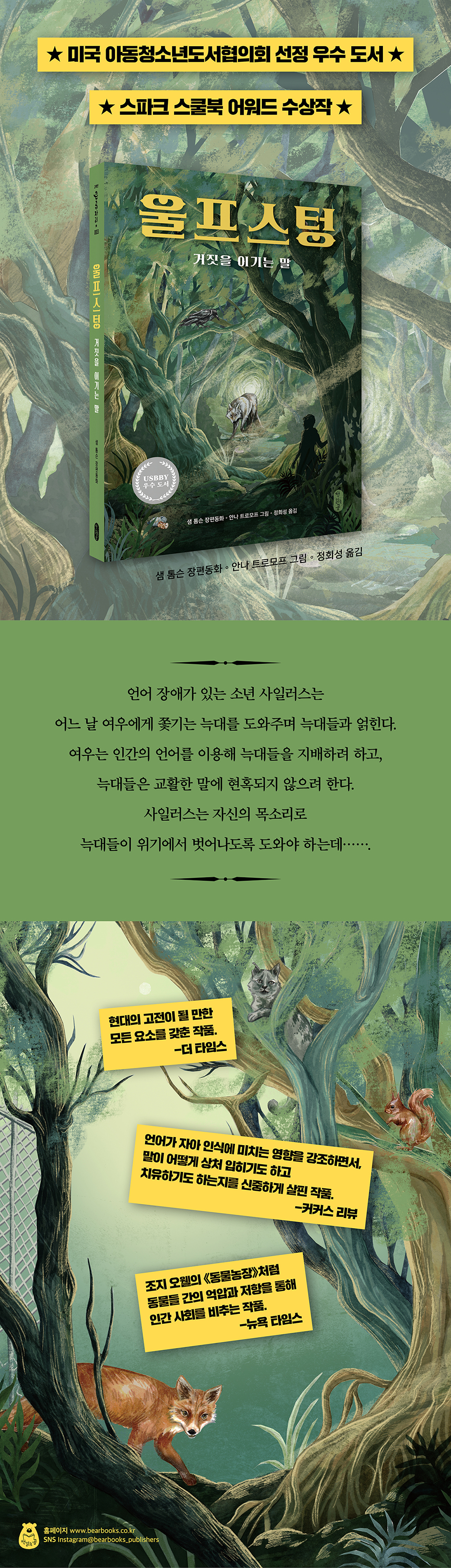 ★ 스파크 스쿨북 어워드 수상작 ★ 느린 아이 사일러스, 모험 속으로 뛰어들다 《울프스텅: 거짓을 이기는 말》은 어디에나 있음 직한 현실 공간과 그것과 극적으로 대비되는 환상 세계를 넘나드는 판타지 동화다. 현실에서 사일러스는 말더듬증 때문에 괴롭힘을 당하는 소심한 소년이다. 제 이름조차 제대로 말하지 못하는 사일러스를 학교의 악당들은 ‘사일런트 사일런스(Silent Silence)’라고 부르며 괴롭히고, 사일러스는 더욱더 ‘침묵’ 속으로 숨어든다. 어느 날 하굣길, 아무도 없는 자전거 길을 홀로 걷던 사일러스 앞에, 거대한 늑대 한 마리가 나타난다. 숲에서 마지막으로 살아남은 두 마리 늑대 중 수컷인 아이센그림이다. 현실에서 늘 수동적이었던 사일러스는 아이센그림과의 예기치 않은 만남으로 인해, 매 순간 스스로 결단하고 행동해야 살아남을 수 있는 역동적인 세계로 건너간다. 학교에서는 투명 인간처럼 굴고 집에서는 ‘느린 아이’라는 딱지를 단 채 부모의 걱정을 샀지만, 이제 더는 머뭇거릴 틈이 없다. 독재자 레이너드 일당과 맞서려면 지금 당장 행동해야 한다. 사일러스는 늑대 등에 매달려 바람처럼 달리고, 가파른 언덕을 데굴데굴 구르고, 칠흑처럼 캄캄한 동굴 속을 작은 벌레처럼 꿈틀꿈틀 기고, 땅속 깊이 굽이굽이 뻗은 지하 도시 어스를 종횡무진한다. 제 목숨을 지키기 위해서, 절멸 위기에 몰린 늑대 가족을 구하기 위해서, 그리고 독재자 레이너드에게 빼앗긴 자유와 정의를 되찾기 위해서. 빼앗긴 자유를 되찾기 위한 싸움 사일러스의 모험은 신나고 즐겁기는커녕 시종일관 고난의 연속이고 걸핏하면 위기에 빠진다. 판타지 공간에서도 사일러스는 말더듬증으로 괴로워하고, 심지어는 레이너드의 사탕발림에 속아서 새끼 늑대들을 빼앗기기까지 한다. 이후 이야기는 레이너드가 새로운 노예 계급으로 개조하려 끌고 간 새끼 늑대들을 되찾기 위한 험난한 여정으로 이어진다. 사일러스와 아이센그림과 허센트는 얼룩 고양이 ‘티볼트’, 큰까마귀 ‘코랙스’, 도망자 여우 ‘토드’를 동지로 규합해 어스로 잠입한다. 가히 ‘어벤저스’라고 불러도 좋을 사일러스 일행은 온갖 우여곡절을 겪으며 새끼 늑대들이 갇힌 수용소에 다다르고, 마침내 레이너드 일당과 목숨을 건 싸움을 벌인다. 사일러스가 불완전하고 약한 아이인 데 반해, 레이너드는 놀랍도록 능수능란하고 강인한 캐릭터다. 레이너드는 인간에게서 배운 말과 탁월한 웅변술을 이용해 숲의 지배자가 된 뒤, 땅속 깊은 곳에 지하 도시 어스를 건설한다. 어스는 강력한 계급 사회이자 통제 사회다. 지표면 가까이에는 가난한 여우들이 사는 쪽방이 즐비하고, 땅속으로 내려갈수록 더 부유하고 더 큰 권력을 쥔 여우들이 사는 고급 주거지가 조성되어 있다. ‘빨간 스카프’라고 불리는 경비대가 온종일 도시 구석구석을 감시하고, ‘하얀 스카프’라는 친위대가 레이너드를 그림자처럼 경호한다. 사일러스와 동료들은 표면적으로는 새끼 늑대들을 구하기 위해 어스에 잠입하지만, 궁극적으로는 레이너드의 독재를 무너트리고 자유를 되찾기 위해 싸운다. 말의 힘, 말의 무게 이 모험담의 하이라이트는 말더듬증 사일러스와 교묘한 달변가 레이너드가 원형 극장에서 설전을 벌이는 장면이다. 이 싸움에서 지면, 사일러스는 새끼 늑대들을 되찾지 못할뿐더러 살아서 집으로 돌아갈 수도 없다. 어스에 사는 여우란 여우는 다 몰려와서 와글와글 떠드는 북새통 속에서 레이너드가 목청을 높여 외친다. “너, 인간의 아이 사일러스! 너는 늑대들과 엉뚱한 모험을 벌이면서 스스로 자유의 편에 서 있다고 생각했지? 독재의 굴레에서 벗어나려는 용감한 동물들을 돕는다고 믿었지? 웃기지 마. 인간이야말로 독재자야. 우리 같은 동물은 노예고. 하지만 나는 너희 인간으로부터 자유를 쟁취할 거야.”(본문 222쪽) 레이너드는 인간들이 저지른 범죄에 대한 죗값으로 사일러스에게 사형을 선고한다. 언뜻 논리적인 흠결이라고는 없어 보이는 레이너드의 공세 앞에서 사일러스는 말문이 막힌다. 무릎을 꿇고 눈을 꼭 감은 채 한참 동안 침묵에 잠겨 있던 사일러스가 천천히 입을 연다. 목구멍 속에 갇혀 있던 사일러스 자신의 이야기가 밖으로 터져 나오면서 마침내 반전이 시작된다. 말은 거짓을 퍼트리고 자유를 억압하는 위험한 것이면서, 반대로 거짓을 물리치고 자유를 지키는 무기가 되기도 한다. 저자 샘 톰슨은 말 때문에 고초를 겪는 주인공 사일러스를 내세워, 독자에게 말의 힘과 무게에 대해서 생각해 보게 만든다. 나아가 빛이 될 수도 있고 어둠이 될 수도 있는 말을 어떻게 잘 쓸 것인지 고민해 보게 한다. 다시, 새로운 길 위에서 이 이야기는 길 위에서 시작해서 길 위에서 끝난다. 사일러스와 아이센그림이 자전거 길에서 만나 이야기가 시작되었듯, 사일러스와 늑대 가족이 각자 제 갈 길로 흩어지면서 이야기가 마무리된다. 환상의 세계에서 ‘울프스텅’으로 거듭난 뒤 집으로 돌아온 사일러스 앞에는 이전과 조금도 달라지지 않은 현실이 기다린다. 사일러스는 여전히 말을 더듬고, 학교의 악당들은 변함없이 사일