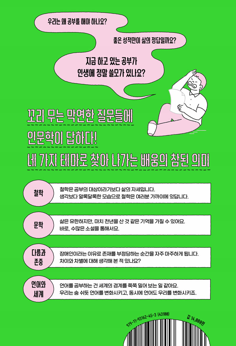 철학자, 소설가, 사회적기업가, 언어학자가 전하는 ‘나의 공부 이야기’ 하루하루 유한한 시간 속에서 해야 할 공부는 도무지 줄어들지 않는다. 목표한 성적권에 안착하면, 원하는 대학 진학에 가까워지면, 그때는 비로소 안도할 수 있을까? 만약 이도 저도 안 되면 어쩌지? 시간에 쫓길 수밖에 없는 현실이지만 공허함이 커질 때도 많다. 모두가 모두의 경쟁자라는 치열한 입시 레이스를 하루빨리 냉철하게 자각해야 하기 때문일까. 아니면, 사실 공부에 별 관심이 없고 뭘 해야 할지 애매한데 어른들의 조언과 잔소리 때문에 꾸역꾸역 숙제하고 문제를 풀고 있는 걸까. “사실 공부는 쉽지 않다. 그러나 어렵지도 않다.” 이 명백한 아이러니 때문에 대부분이 갈피를 잡지 못하고 지내는 듯하다. 그렇다면 문장을 살짝 바꿔 보자. “사실 공부는 재미있지 않다. 그러나 재미가 없는 것도 아니다.” 역시 명백한 아이러니다. 결국 사람과 상황에 따라 지극히 상대적이고 개인적일 수밖에 없는 ‘공부’의 정의인데, 너무나 절대적인 하나의 가치로 뭉뚱그려져 우리를 압도한다. ‘어떻게’ 공부해야 하는지, ‘왜’ 공부해야 하는지, 방법과 방향을 제시해 주는 좋은 정보가 가득하지만 ‘나’와 ‘성적’ 사이의 실질적 케미는 가까운 듯 멀게만 느껴지는 현실. 이런 내가, 삶에 꼭 필요한 배움을, 공부에서 찾을 수 있을까? 과연? 『공부가 인생에 무슨 쓸모인지 묻는다면?』는 인문학 테마를 통해 ‘살아가면서 꼭 공부해야 할 한 가지’를 이야기하는 책이다. 정치철학자 이진민, 소설가 하성란, 사회적기업가이자 사회복지사 백정연, 언어학자 김미소 네 명의 저자가 각자의 이야기를 전하며 살아가는 데 필요한 나만의 배움을 진솔하고 흥미롭게 털어놓는다. 바쁜 이들을 위해 먼저 말하자면, 성적에 즉각적 효과를 보일 책은 아닐 수 있다. 대체 공부가 뭐고 무슨 쓸모가 있는지 찾아가는 과정이 쉽고 빠를 리 없으니 말이다. 그런 의미에서 책의 부제에 쓰여 있는 ‘인문학’을 가깝게 들여다보면 어떨까. 인간의, 인간에 의한, 인간을 위한 학문인 인문학이야말로 가장 일상적인 배움이다. 우리는 AI가 아닌 인간이다. 가족과 친구, 이웃도 (아직까진 거의 다) 인간이고, 인간이 발견하고 망쳐놓고 다시 세우고자 애쓰는 세상에서 우리 모두 살아가고 있다. 그러니 인간을 이해하지 않고 내일을 살아갈 수 있을까? 겉모습이 다른 사람에게 혐오감부터 생길 때, 나보다 잘난 사람에게 시기와 미움이 앞설 때, 굳이 소설이나 시를 찾아 읽는지 이해되지 않을 때, 번역기가 해결해 주는데 왜 언어 공부를 해야 하나 싶을 때…… 내가 보고 듣고 생각하는 것이 세상의 전부가 아니라는 자기 인식을 할 수 있어야 한다. 주변을 잘 살피고, 생의 희로애락을 두루 경험하고, 나와 우리 바깥의 또 다른 세계를 호의적으로 받아들이는 마음은 세상을 공부하는 태도에서 시작된다. 『공부가 인생에 무슨 쓸모인지 묻는다면?』을 통해 공부의 의미가 다양하고 많다는 사실을 새롭고 궁금하게 느끼길 바란다. 본문 시작 전 ‘체크리스트’와 ‘공부의 기초 다지기’를 통해 각 테마의 문을 열고, 본문 뒤에는 ‘책, 읽어 보기를 추천해!’ 코너를 통해 각각의 저자가 독자들을 위해 엄선한 도서 리스트를 소개한다. 이 한 권의 책을 읽는 시간이 여러분 삶에 쓸모없지만은 않을 것임을, 자신 있게 추천한다. 철학 - 문학 - 다름과 존중(장애) - 언어와 세계 내 삶에 필요한 한 가지를 찾아가는 인문학 수업을 시작합니다! 1부 ‘철학, 내 삶의 101: 나를 돌보고 세상을 읽는 일’에서는 정치철학자 이진민의 이야기를 만난다. 이진민 저자는 한국과 미국에서 정치철학을 공부했고, 지금은 독일 시골 마을에서 책을 읽고 글을 쓰며 강의를 하고 있다. “돈이나 와이파이처럼 이게 없으면 죽을 것 같”지도 않고 “냉면이나 떡볶이처럼” 최애 음식도 아닌데 사는 데 중요한, 아니 심지어 꼭 필요한 한 가지로 철학을 꼽다니! 이에 이진민 저자는 “철학의 쓸모는 바로 쓸모를 질문하는 그 태도에 있다.”(본문 14쪽)라고 전한다. 살다 보면 우리는 생각보다 다양한 모양과 모습으로 우리 가까이에 있는 철학을 만나게 된다. 교실 안에도, 좋아하는 노랫말 속에도, 유명하다는 영화에도 철학이 담겨 있다. 저자는 우리가 “기본적으로 뭘 잘 모르는 존재”이고 “나를 둘러싼 이 세상만 잘 모르는 게 아니라, 내 안에도 모르는 것투성이”라고 말한다. 그리고 이는 빠르게 바뀌는 세상 속에서 당연한 이치이다. 그렇다면 우리 삶에 철학이 필요한 진짜 이유가 뭔지, 저자의 유쾌한 조언을 놓치지 말자. 2부 ‘소설과 이야기: 천년을 산 것처럼’에서는 소설가 하성란의 이야기가 이어진다. 하성란 저자는 글을 시작하며, 30년 가까이 소설을 써 왔지만 자신을 소개하는 상황 앞에 늘 부끄러워진다고 고백한다. 저자가 조심스레 건네준 문장은 ‘보고 듣는 사람’. “보고 듣는 일은 생각보다 힘이 듭니다. ‘차마 눈 뜨고 볼 수 없는’ 광경 앞에서 우리는 눈을 감고 외면하기 쉽습니다. 그것을 보기 위해서는 의지는 물론 애정이 필요합니다. 듣는 일도 마찬가