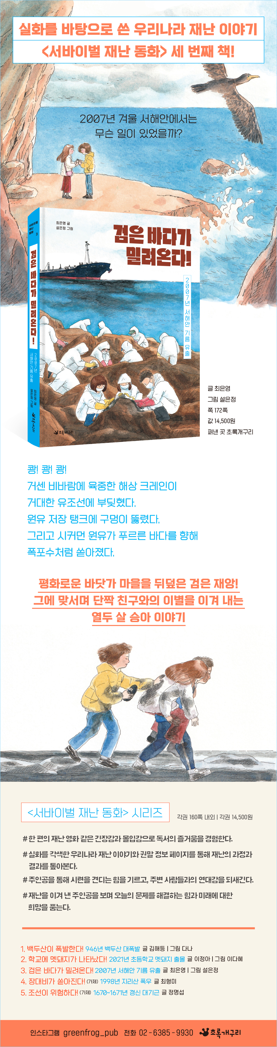 2007년 겨울 서해안에서는 무슨 일이 있었을까?2007년 12월 7일 오전 7시 6분, 충청남도 태안 앞바다에서 삼성중공업 해상 크레인이 홍콩 유조선 허베이스피릿호를 들이받았다. 예인선 두 척이 해상 크레인에 와이어를 연결해 인천에서 경상남도 거제로 끌고 가던 중, 예인선 한 척의 와이어가 높은 파도의 힘을 이기지 못하고 끊어지자 해상 크레인이 파도에 떠밀려 가까운 곳에 정박 중이던 유조선에 부딪힌 것이다. 아홉 차례의 충돌로 유조선의 원유 저장 탱크에 세 개의 구멍이 뚫렸고, 이를 통해 원유 1만 2,547킬로리터가 쏟아져 나왔다. 이는 국내에서 일어났던 최악의 해양 오염 사고이자 환경 재난이다. 또한 이후의 대처 과정은 전국에서 모여든 수많은 자원봉사자들의 헌신이 빛났던, 아름다운 재난 극복 사례로 꼽히기도 한다. 이 책은 이러한 사실을 바탕으로 열두 살 승아, 연재, 강치의 우정과 성장을 그려 냈다.평화로운 마을을 뒤덮은 재앙에 맞서며 단짝과의 이별을 이겨 내다승아와 연재는 태안 의항리에서 나고 자란 단짝 친구이다. 그런데 연재는 이사를 앞두고 있다. 심장병을 치료하기 위해서이다. 단짝을 떠나보내는 일은 승아에게 하늘이 무너지는 것 같은 아픔이지만, 친구와의 멋진 이별을 위해 애써 마음을 다잡는다. 그럴수록 곁에서 깐족거리는 강치가 눈엣가시 같다.그런데 승아가 사는 마을에 더 큰 재앙이 덮친다. 바다에서 원유 유출 사고가 일어난 것이다. 승아의 부모님은 물론, 대부분의 이웃이 굴과 전복을 키우며 살아가는 터라, 앞바다와 갯벌까지 밀려든 기름띠에 온 동네 사람들은 망연자실한다. 지독한 기름 냄새에 연재가 쓰러지고, 승아는 준비도 못 한 채 이른 작별을 하고 만다. 가슴이 아리지만, 승아는 친구의 건강을 기원하며 마음을 단단히 먹는다. 그리고 기름으로 뒤덮인 바다를 위해 자신이 할 수 있는 일을 찾는다. 어른들끼리만 방제 작업을 하려고 하지만, 승아는 “나도 의항리 주민”이라고 외치며 강치와 함께 나선다. 겉돌기만 하던 강치의 새로운 모습을 발견하고 마음을 열며 새로운 우정으로 한 발 내딛는다. 실제로도 그랬듯, 이 이야기는 해피엔딩이다. 서해안 기름 유출 사고를 중심으로 한 다양한 토론거리들〈서바이벌 재난 동화〉 시리즈는 각 재난에 대해 더욱 깊이 알아볼 수 있도록, 이야기 뒤에 관련 정보를 담은 ‘서바이벌 재난 이야기’를 실었다. 이 책에는 ‘삼성-허베이스피릿호 원유 유출 사고’를 키워드로 토론할 수 있는 거리를 담았다. 먼저 2007년 12월 7일에 어떤 과정을 거쳐 원유 유출 사고가 일어났는지 알아보고, 그것이 환경 및 주민들에게 미친 피해를 알아본다. 또한 이러한 사고가 왜 일어났는지도 살펴본다. 그래야 또 다른 재난을 예방할 수 있기 때문이다. 더불어 사고 이후 예전 모습으로 되돌리기 위해 어떠한 노력을 기울였는지 보여 주며, 재난을 이겨 내는 하나의 큰 축은 서로 돕는 연대 의식임을 일깨운다.▶ 〈서바이벌 재난 동화〉 시리즈 소개√ 한 편의 재난 영화 같은 긴장감과 몰입감으로 독서의 즐거움을 경험한다.√ 실화를 각색한 우리나라 재난 이야기와 권말 정보 페이지를 통해 재난의 과정과 결과를 톺아본다.√ 주인공을 통해 시련을 견디는 힘을 기르고, 주변 사람들과의 연대감을 되새긴다.√ 재난을 이겨 낸 주인공을 보며 오늘의 문제를 해결하는 힘과 미래에 대한 희망을 품는다.교과 연계 3-2 사회│환경에 따라 다른 삶의 모습4-2 국어-가│이야기 속 세상5-1 사회│국토와 우리 생활