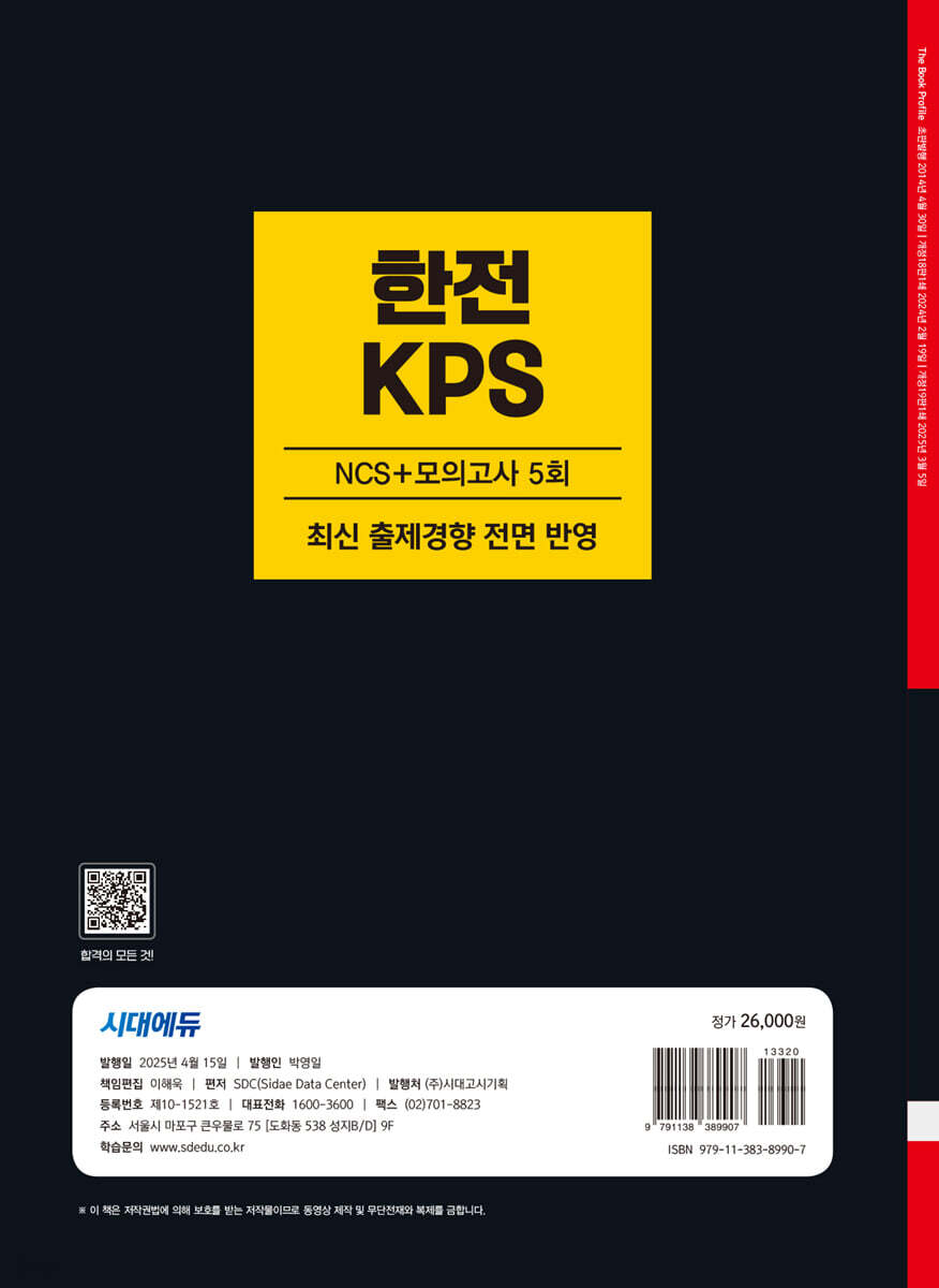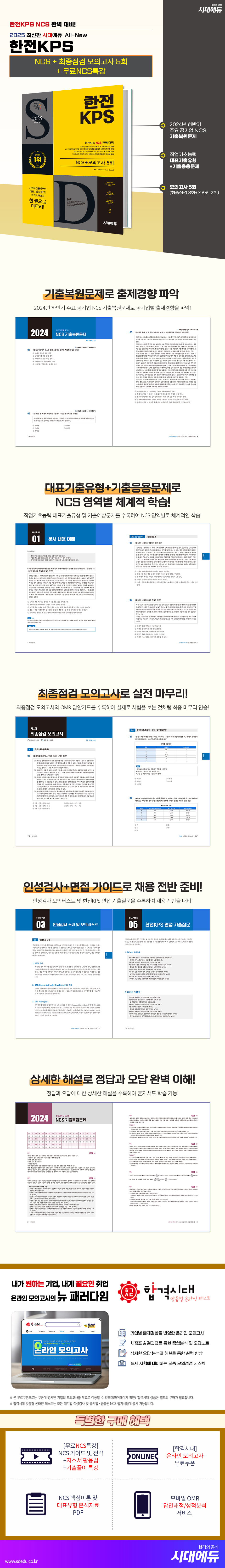 한전KPS 합격을 위해 시대에듀에서는『2025 최신판 시대에듀 All-New 한전KPS NCS+최종점검 모의고사 5회+무료NCS특강』을 출간하였다. 2024년 하반기 주요 공기업 NCS 기출복원문제를 수록하여 공기업별 필기시험의 전반적인 유형과 경향을 파악할 수 있도록 하였으며, 직업기초능력 대표기출유형 및 기출응용문제를 수록하여 필기시험에 완벽히 대비할 수 있도록 하였다. 또한, 철저한 분석을 통해 실제 유형과 유사한 최종점검 모의고사를 수록하여 자신의 실력을 최종 점검할 수 있도록 하였으며, 한전KPS 채용 가이드와 면접 기출질문을 수록하여 채용을 준비하는 데 부족함이 없도록 하였다. |