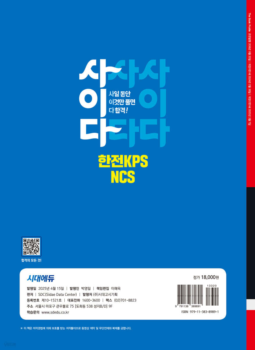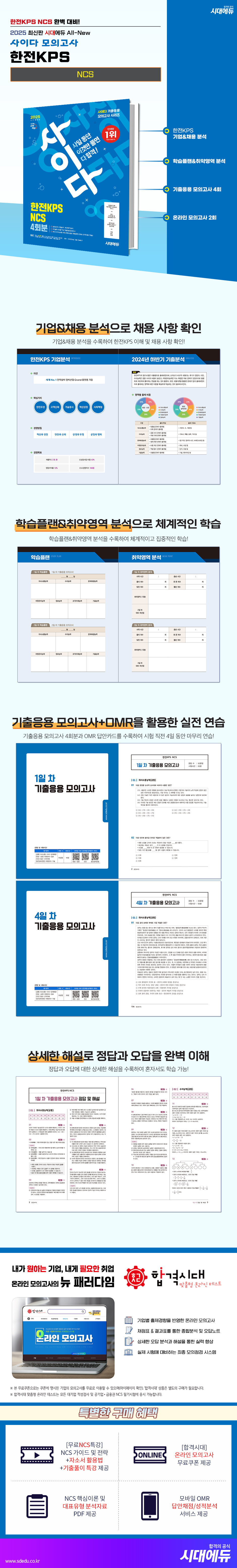 한전KPS 합격을 위해 시대에듀에서는 채용을 대비하여 한전KPS 맞춤형 문제로 구성한 『2025 최신판 시대에듀 All-New 사이다 모의고사 한전KPS NCS』을 출간하였다. 상세한 해설로 혼자서도 학습이 가능하도록 하였으며, 온라인 모의고사를 무료로 응시할 수 있는 쿠폰을 발급하여 한전KPS 문제 유형에 대한 연습과 함께 자신의 실력을 점검할 수 있도록 하였다. |